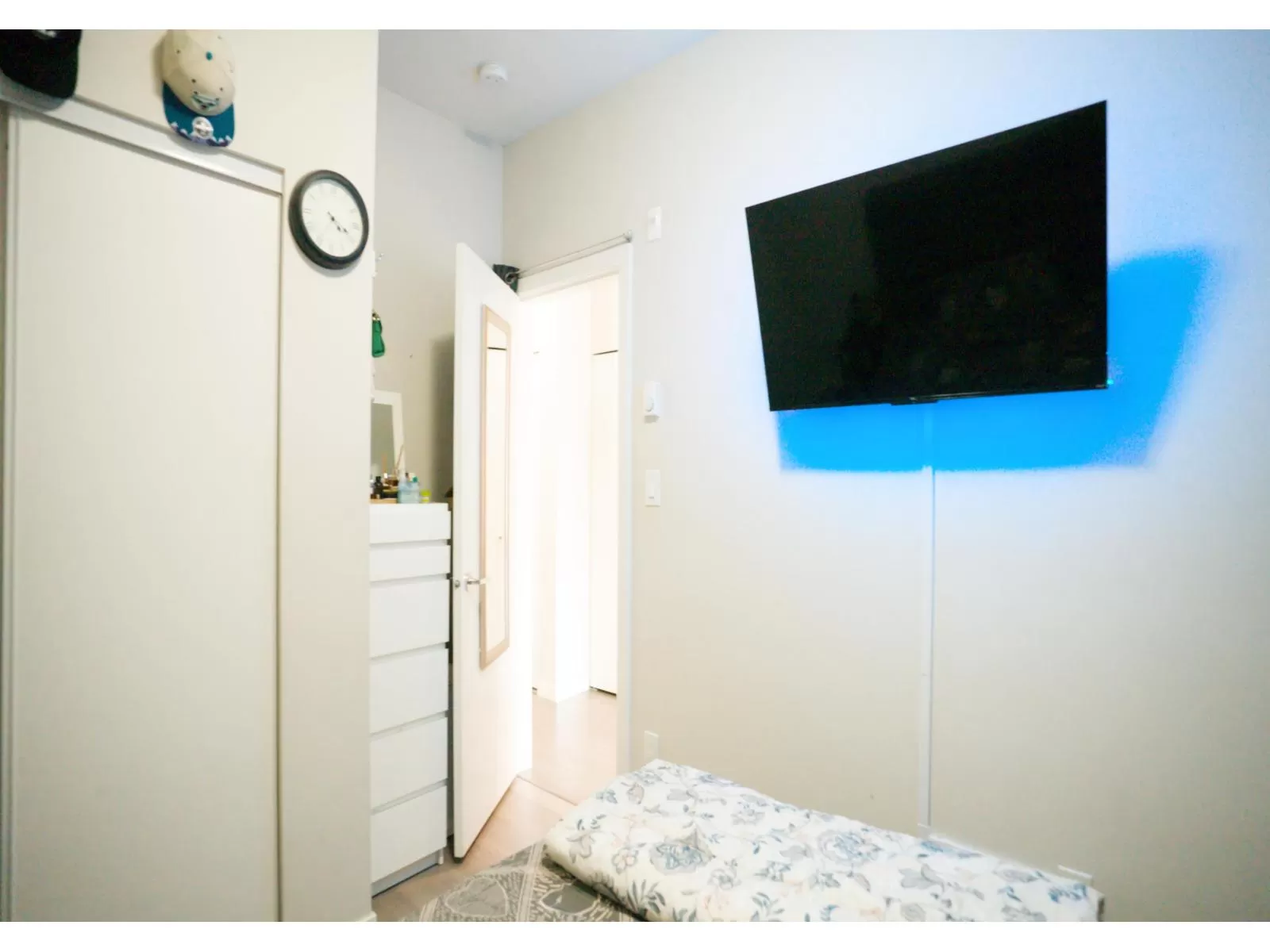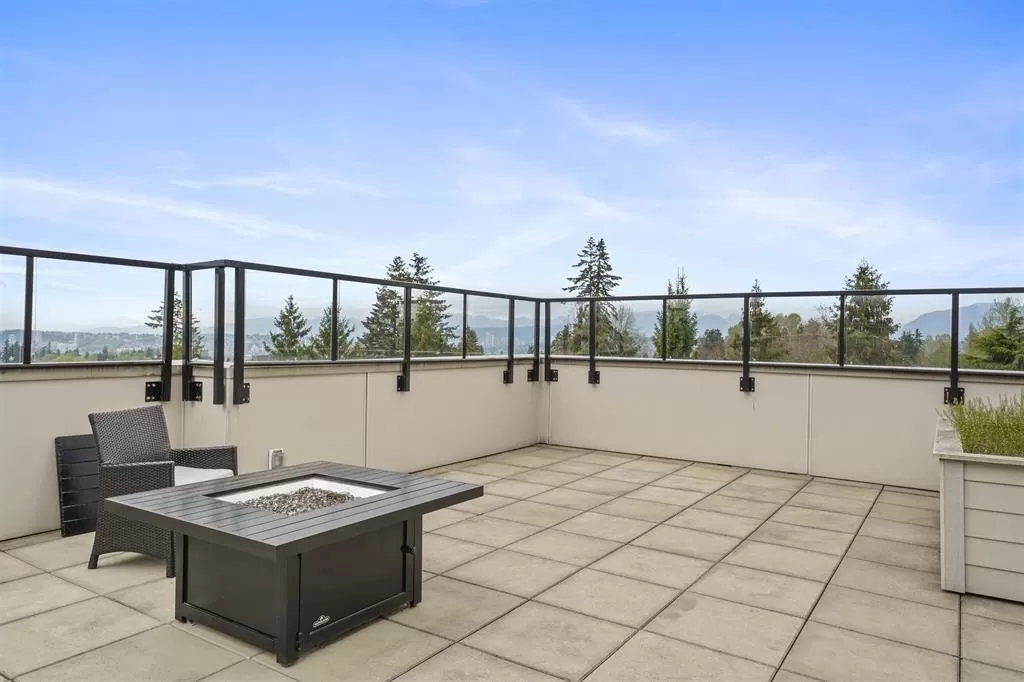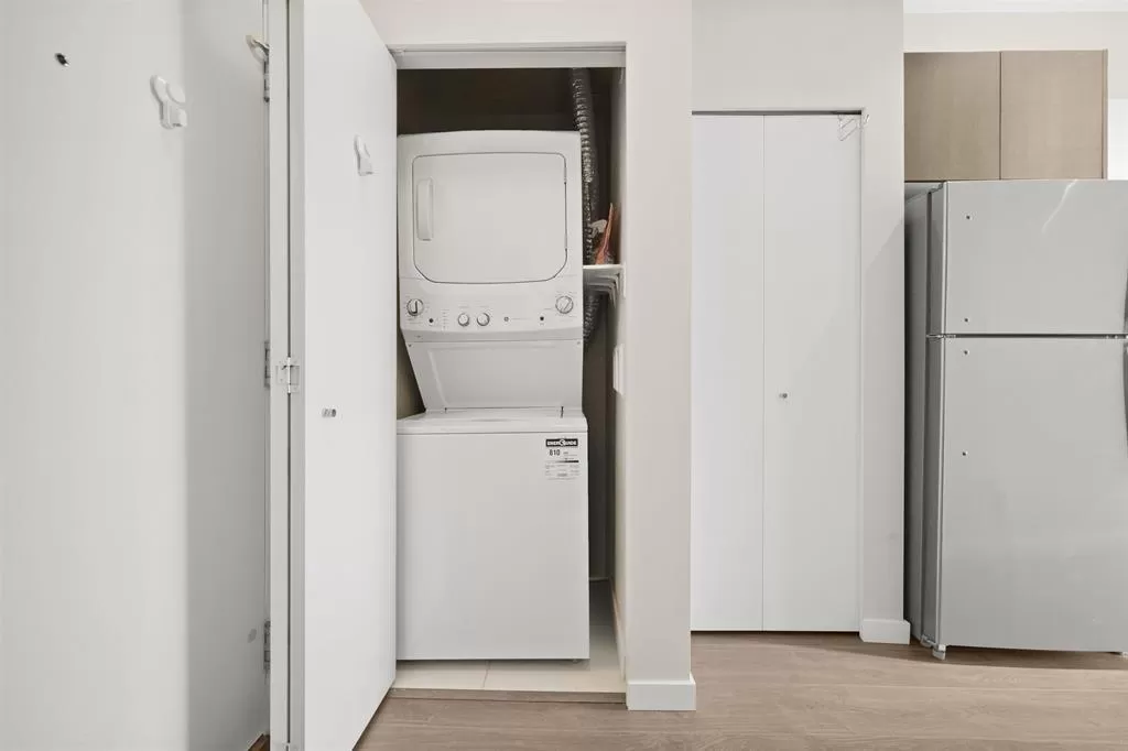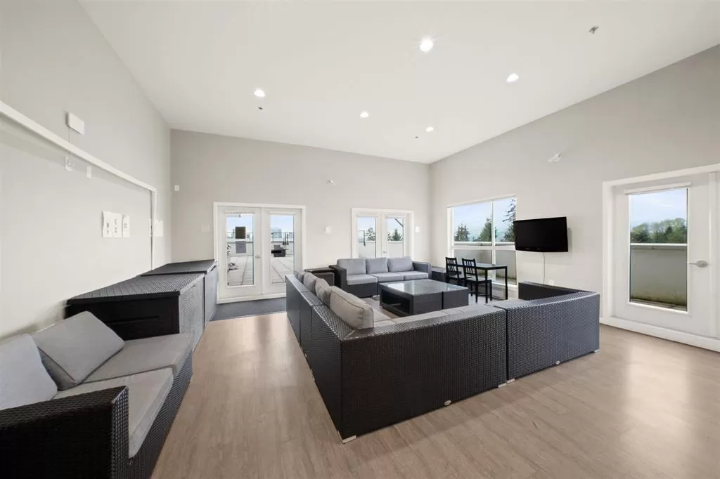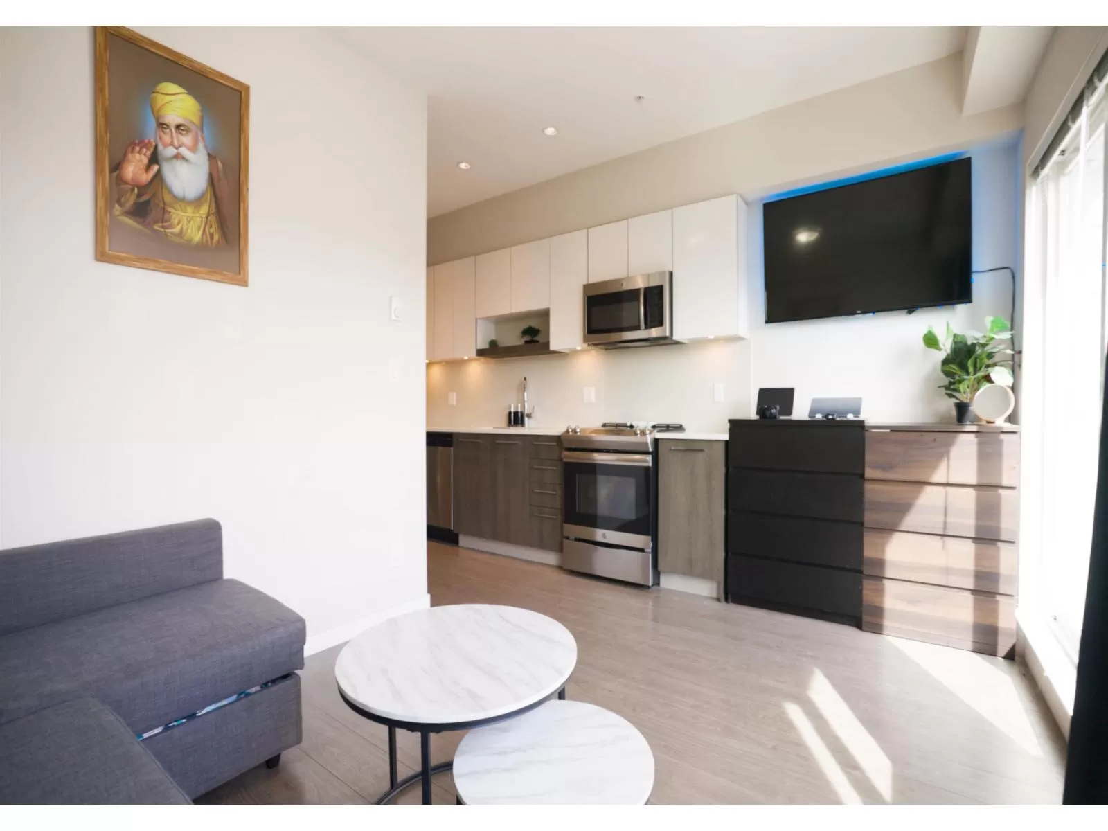 This immaculate 1-bedroom, 1-bathroom, 1-parking, 1-locker penthouse corner unit features modern laminate flooring, 9-ft ceilings, quartz countertops, stainless steel appliances, and a full-sized washer/dryer. . The unit comes with a low $292 strata fee and access to top amenities including a gym (no extra fee required) and a rooftop patio located just in front of the unit with BBQs, a fire table, and stunning city views. All this is just minutes from SkyTrain and local shops, making it a perfectly located, move-in ready home. Locker #29 parking #28 Enjoy a south-facing balcony with sunlight all day, conveniently positioned with the stairwell on one side of the unit and the electric room on the other-ideal for privacy and enjoying music without disturbing neighbors. (id:27476)