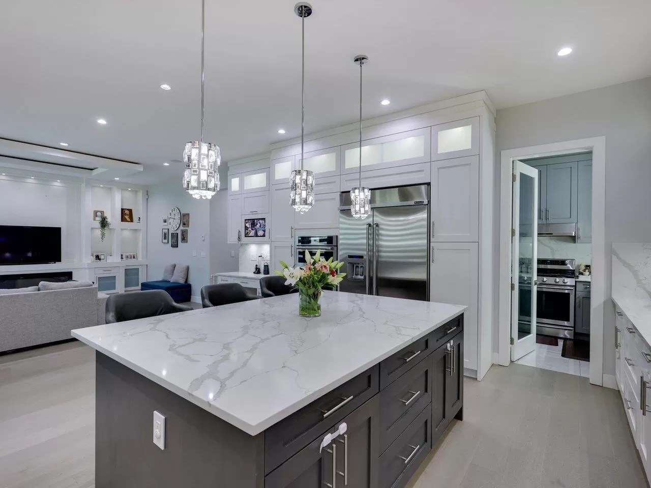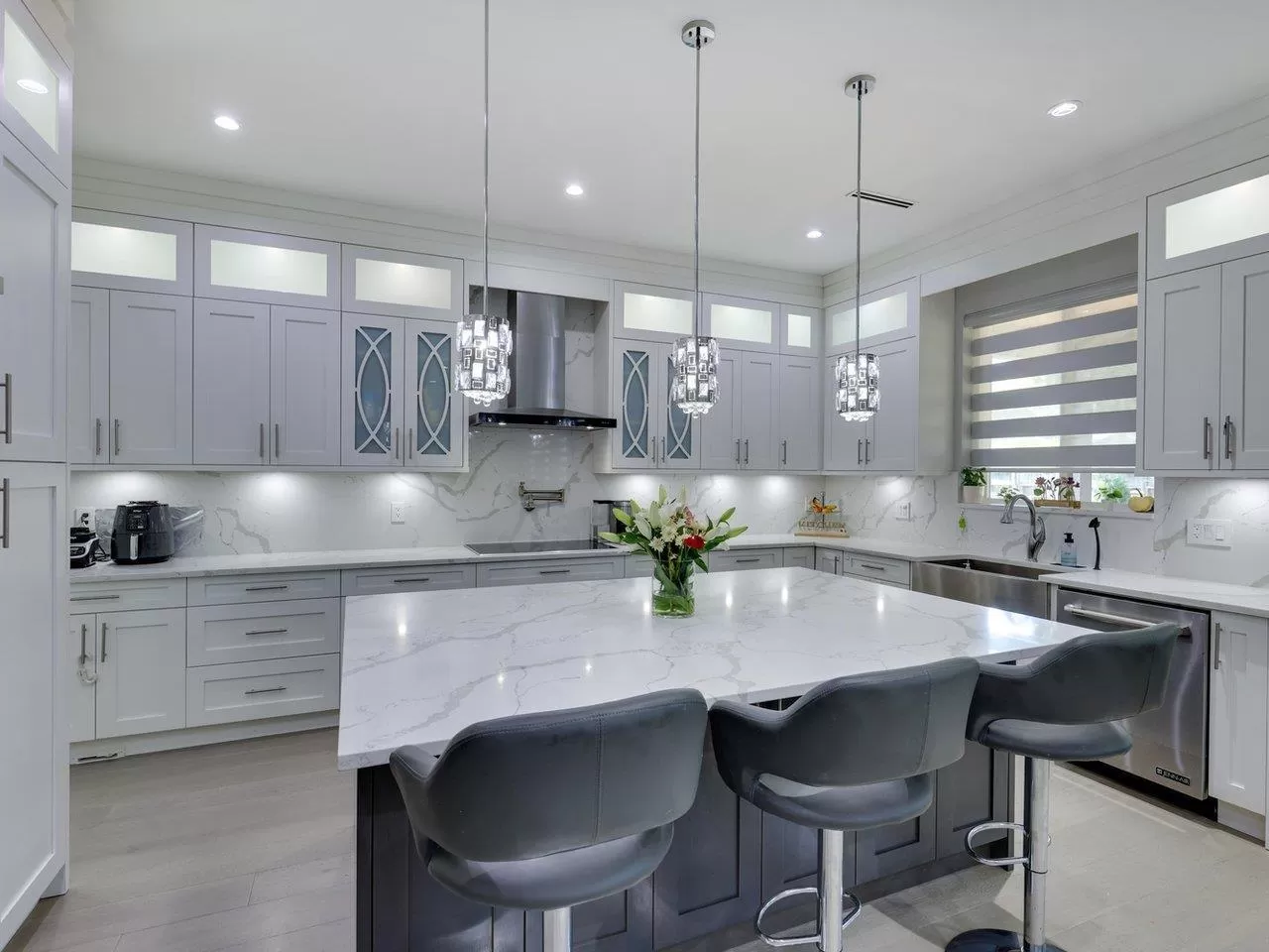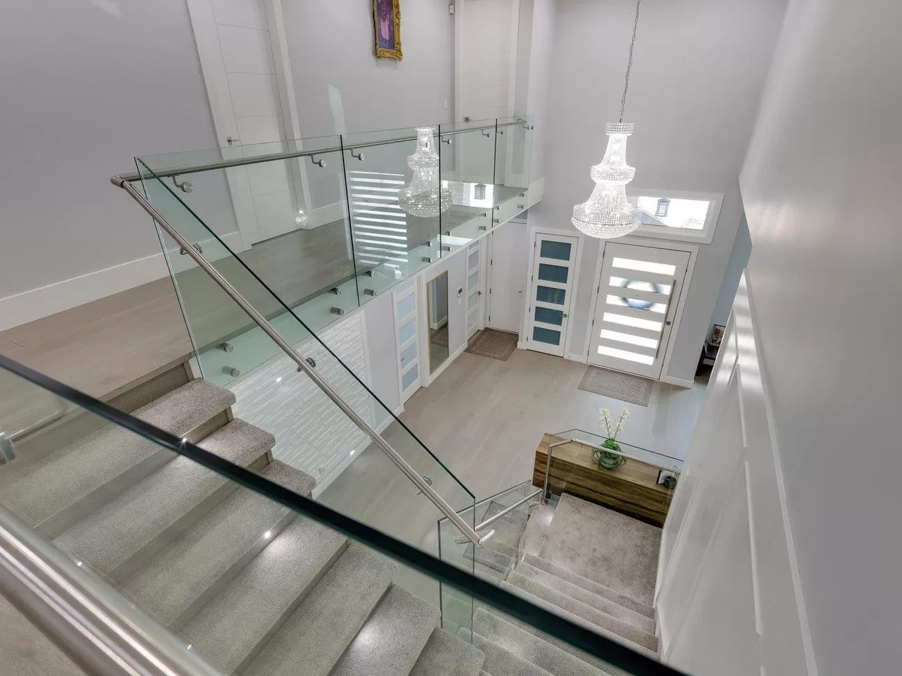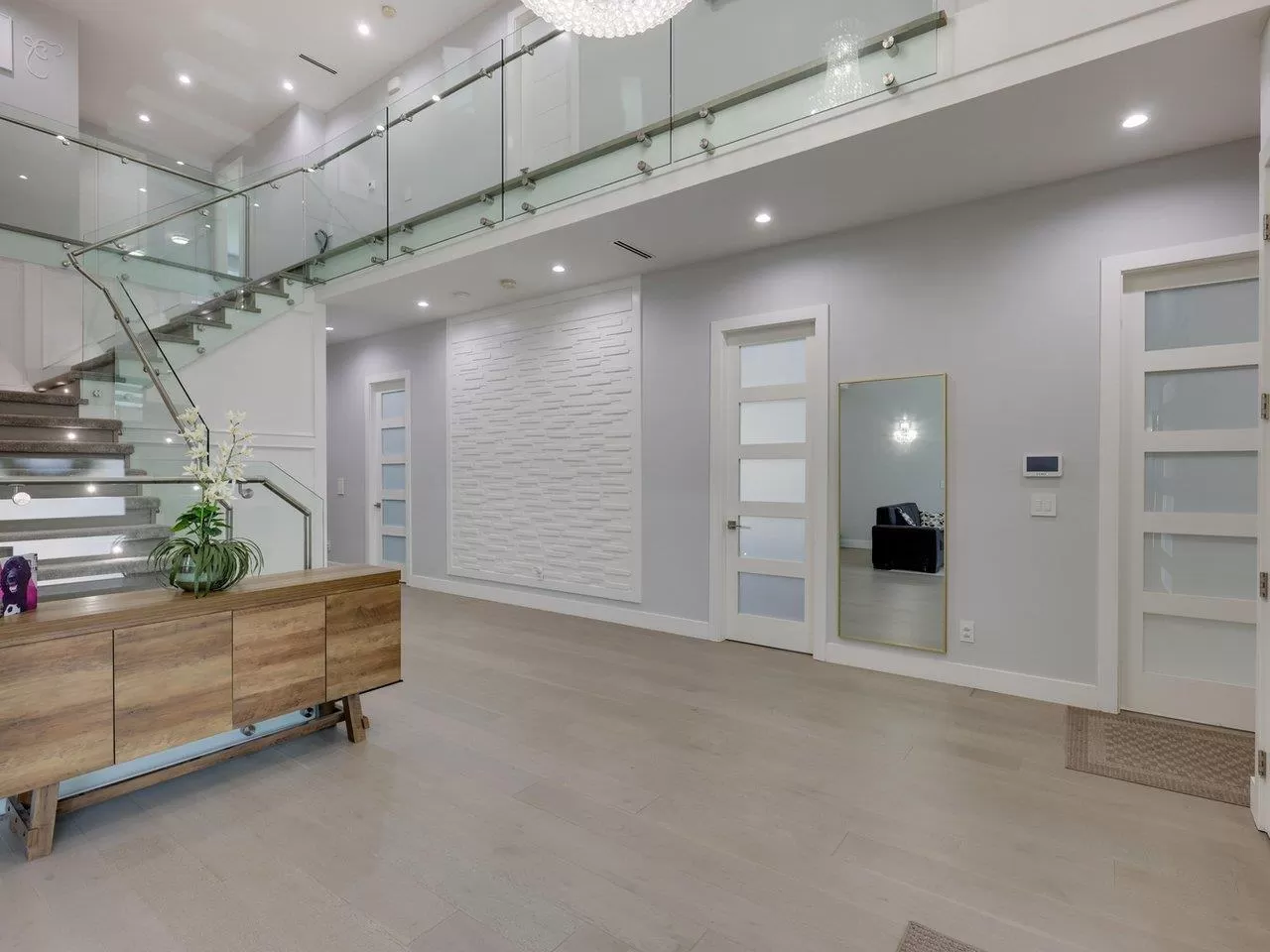 Breathtaking home in South Surrey's King George Corridor! This nearly 6,200+ sq ft, 8-bed, 8.5 bath masterpiece sits on a 9,700+ sq ft lot just minutes from White Rock Beach, top schools, and shopping. Features include a chef's kitchen with JennAir & Samsung appliances, wok kitchen, main-floor guest suite, office, and formal living/dining. Upstairs offers 4 bedrooms with ensuite and 1 bed with Ensuite on Main Level which is separate from the home office. The basement boasts a home theatre, wet bar, steam shower, rec room, and a 2-bed legal suite and a bonus separate 1 bed suite. Extras: radiant heat, A/C, smart home system, EV plug, and room for a backyard pool. Luxury, comfort, and income potential in one exceptional home! (id:27476)