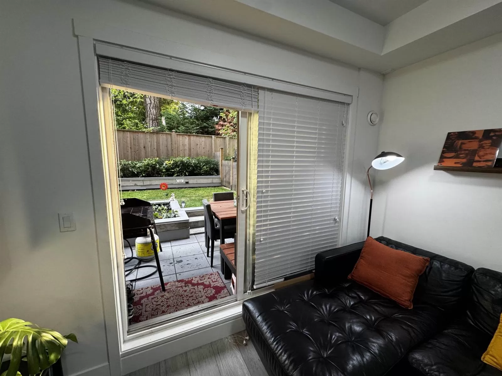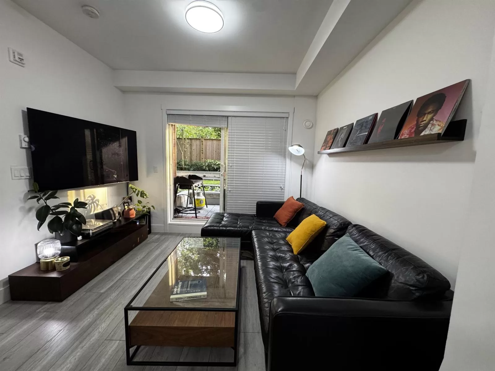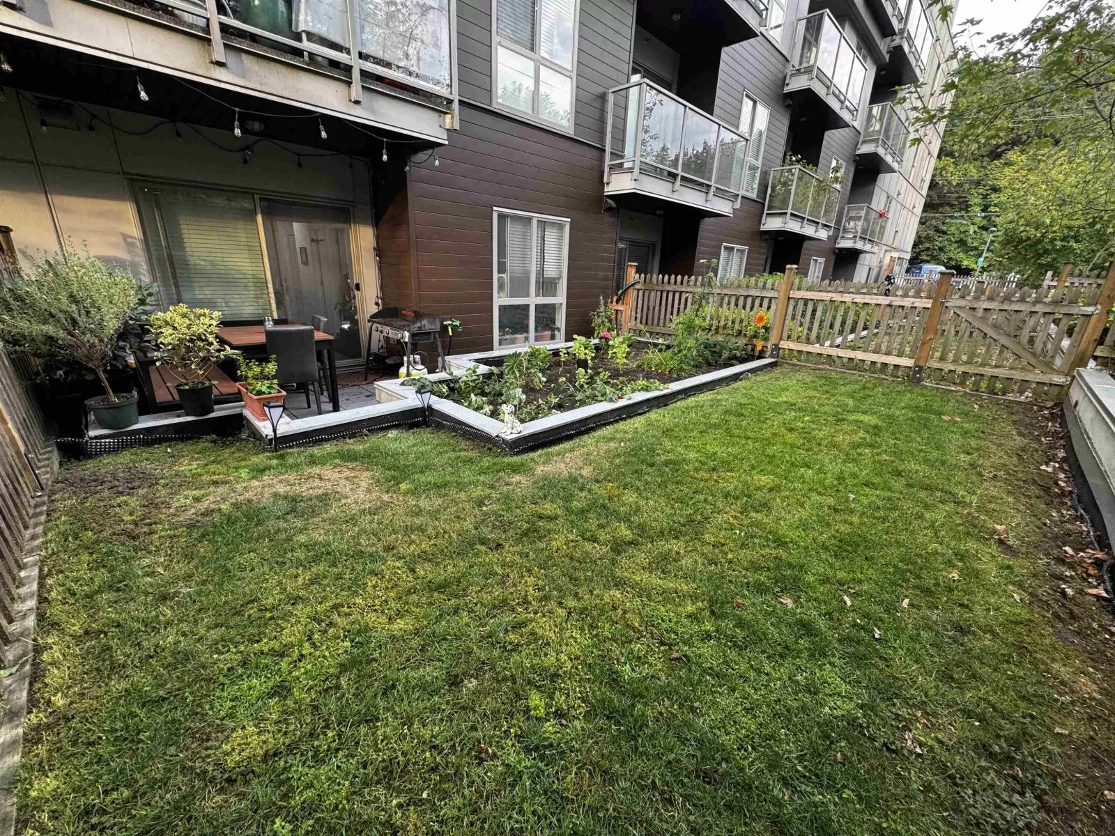 Welcome to this spacious south facing 1bed+den home with its very own backyard complete with a large garden and grassy area at 23ft x 24ft, perfect for growing your own vegetables or giving your dog room to play. Ideally located just minutes from the new skytrain station, this home offers the best of both comfort and convenience. Designed for modern living, the open concept layout provides a seamless flow between the living, dining, and kitchen areas. It has high ceiling at 10"8' and the stylish L shaped kitchen with a large custom island is perfect for cooking and entertaining. Rarely found in a 1-bed condo, the private backyard makes this home truly special. 1-parking close to the elevator and with extra space on driver's side. Shows like new, and available for quick possession. (id:27476)