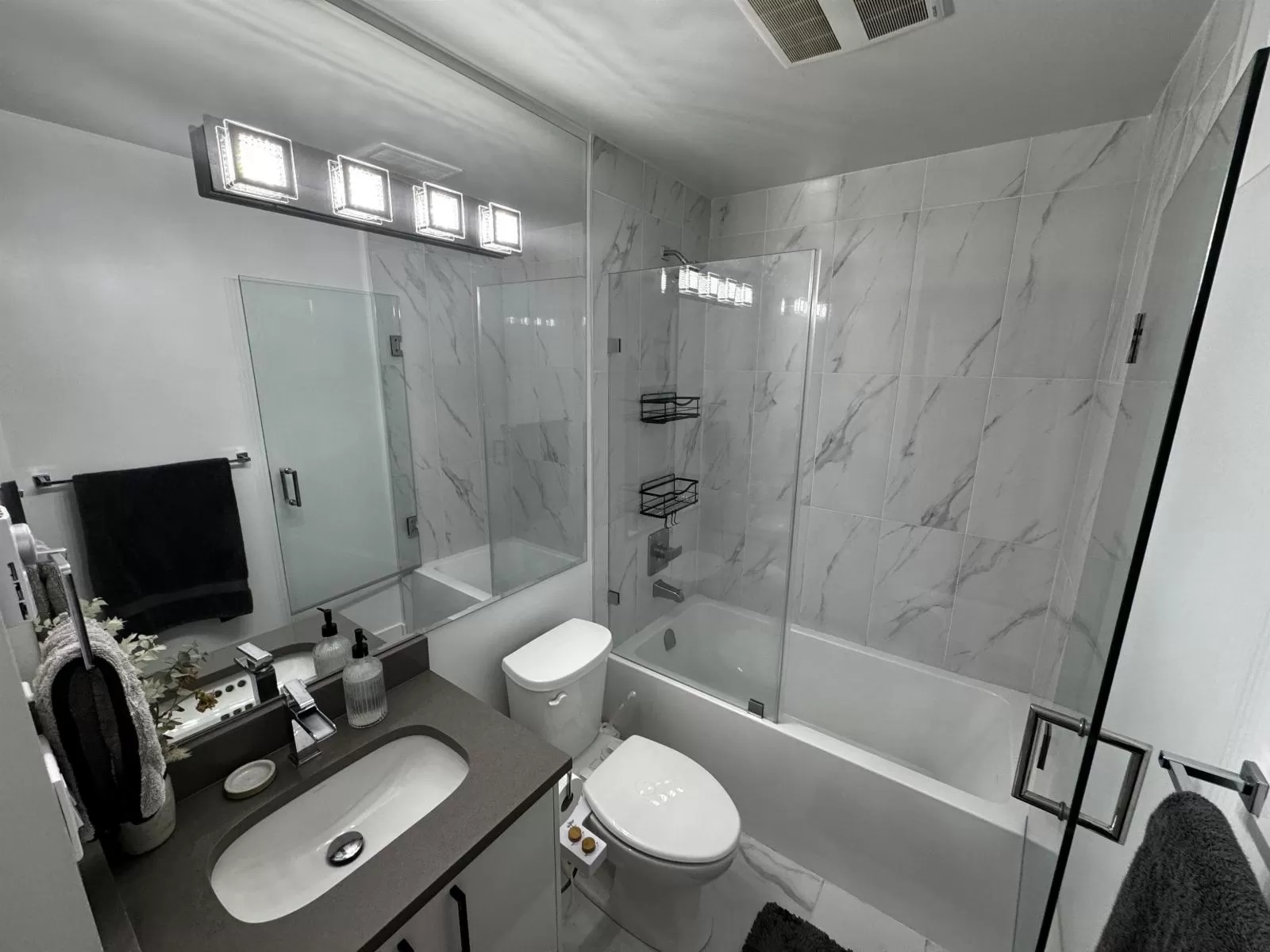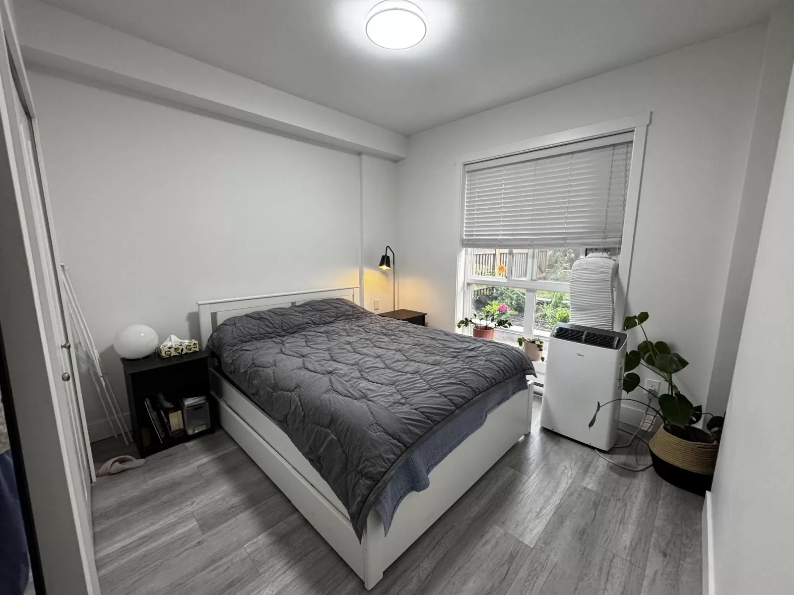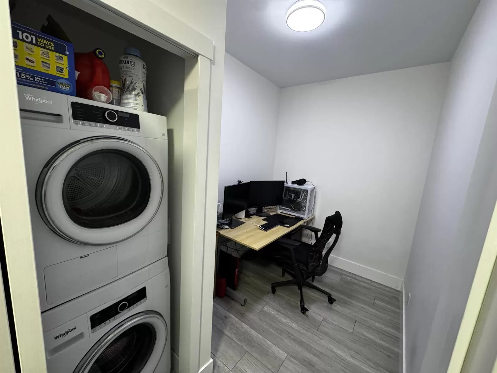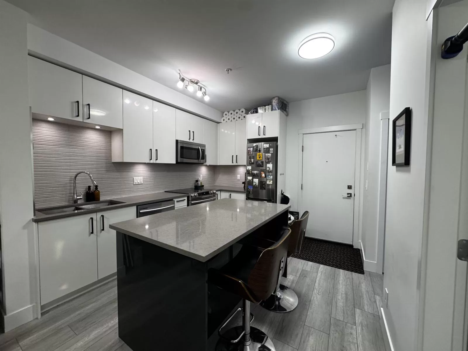 Welcome to this spacious south facing 1bed+den home with its very own backyard complete with a large garden and grassy area at 23ft x 24ft, perfect for growing your own vegetables or giving your dog room to play. Ideally located just minutes from the new skytrain station, this home offers the best of both comfort and convenience. Designed for modern living, the open concept layout provides a seamless flow between the living, dining, and kitchen areas. It has high ceiling at 10"8' and the stylish L shaped kitchen with a large custom island is perfect for cooking and entertaining. Rarely found in a 1-bed condo, the private backyard makes this home truly special. 1-parking close to the elevator and with extra space on driver's side. Shows like new, and available for quick possession. (id:27476)