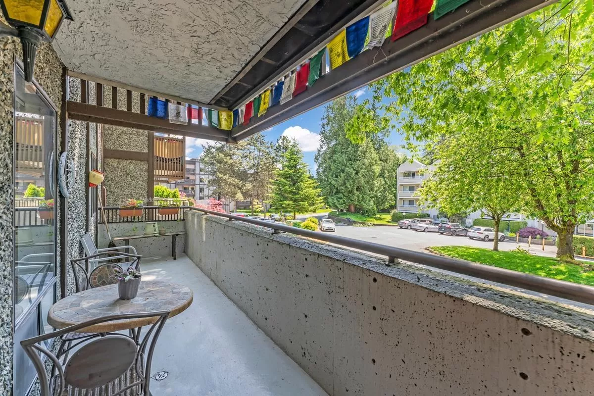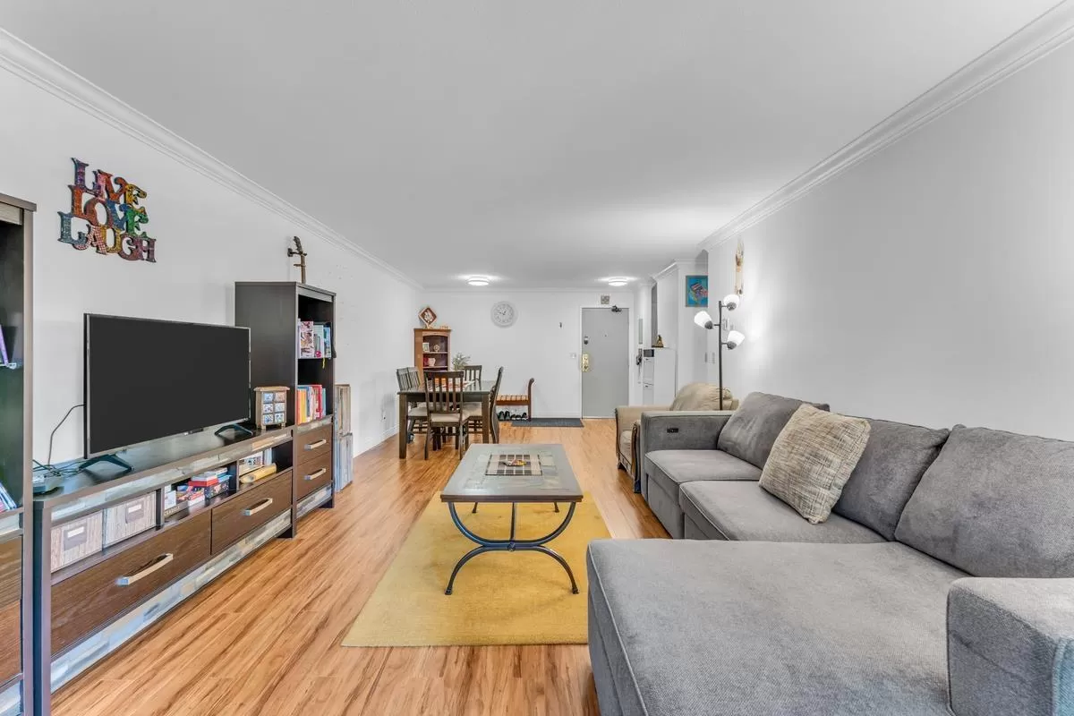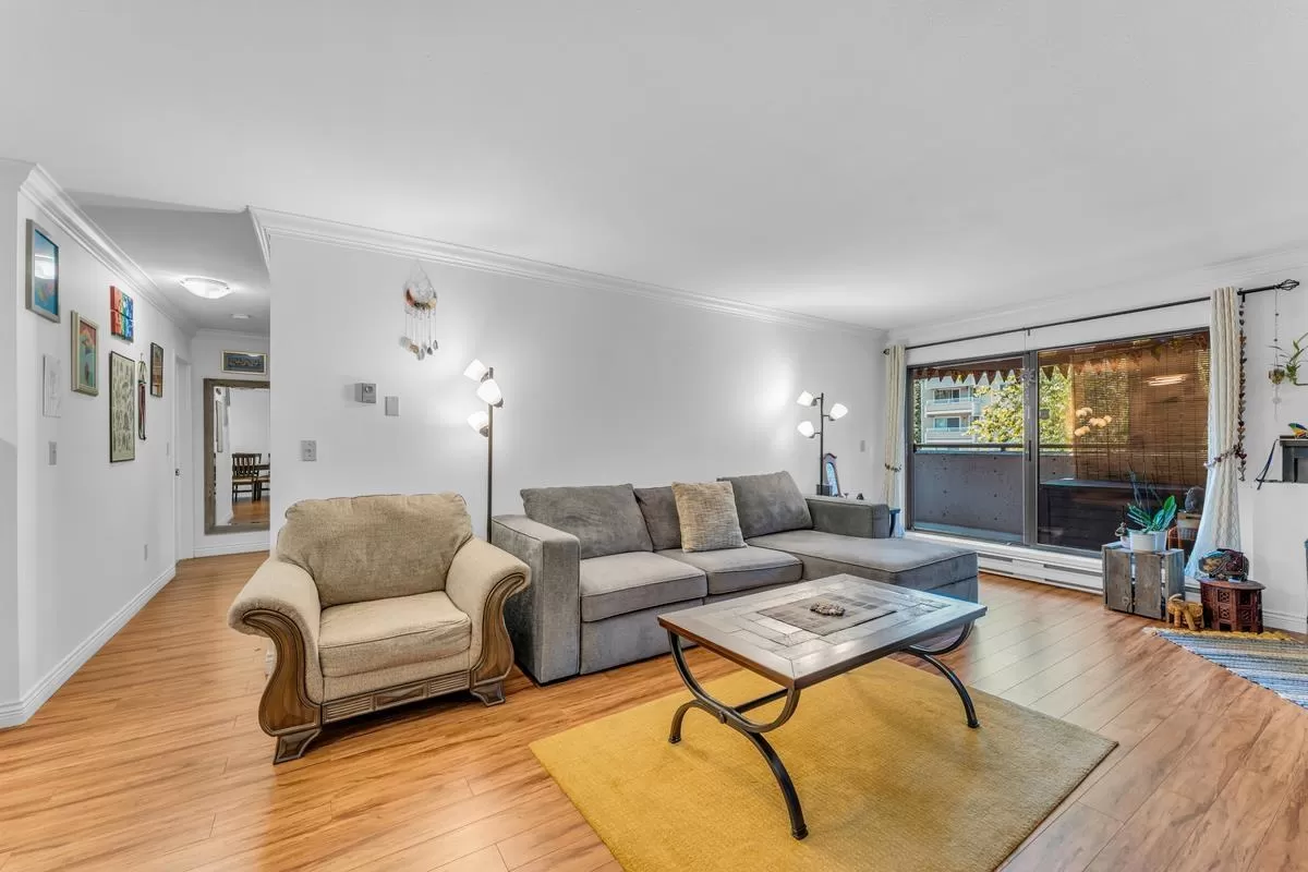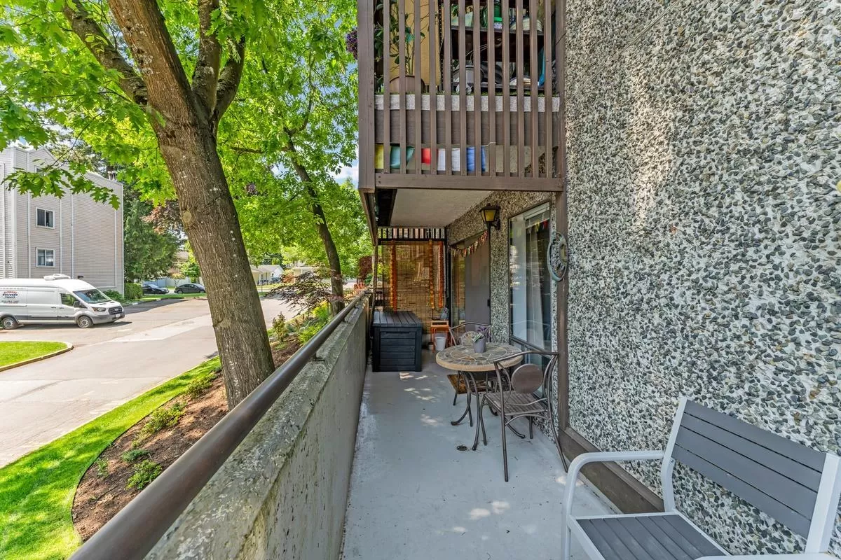 Step into this bright, spacious and updated unit! The large living room and dining room allow for house sized furniture. Kitchen has been updated with stainless steel appliances and ample cupboard storage. Each room is finished with beautiful crown mouldings. The primary bedroom allows for a full sized desk and is accompanied by an organizational walk-in closet. Second bedroom is also sizeable. The bathroom tiles and countertop have been redone and create a fresh atmosphere. BBQ all year long with a partially covered patio. It is located on 1st floor but not ground level. The location is unbeatable with Surrey Centrals amenities all close by. Skytrain and transit are walking distance. This unit offers so many options with its expansive space. 1 parking and storage included! Shared laundry. (id:27476)