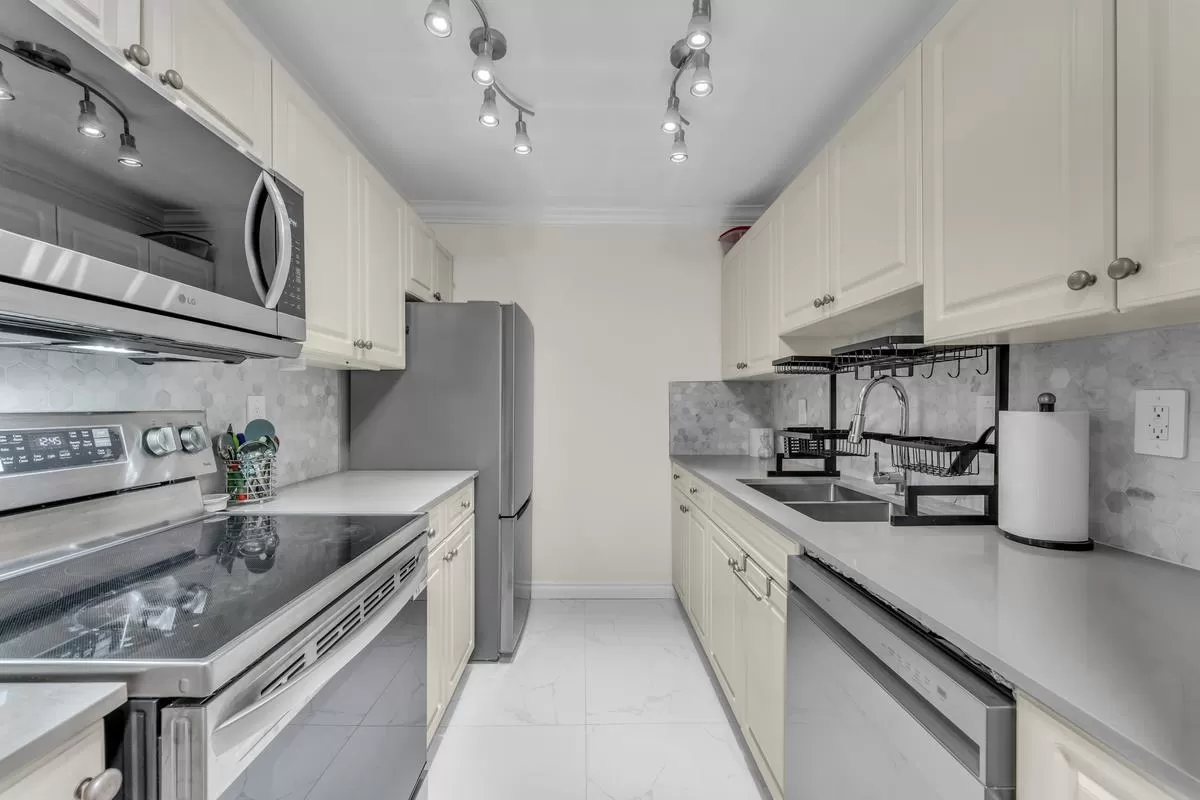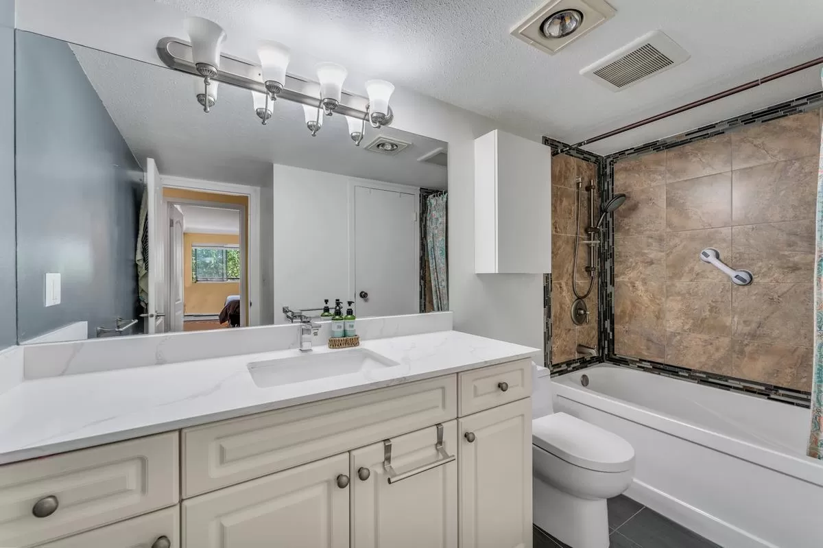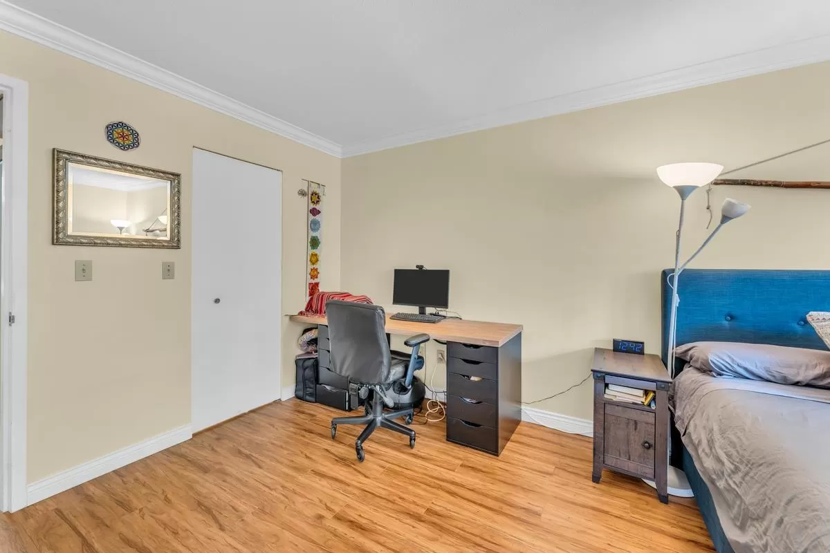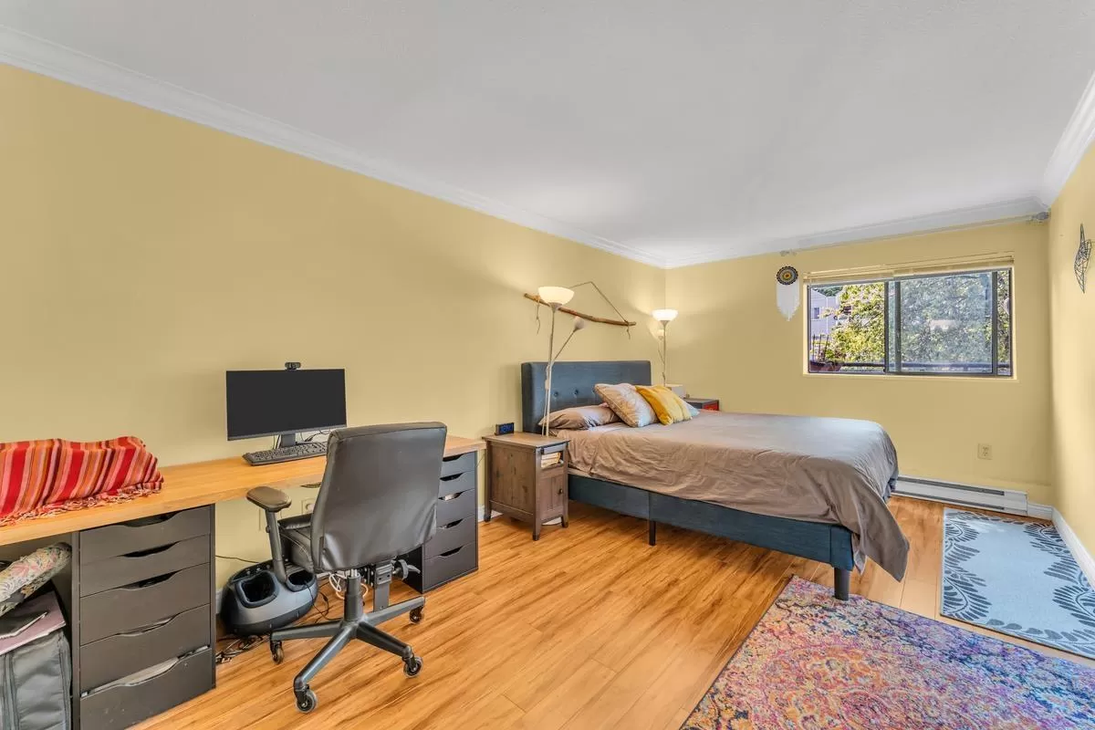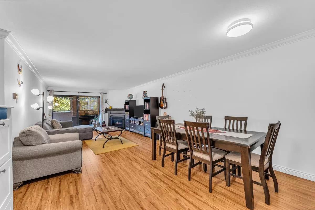 Step into this bright, spacious and updated unit! The large living room and dining room allow for house sized furniture. Kitchen has been updated with stainless steel appliances and ample cupboard storage. Each room is finished with beautiful crown mouldings. The primary bedroom allows for a full sized desk and is accompanied by an organizational walk-in closet. Second bedroom is also sizeable. The bathroom tiles and countertop have been redone and create a fresh atmosphere. BBQ all year long with a partially covered patio. It is located on 1st floor but not ground level. The location is unbeatable with Surrey Centrals amenities all close by. Skytrain and transit are walking distance. This unit offers so many options with its expansive space. 1 parking and storage included! Shared laundry. (id:27476)