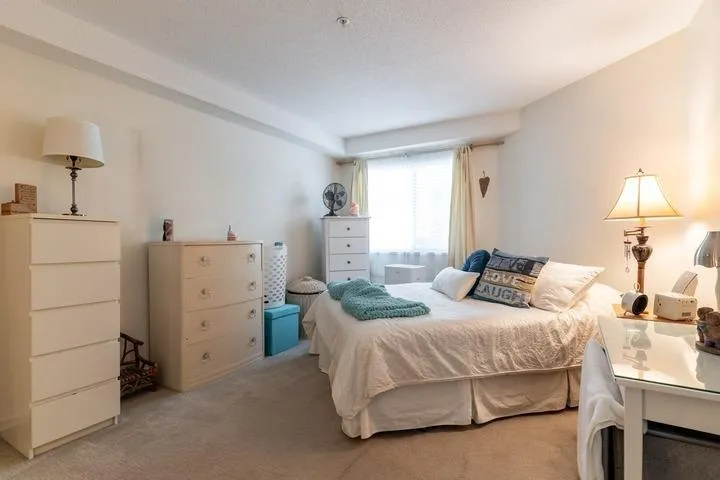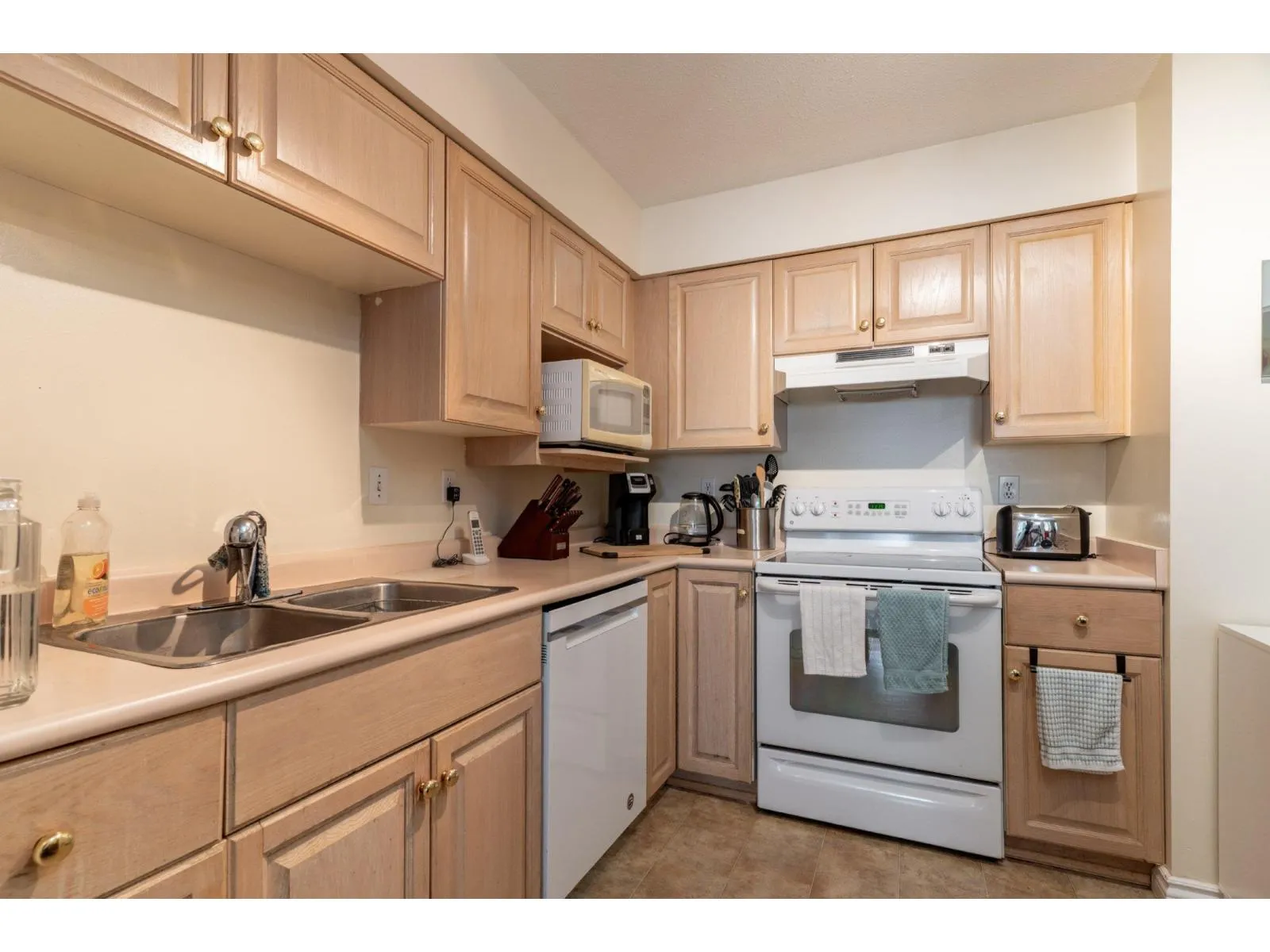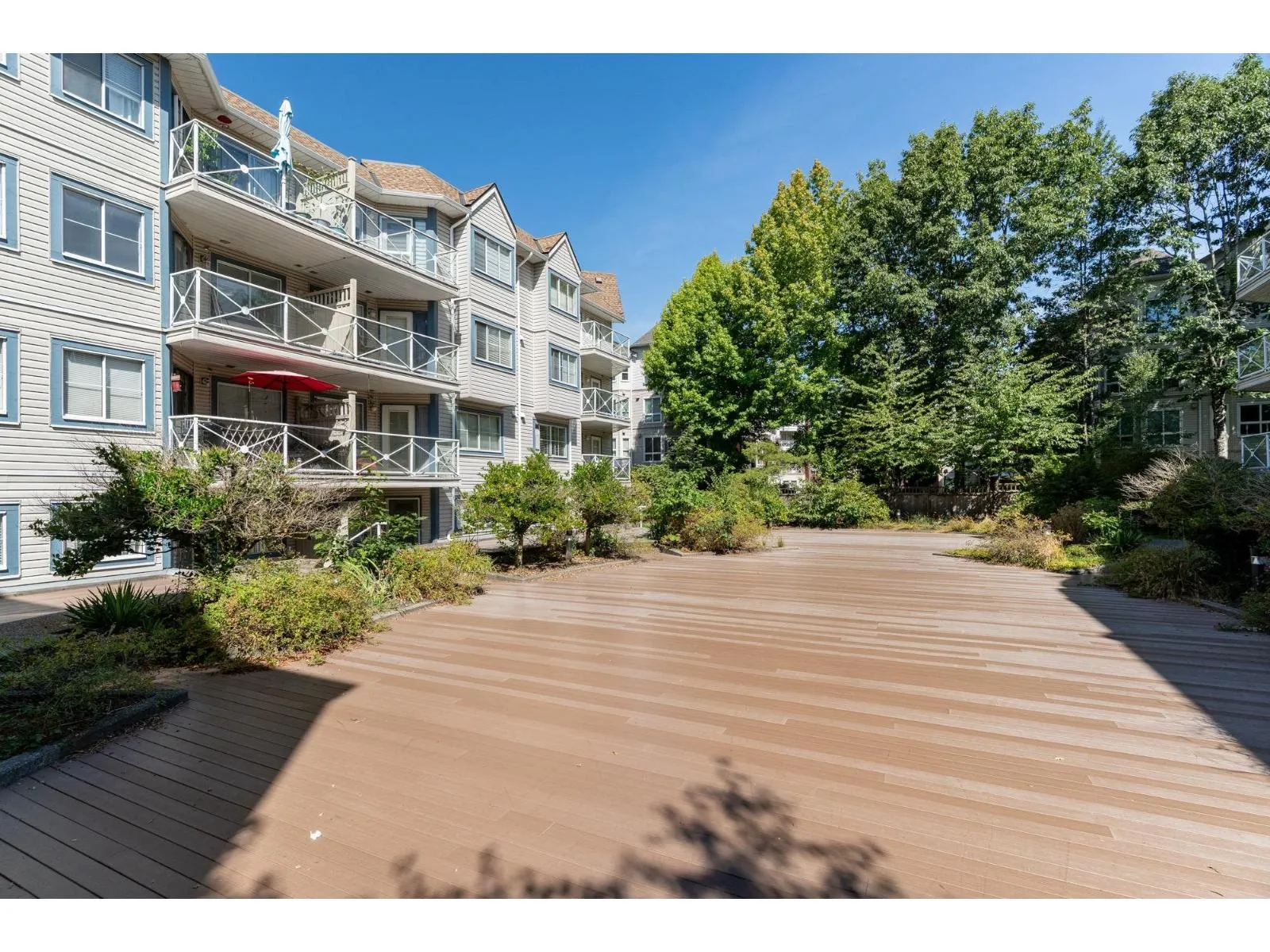 Extremely well maintained huge one bedroom unit on the ground floor of Surrey Town Manor. With almost 900sqft of living area, you feel like you're living in a house. Large kitchen with eating area opens onto a real dining room leaving ample space for full size furniture in the living room. Large 100sqft patio faces the interior of the courtyard. Primary bedroom is the largest you will see in a one bedroom with double walkthrough closets and an ensuite bathroom. Low maintenance fees of $312. 1 Underground parking spot. Close to shopping, restaurants and bus. (id:27476)