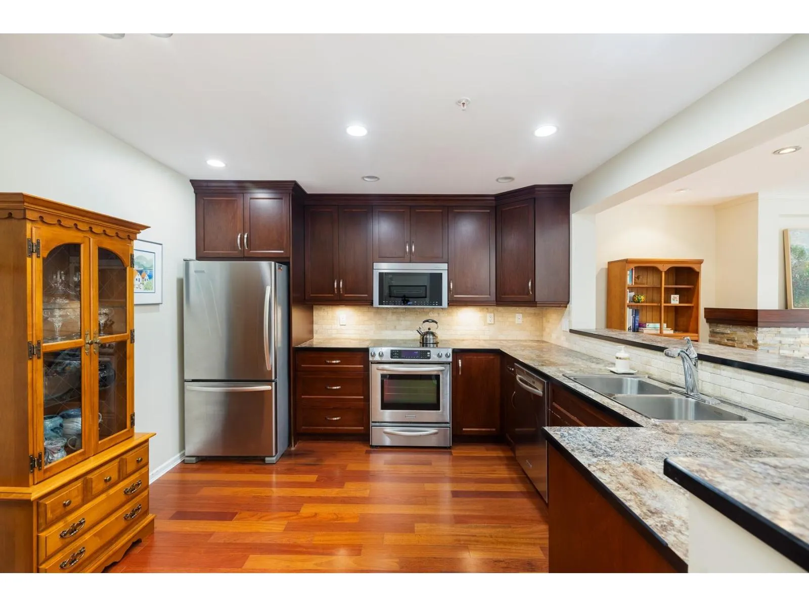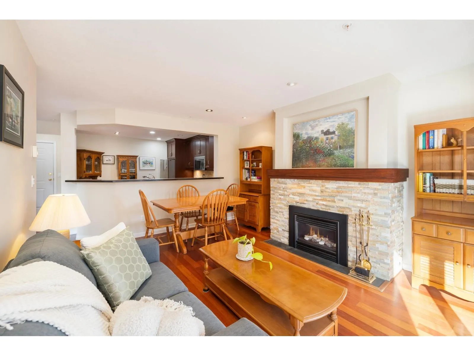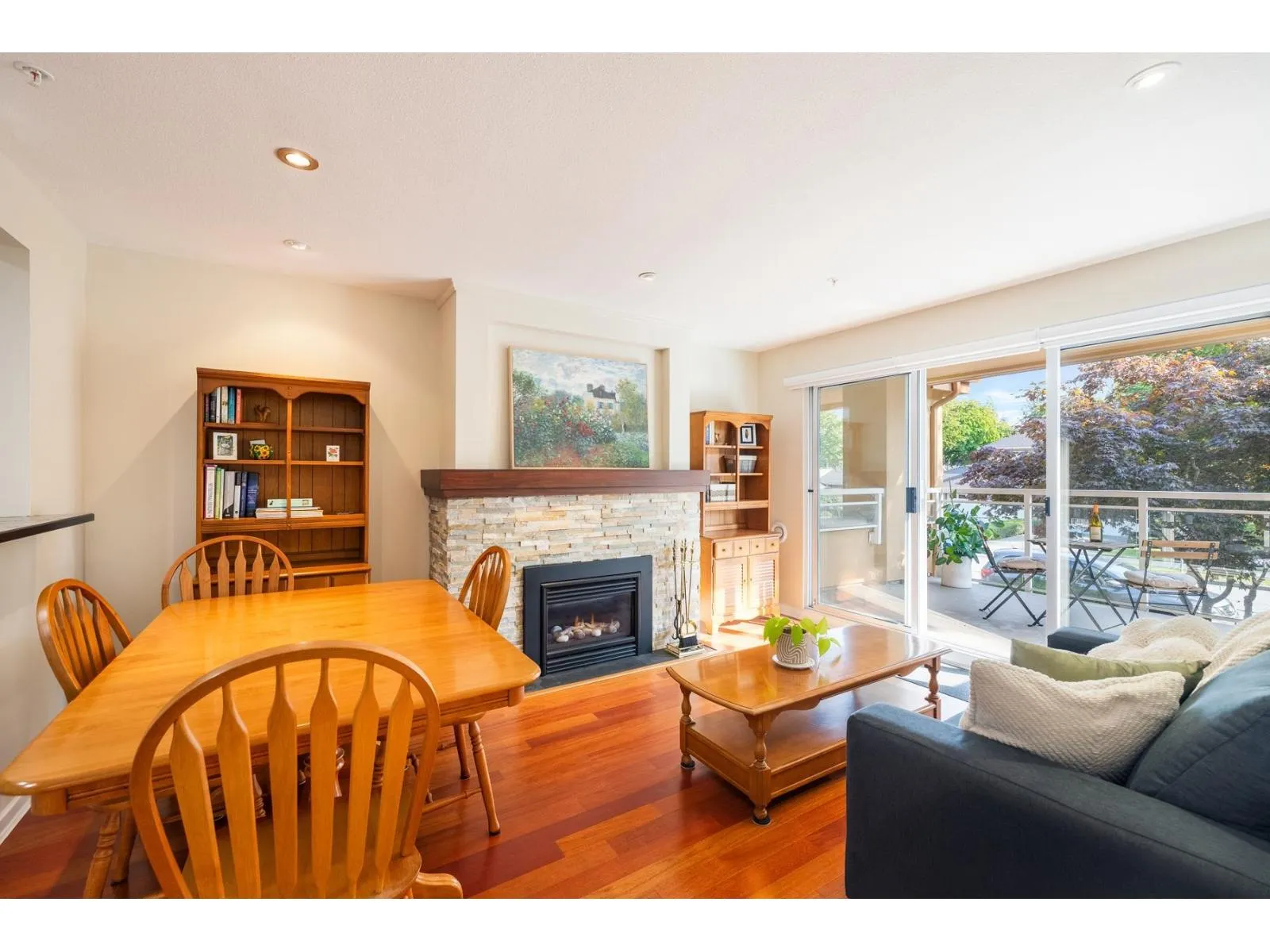 Welcome to South Surrey living at its finest! This bright 1,027sqft 2-bedroom, 2-bathroom condo is perfectly positioned on a peaceful, tree-lined street just steps from the Semiahmoo Walking Trails. You'll love the southern exposure and leafy outlook from the spacious covered sundeck - the perfect spot to relax year-round. Inside, the home has a well-sized kitchen with a breakfast nook, gleaming cherry hardwood floors, and a cozy gas fireplace that anchors the living space. The primary suite features a full ensuite with a deep soaker tub. Recent upgrades include new electric blinds, a brand-new microwave stove vent, and fresh paint in 2025, making this home move-in ready. The building itself is warm and welcoming, offering a fitness centre, amenity room, library, secure parking, a storage locker, and ample guest parking. Prime location minutes from White Rock Beach - Welcome home! (id:27476)