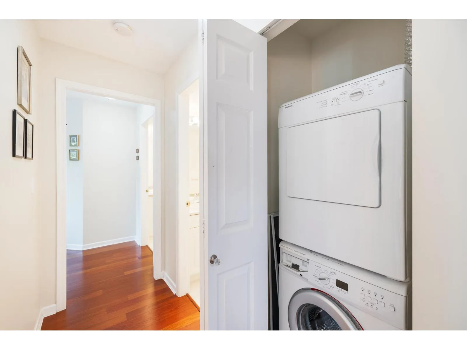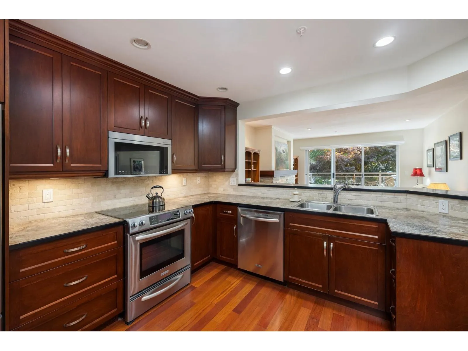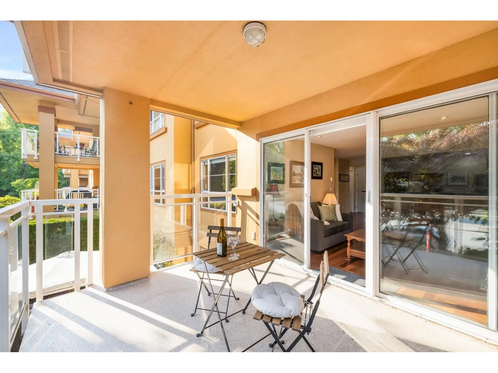 Welcome to South Surrey living at its finest! This bright 1,027sqft 2-bedroom, 2-bathroom condo is perfectly positioned on a peaceful, tree-lined street just steps from the Semiahmoo Walking Trails. You'll love the southern exposure and leafy outlook from the spacious covered sundeck - the perfect spot to relax year-round. Inside, the home has a well-sized kitchen with a breakfast nook, gleaming cherry hardwood floors, and a cozy gas fireplace that anchors the living space. The primary suite features a full ensuite with a deep soaker tub. Recent upgrades include new electric blinds, a brand-new microwave stove vent, and fresh paint in 2025, making this home move-in ready. The building itself is warm and welcoming, offering a fitness centre, amenity room, library, secure parking, a storage locker, and ample guest parking. Prime location minutes from White Rock Beach - Welcome home! (id:27476)