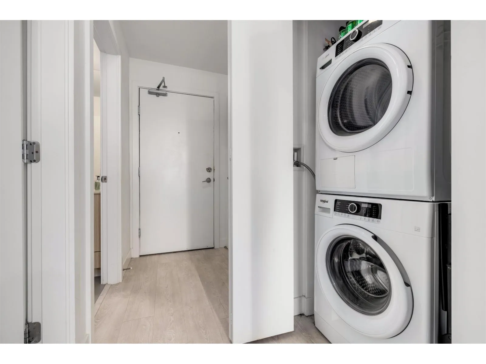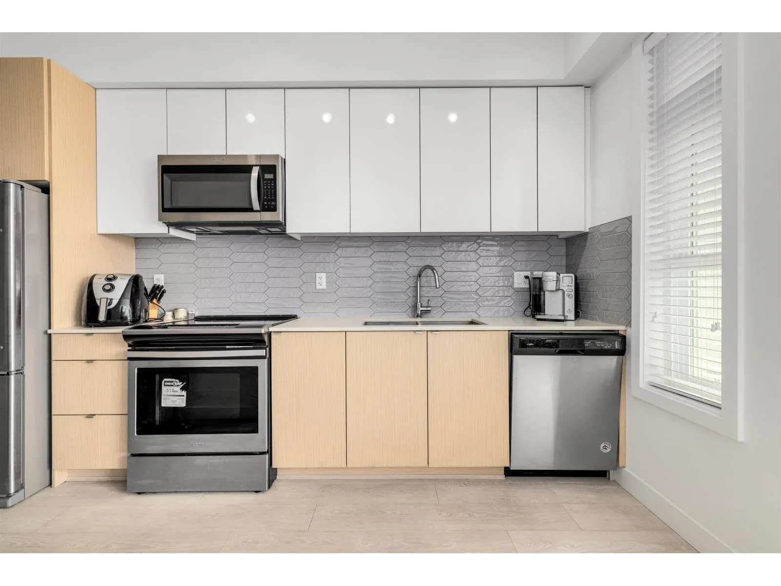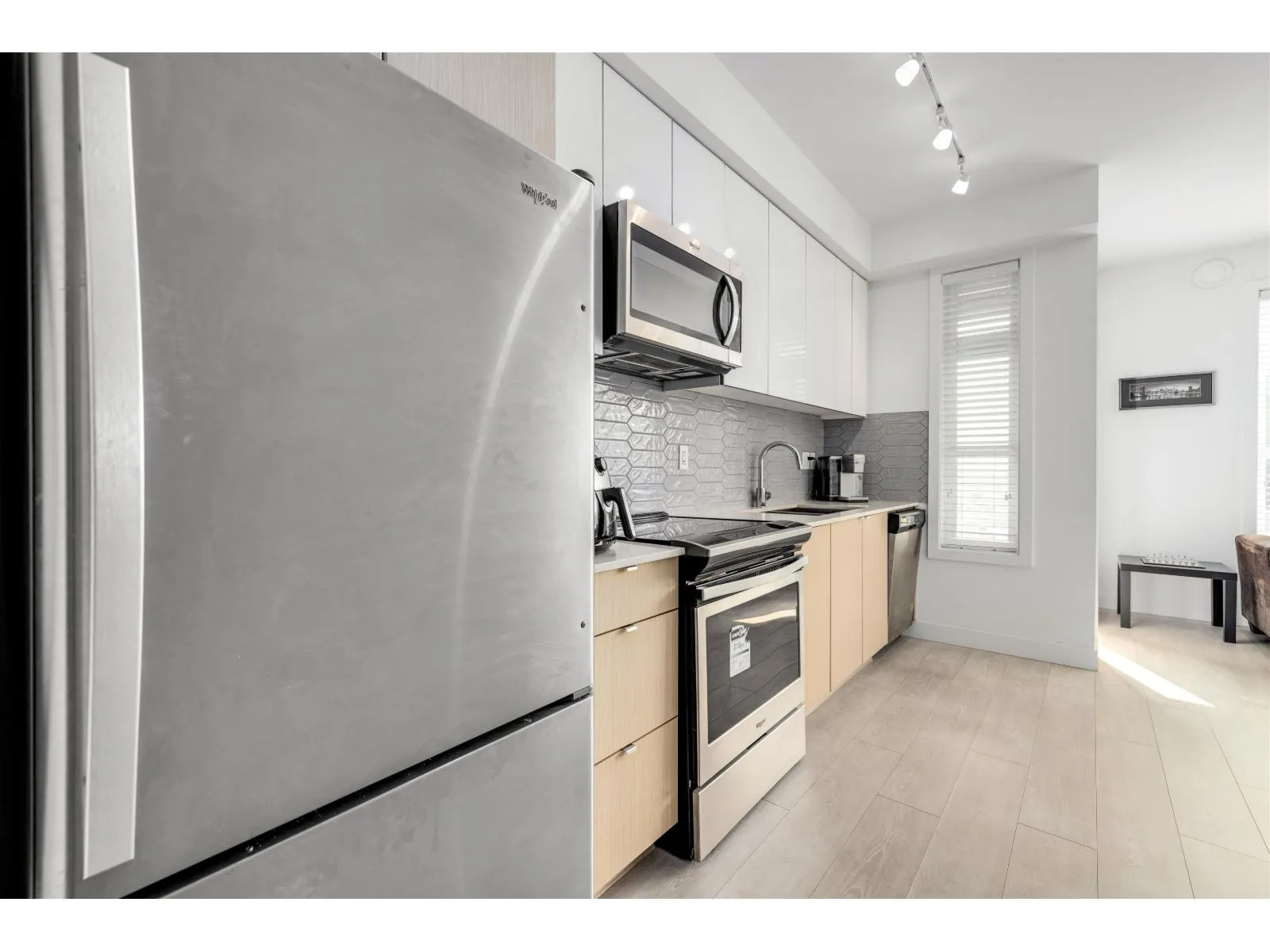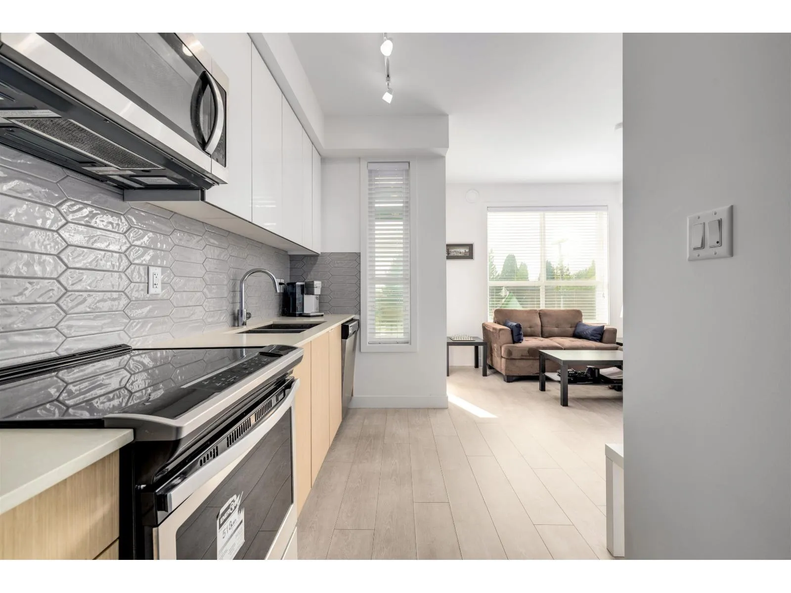 YALE BLOC 3 - Bright and modern 1 bed, 1 bath home with an efficient open layout and unobstructed mountain views from the living room and balcony. The sleek kitchen features Caesar stone quartz counters, bold marble tile backsplash, and S/S Whirlpool appliances. Enjoy plenty of natural light, in-suite laundry, plus 1 parking and 1 storage. Fantastic building amenities include a fitness centre, guest suite, and party room. Pets and rentals allowed with no restrictions-a great option for both first-time buyers and investors. Walking distance to Willowbrook Shopping Centre, Kwantlen University, Cactus Club, and close to the upcoming SkyTrain extension. (id:27476)