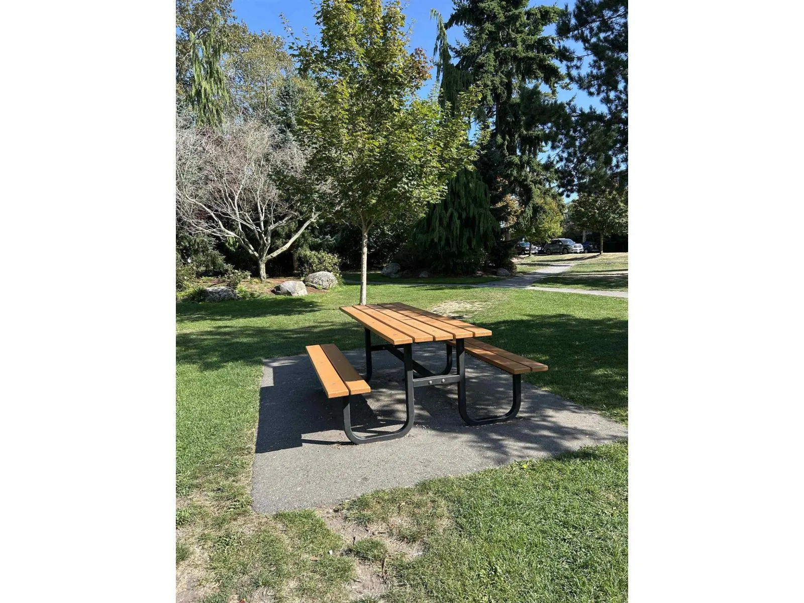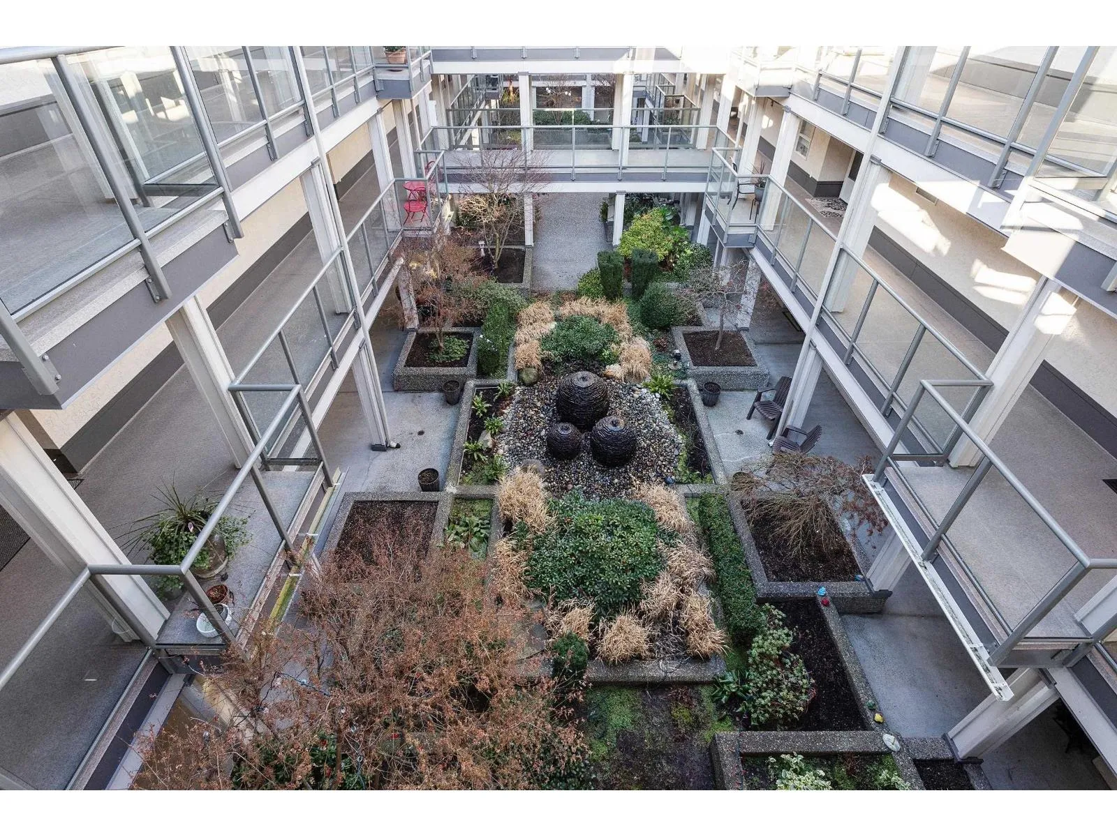 Top floor luxury 2 bedroom, 2 full bathroom condo. Spacious, bright & quiet, dramatic vaulted ceiling in the living and dining areas. Nearly 1,400 sq/ft with large open kitchen, granite counters, gas fireplace, and lots of extras like a window at the kitchen sink & bonus in-suite laundry room. A practical layout w/ample storage, phantom screen doors & integrated blinds right in the doors. It's vacant and ready to go with new carpet and paint. You will love the inner courtyard bringing natural light and fresh air to your front door in a beautiful intimate setting. A naturally lit secure garage, all located centrally and easily walkable to Semi Mall and transportation. Close to White Rock and Crescent beaches, this is the place! Measurements from strata plan, buyer to verify if important. (id:27476)