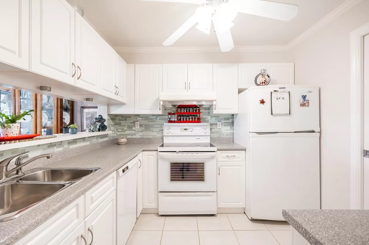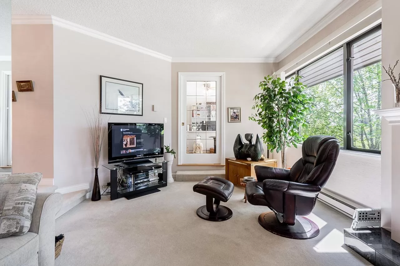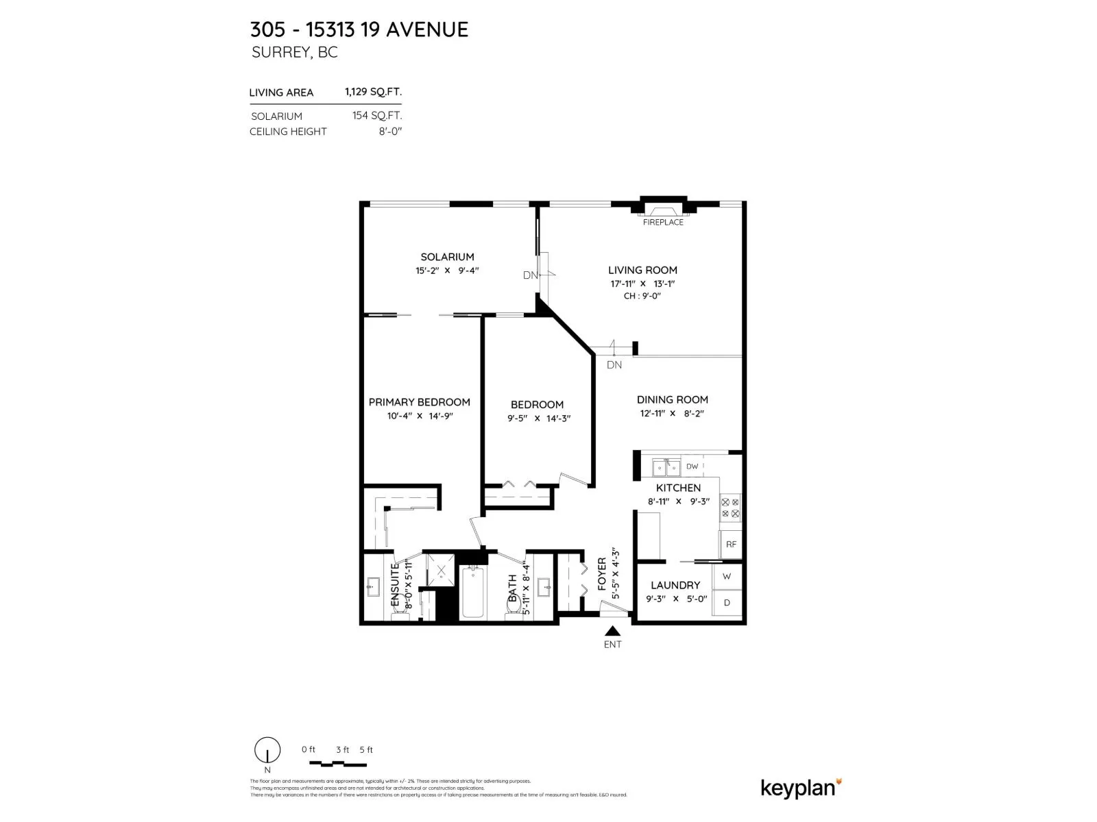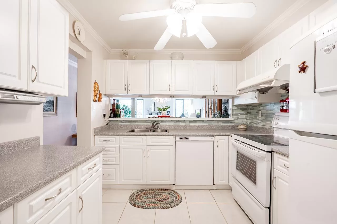 Welcome to Village Terrace, South Surrey's hidden gem. This pristine top-floor condo features 2 bedrooms, 2 bathrooms, and over 1,100 sq ft of thoughtfully designed living space. Enjoy spectacular southern views of Bakerview Park. The updated white kitchen offers ample cabinet and counter space, perfect for everyday living and entertaining. A cozy gas fireplace anchors the spacious living room, which is flooded with natural light and overlooks the park. The primary bedroom includes a private ensuite, while the second bedroom is ideal for guests. The versatile solarium, currently used as a home office, adds flexibility. Generous sized laundry room/pantry with extra storage. Located in a highly walkable neighborhood, a short distance from shops, schools, parks, and Semiahmoo Mall. (id:27476)