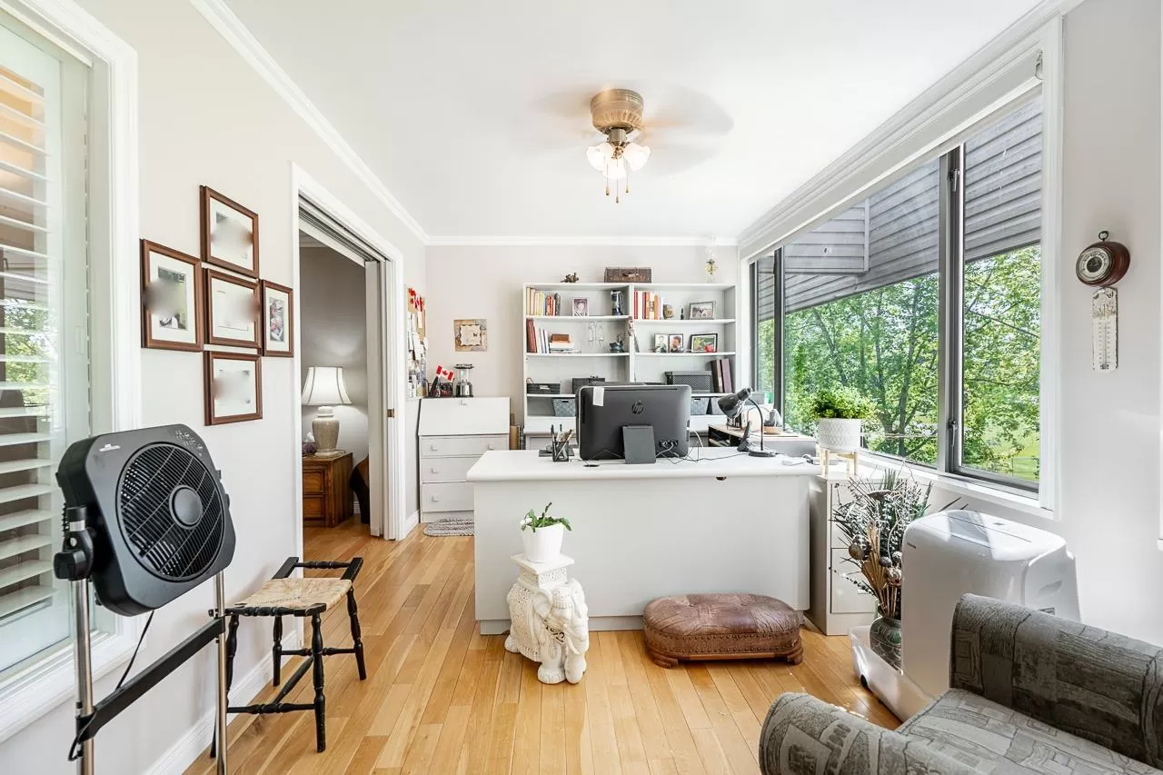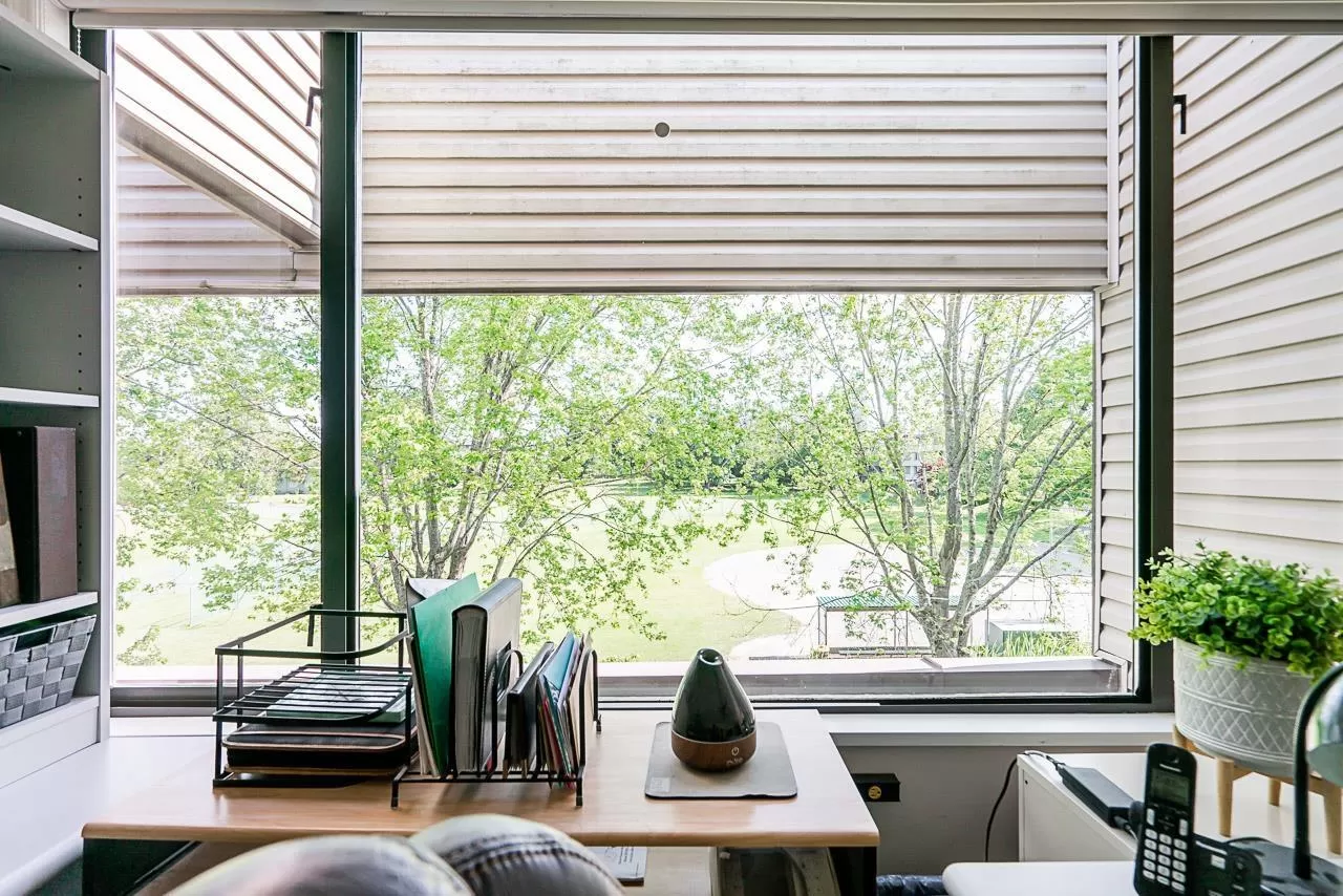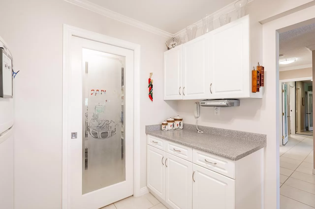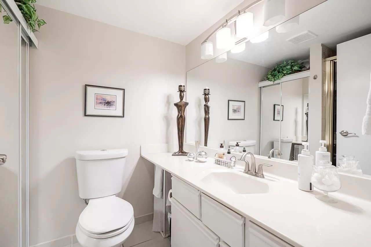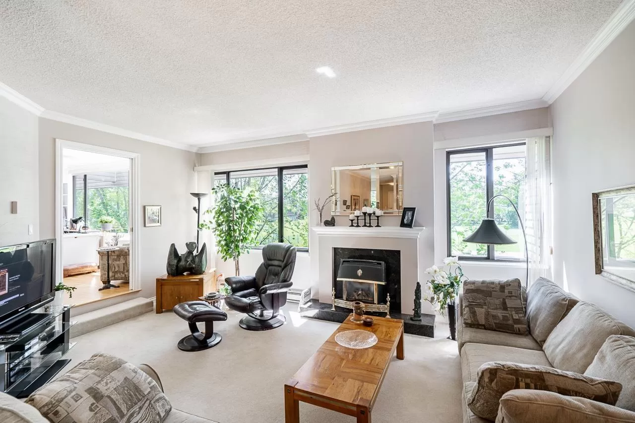 Welcome to Village Terrace, South Surrey's hidden gem. This pristine top-floor condo features 2 bedrooms, 2 bathrooms, and over 1,100 sq ft of thoughtfully designed living space. Enjoy spectacular southern views of Bakerview Park. The updated white kitchen offers ample cabinet and counter space, perfect for everyday living and entertaining. A cozy gas fireplace anchors the spacious living room, which is flooded with natural light and overlooks the park. The primary bedroom includes a private ensuite, while the second bedroom is ideal for guests. The versatile solarium, currently used as a home office, adds flexibility. Generous sized laundry room/pantry with extra storage. Located in a highly walkable neighborhood, a short distance from shops, schools, parks, and Semiahmoo Mall. (id:27476)