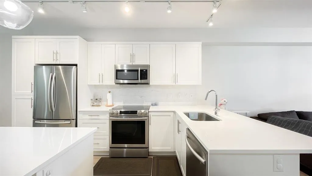WOW!!!. Beautiful Mountain View 4 bed / 3 bath 1,650+ sqft of exceptional design & construction. Open-concept floor plan and a private patio make it perfect for entertaining, Samsung S/S appliances, large kitchen island, quartz countertops throughout, high-end designer light fixtures, built-in TV entertainment center & kitchen bench, stylish accent walls, 2'' faux wooden blinds, and powder room below. 9' ceilings and large windows fill the kitchen & great room with LOTS of natural light. Master bedroom boasts a vaulted ceiling, walk-in closet and spa-inspired ensuite with double sinks. Downstairs bedroom don't have a window but it is perfect for Home Office/ Bussiness, or saloon with full washroom. OPEN HOUSE SEP 20 SAT & 21 SUNDAY 2:00-4:00 PM (id:27476)