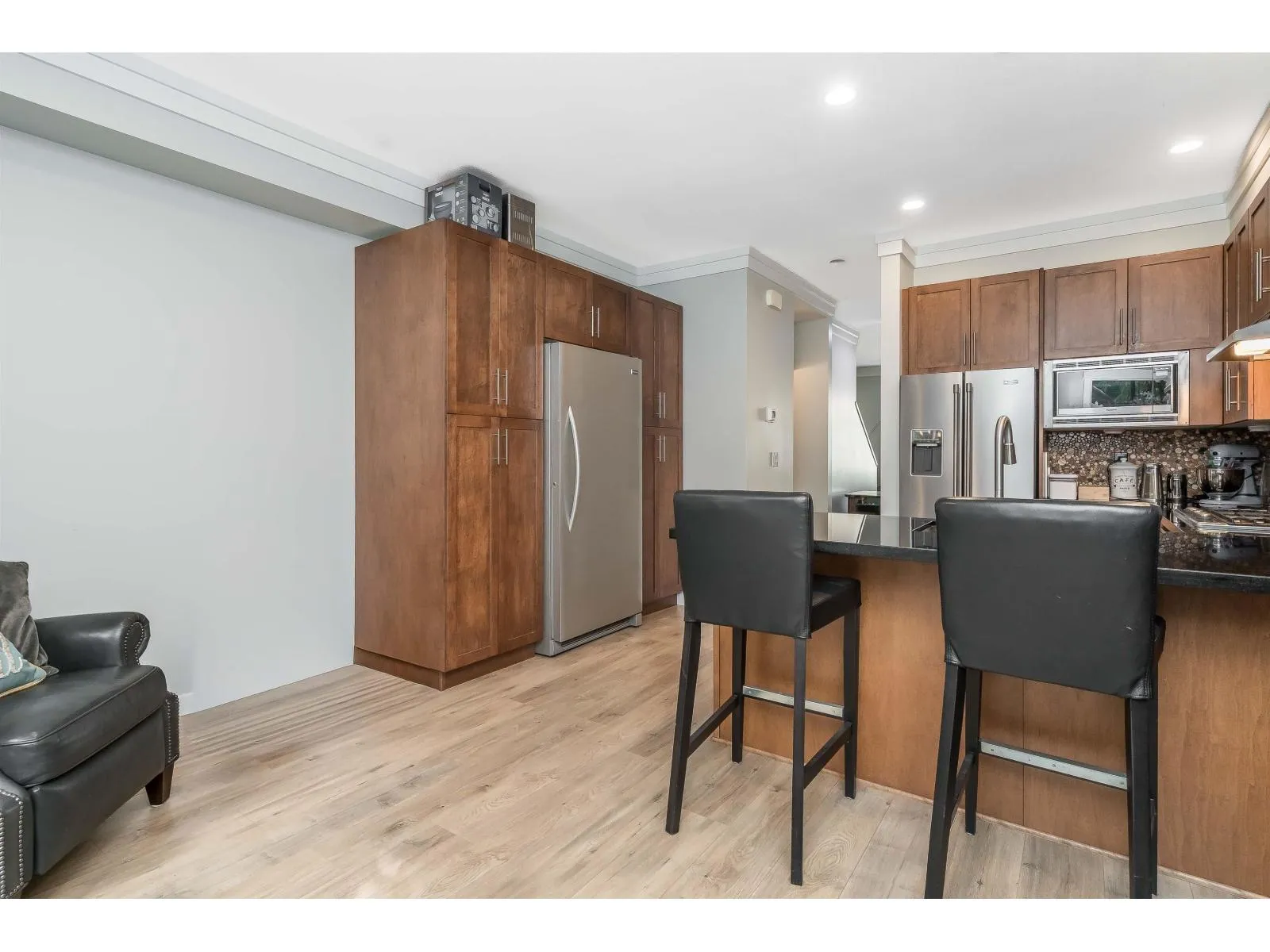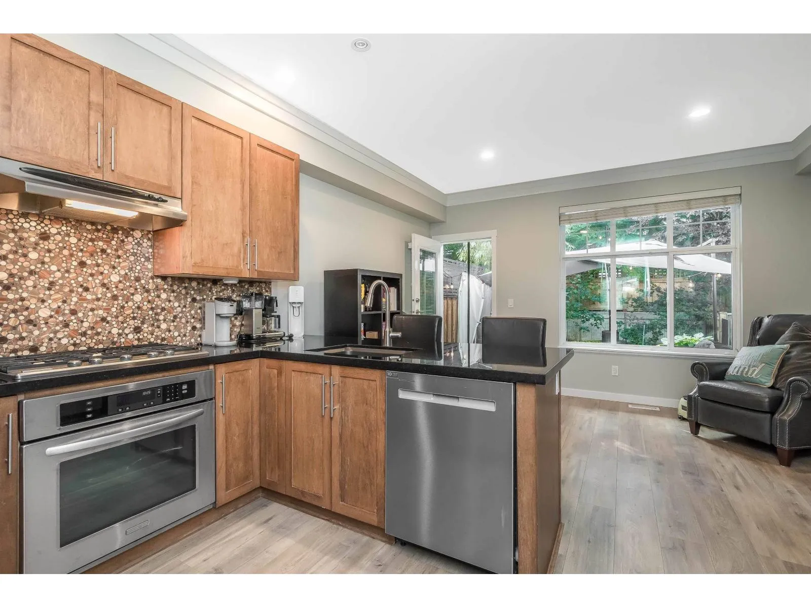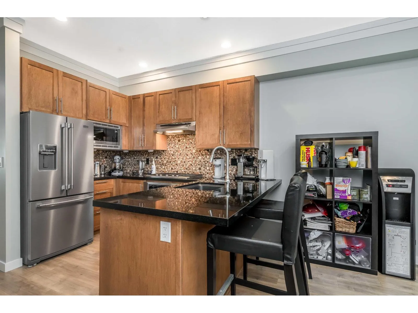 Welcome to KALLISTO! This 1,411sqft home offers 2 spacious bedrooms & 2 bathrooms. This home boasts numerous upgrades including; new vinyl plank, fresh carpet, new washer & dryer, new fridge, new dishwasher, fresh paint, new natural gas furnace, & new hot water tank. Enjoy high-end finishes throughout, including granite countertops, stainless steel appliances, custom cabinetry, crown mouldings, built-in vacuum, and EV charger. Step outside to your south-facing fenced yard with a gas BBQ hook-up complete with premium artificial turf for easy maintenance. Centrally located, just steps from Morgan Crossing shopping, Sunnyside Elementary, Southridge Private School, & numerous parks and walking trails nearby. Don't miss out on this one! (id:27476)