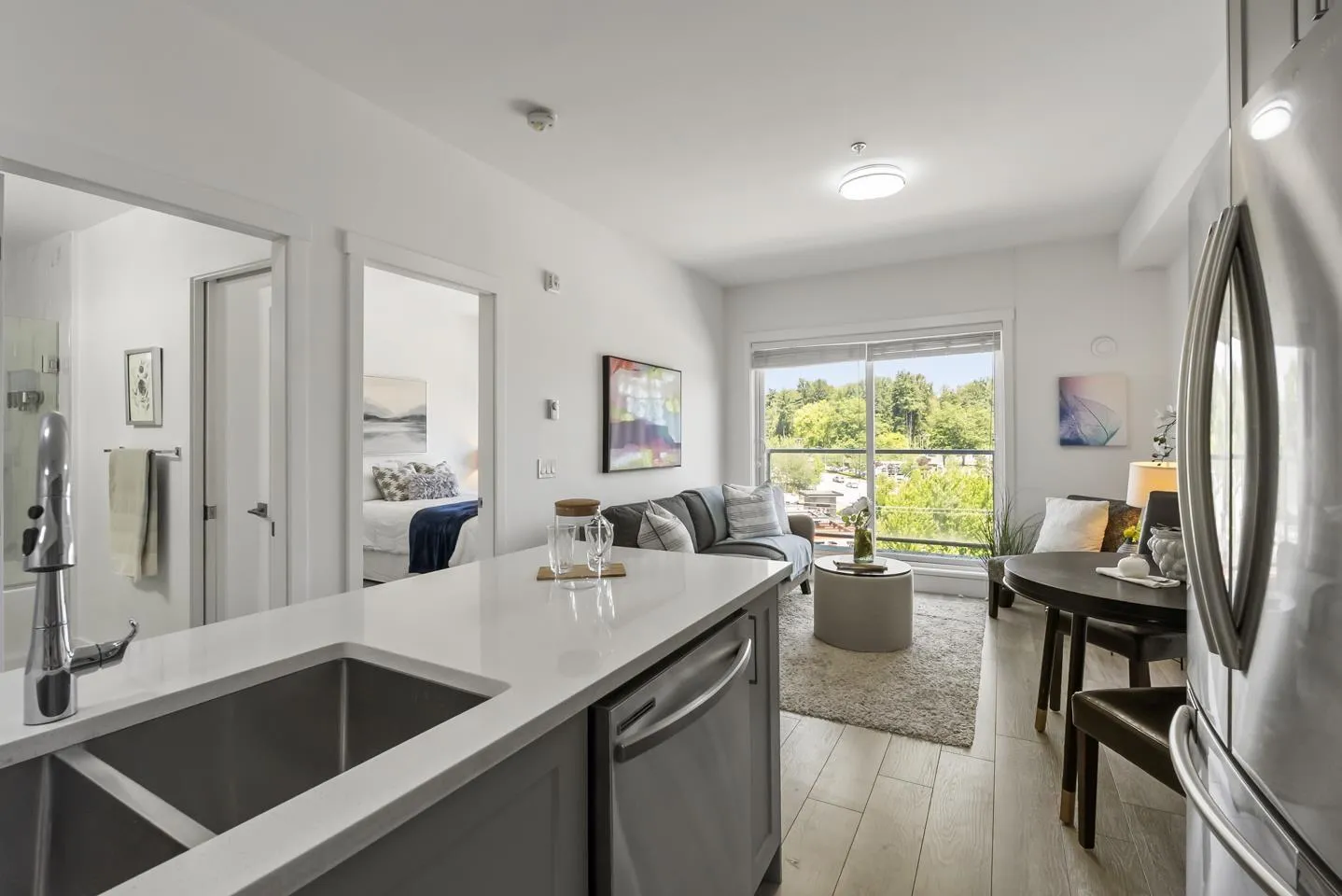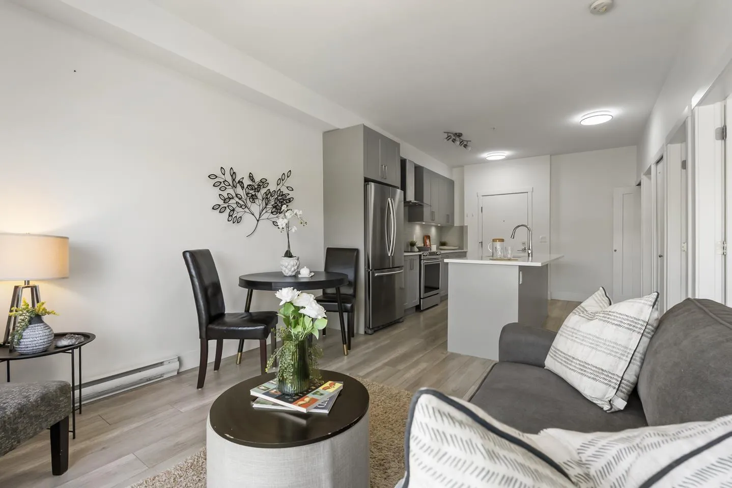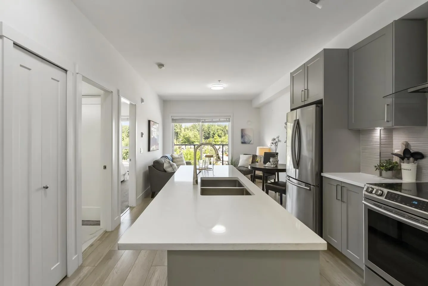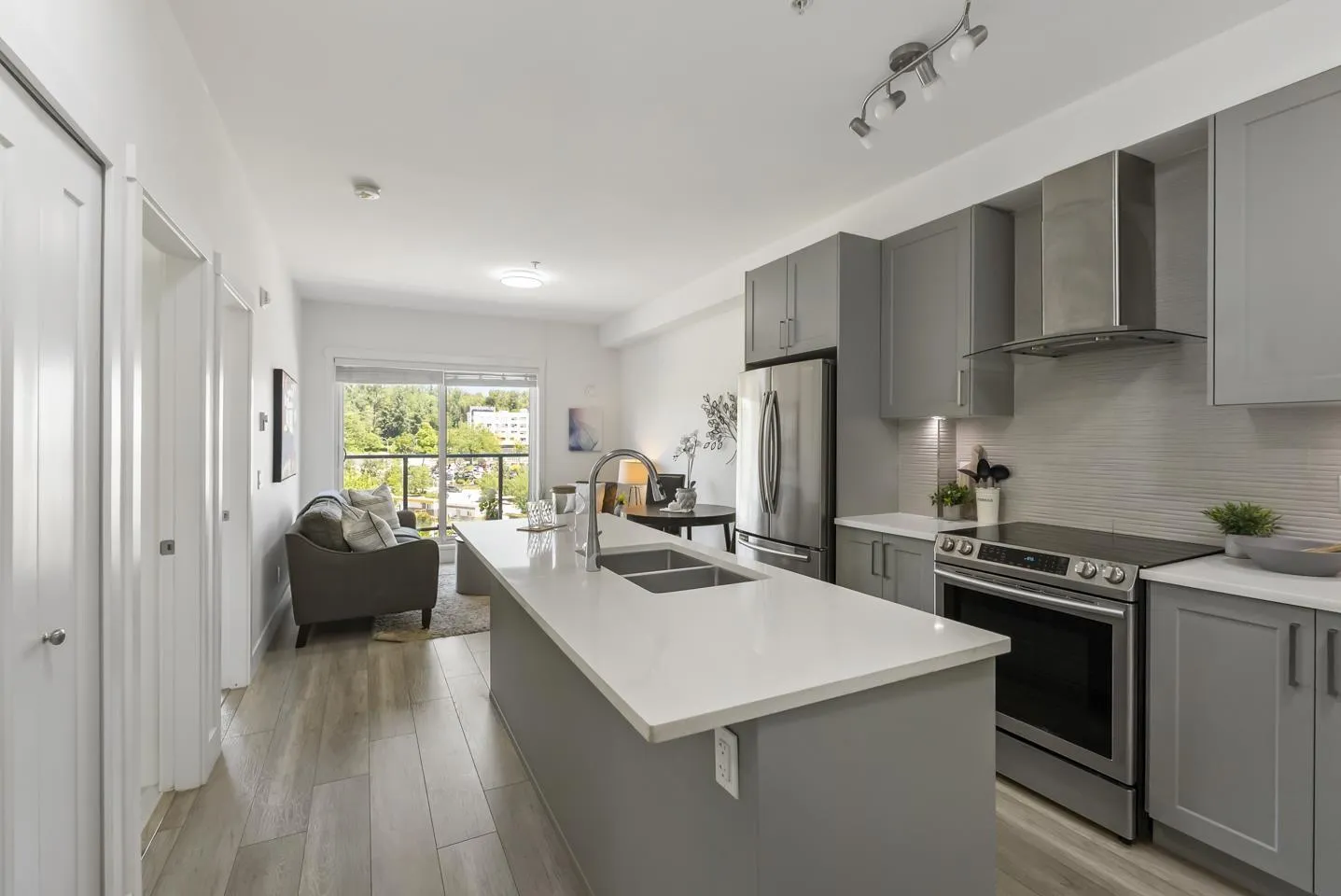 Welcome to Fraser Landmark! This modern 1 bed + junior bedroom condo unit offers 620 SF of bright, functional living just 1 minute from the future SkyTrain. It features an open layout with light-toned wood-look flooring, a sleek kitchen with quartz countertops, stainless steel appliances, and a large island. The spacious 130 SF primary bedroom has built-in closets, while the marble-inspired bath includes a glass-enclosed tub/shower. Large windows flood the space with natural light and urban views. Enjoy the outdoors on your private balcony. Bonus: 2 parking spots included! Located near shopping, dining, transit, and parks-urban living meets unbeatable convenience. (id:27476)