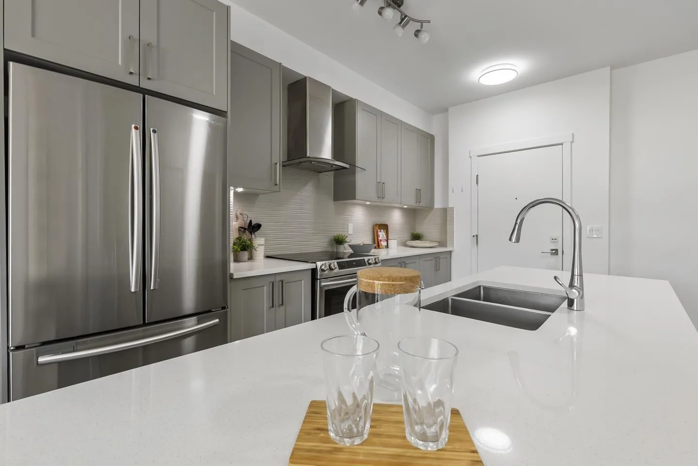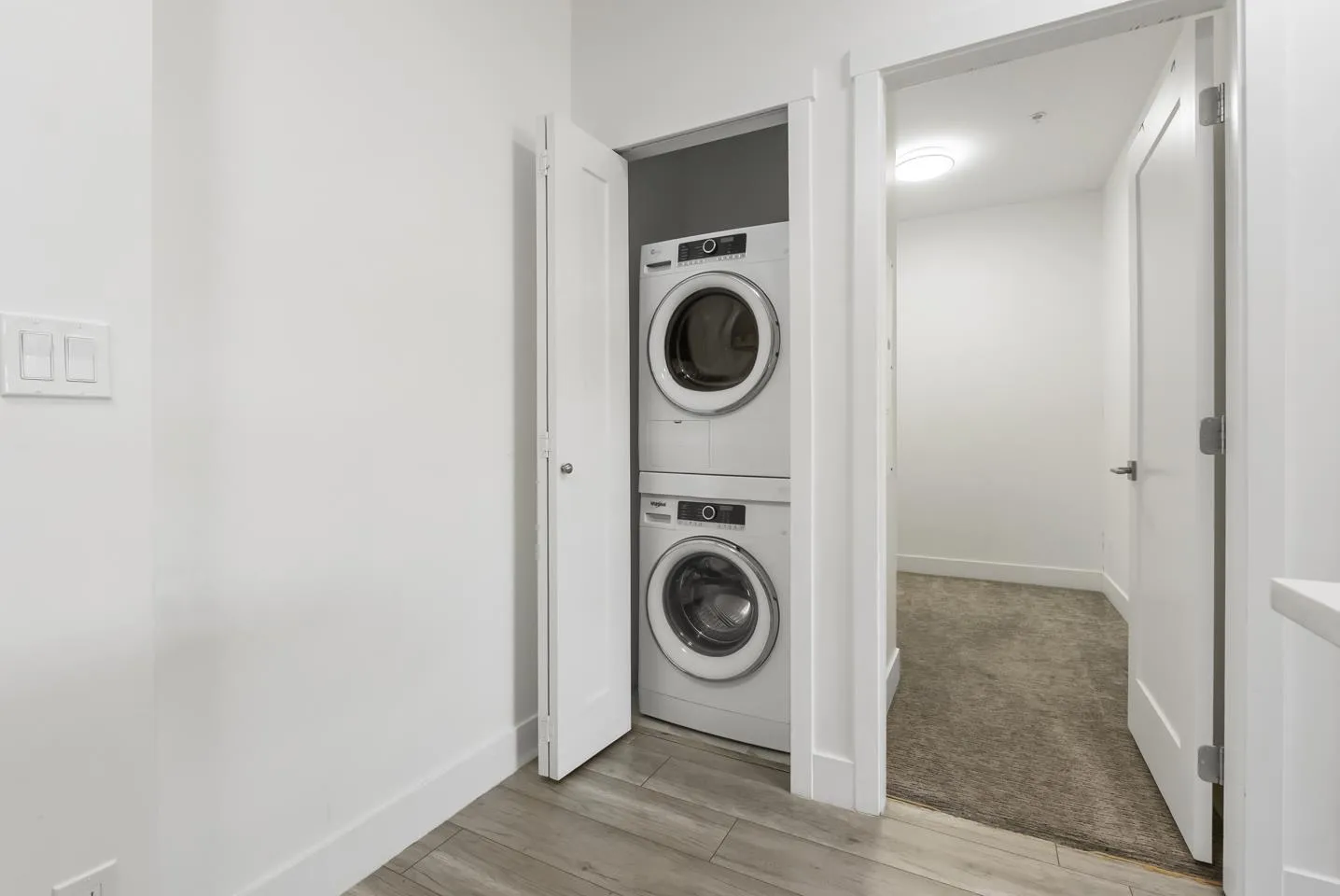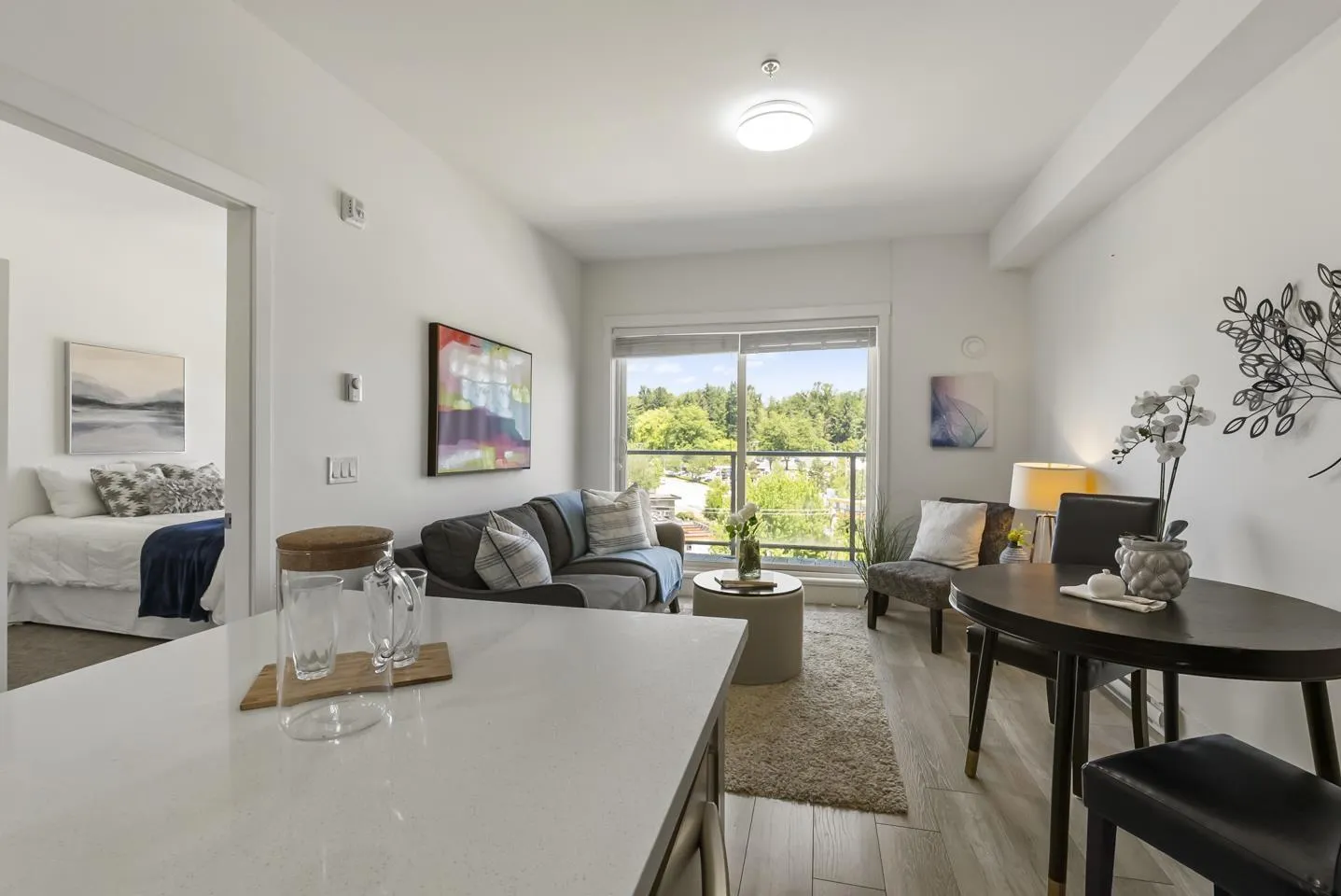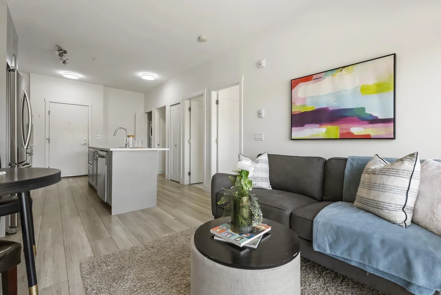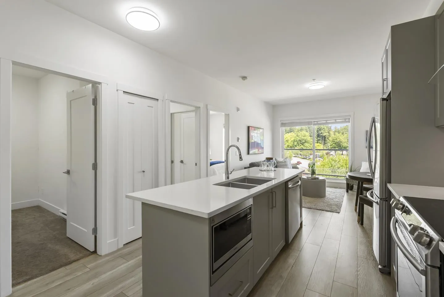 Welcome to Fraser Landmark! This modern 1 bed + junior bedroom condo unit offers 620 SF of bright, functional living just 1 minute from the future SkyTrain. It features an open layout with light-toned wood-look flooring, a sleek kitchen with quartz countertops, stainless steel appliances, and a large island. The spacious 130 SF primary bedroom has built-in closets, while the marble-inspired bath includes a glass-enclosed tub/shower. Large windows flood the space with natural light and urban views. Enjoy the outdoors on your private balcony. Bonus: 2 parking spots included! Located near shopping, dining, transit, and parks-urban living meets unbeatable convenience. (id:27476)