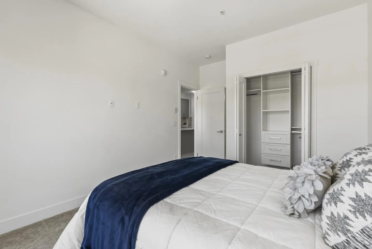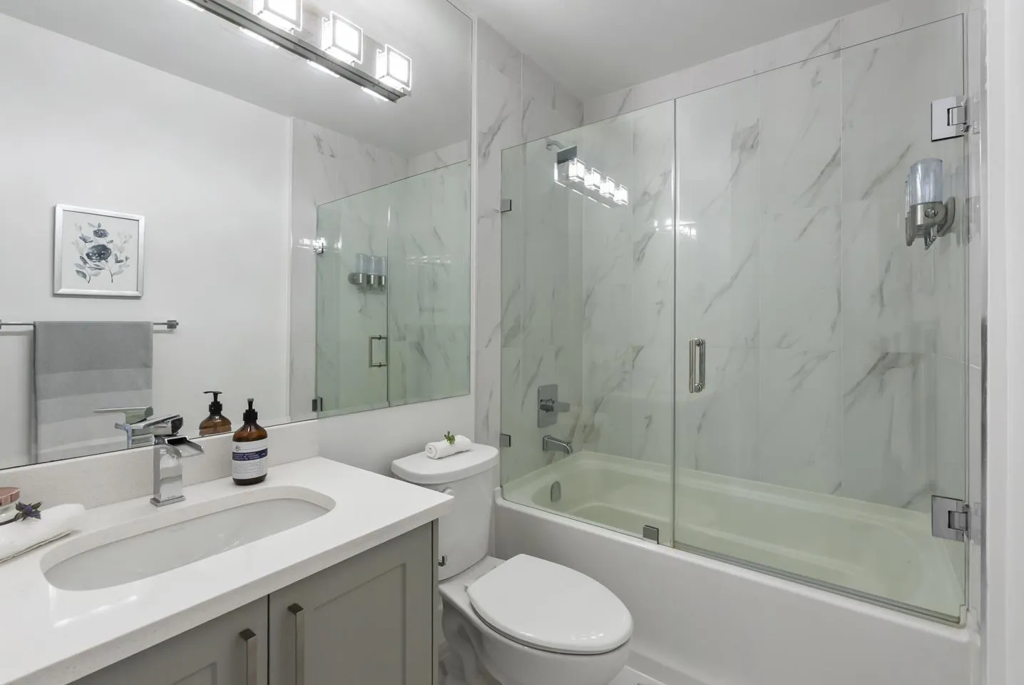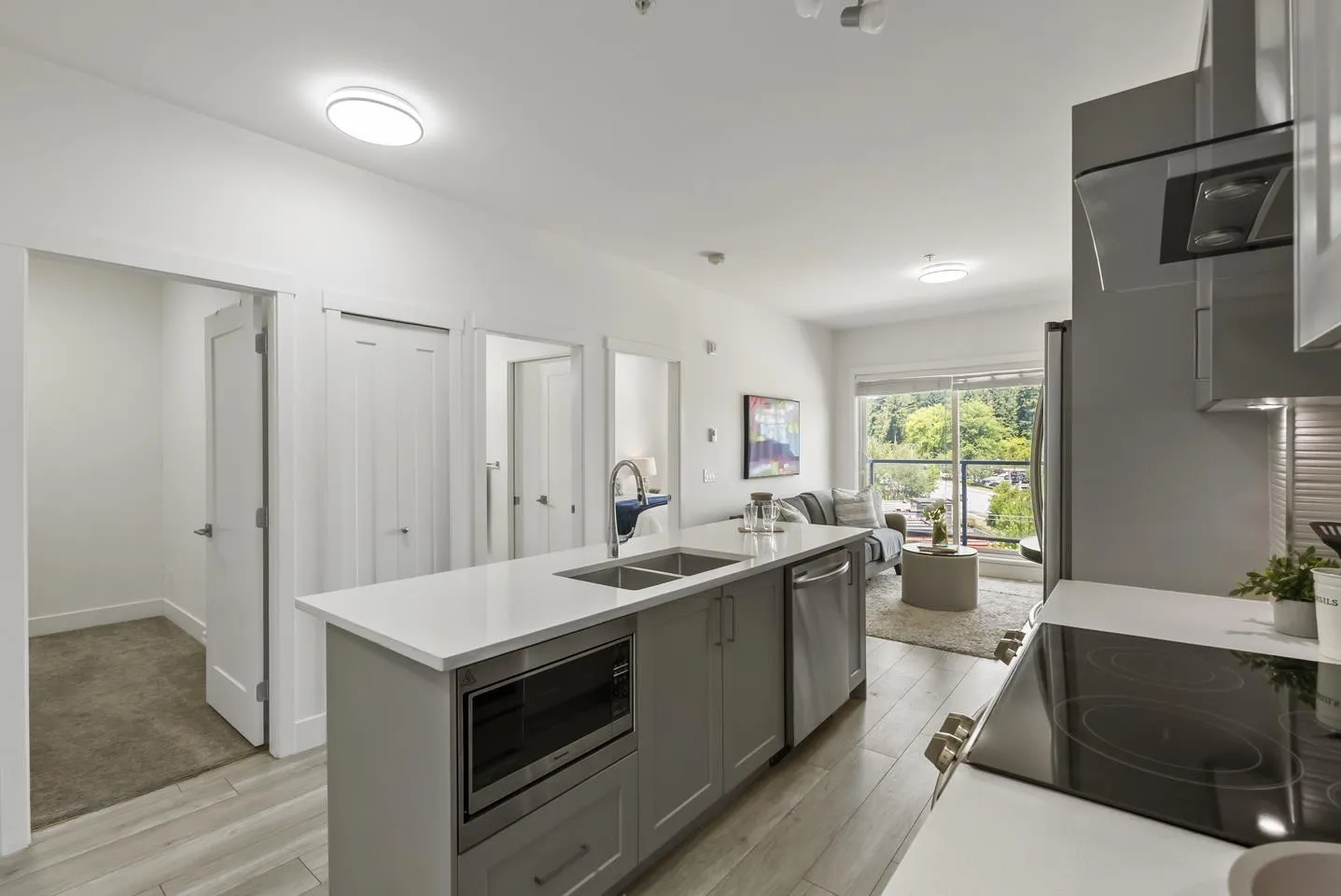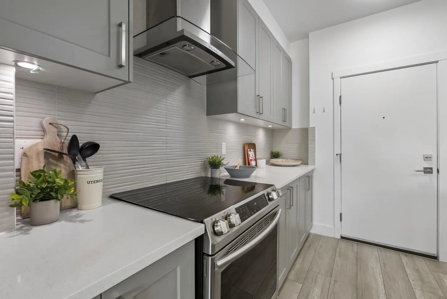 Welcome to Fraser Landmark! This modern 1 bed + junior bedroom condo unit offers 620 SF of bright, functional living just 1 minute from the future SkyTrain. It features an open layout with light-toned wood-look flooring, a sleek kitchen with quartz countertops, stainless steel appliances, and a large island. The spacious 130 SF primary bedroom has built-in closets, while the marble-inspired bath includes a glass-enclosed tub/shower. Large windows flood the space with natural light and urban views. Enjoy the outdoors on your private balcony. Bonus: 2 parking spots included! Located near shopping, dining, transit, and parks-urban living meets unbeatable convenience. (id:27476)