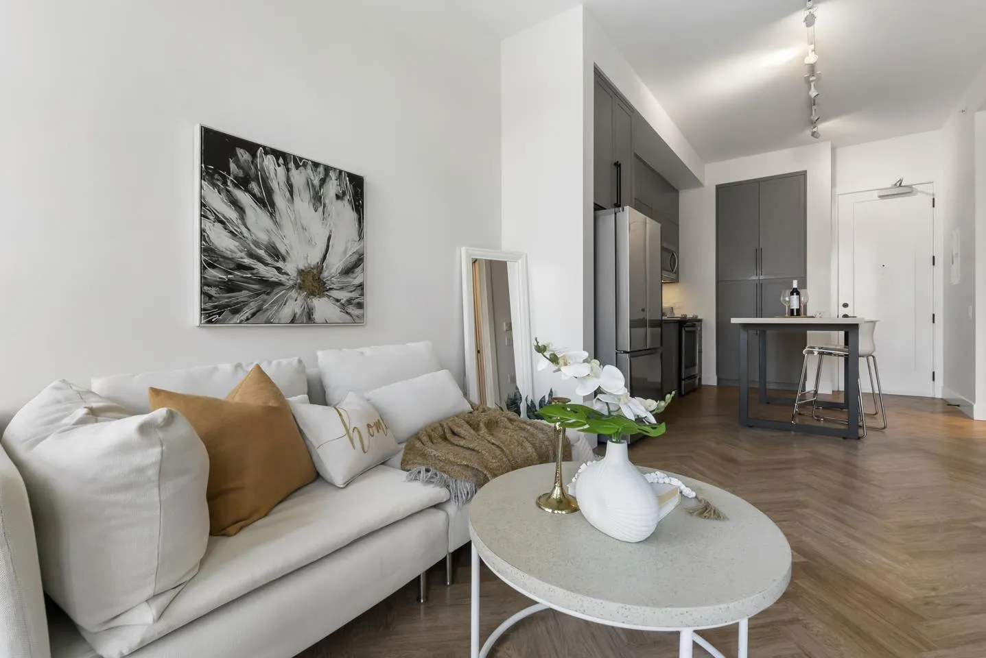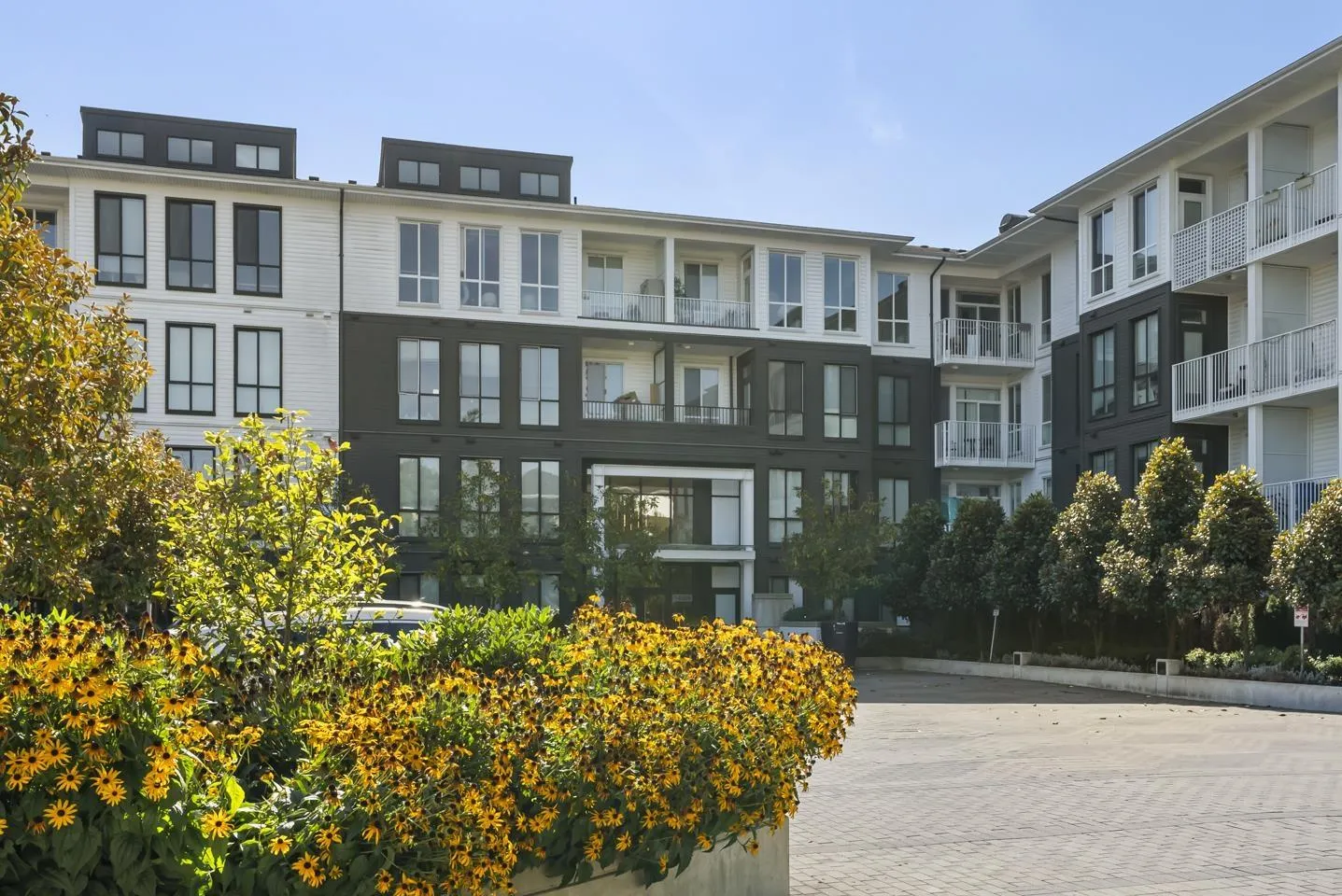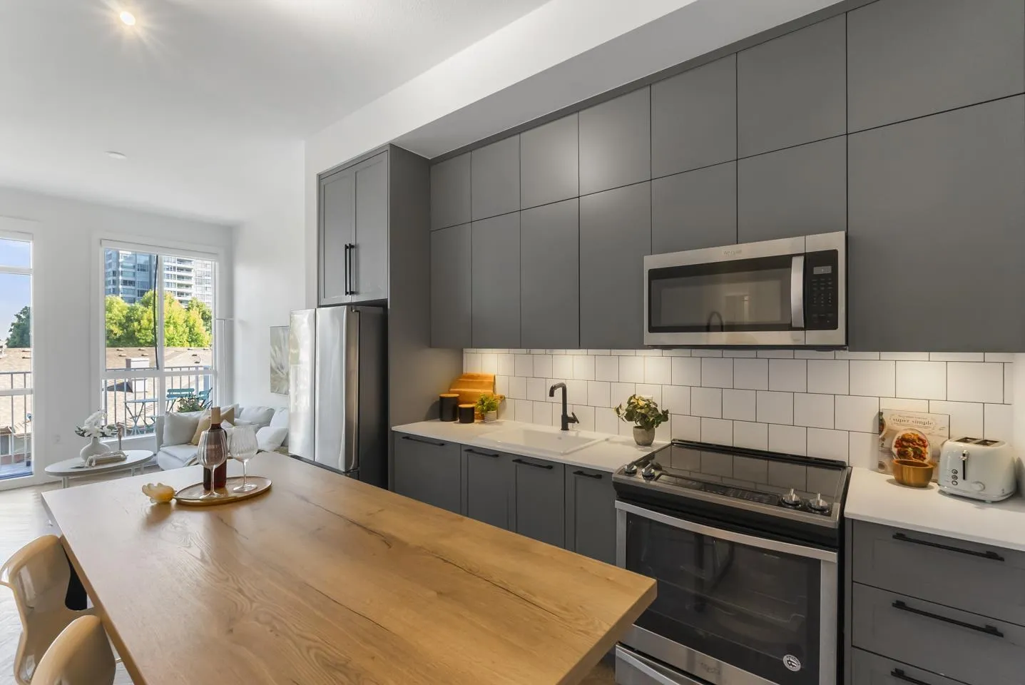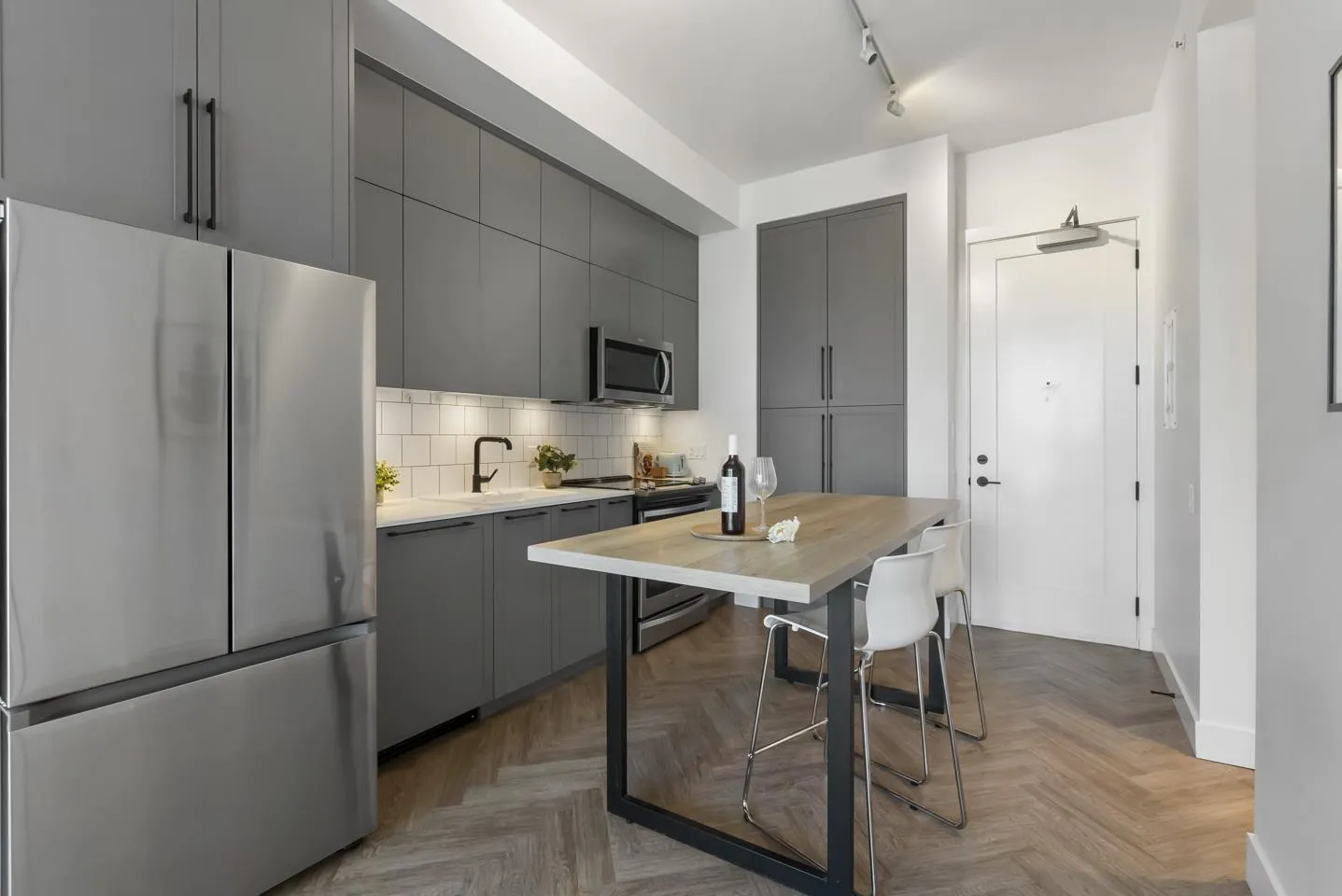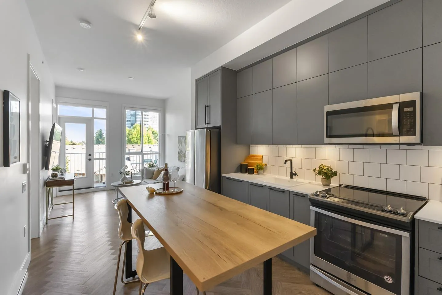 Welcome to Guildhouse by Mosaic! This bright and stylish top-floor home offers 567 sq. ft. of thoughtfully designed living. Meticulously cared for, the space feels like new with tasteful updates and attention to detail. The open layout is enhanced by soaring ceilings, oversized windows, and premium herringbone flooring that adds a touch of elegance. The kitchen features modern cabinetry, stainless steel appliances, and plenty of counter space, while the bedroom is spacious and private. Situated on the quiet side of the building, this home is a peaceful retreat yet steps from Guildford Town Centre, transit, dining, and everyday conveniences. A rare opportunity to own a top-floor residence that blends comfort, style, and unbeatable location in the heart of Guildford. (id:27476)