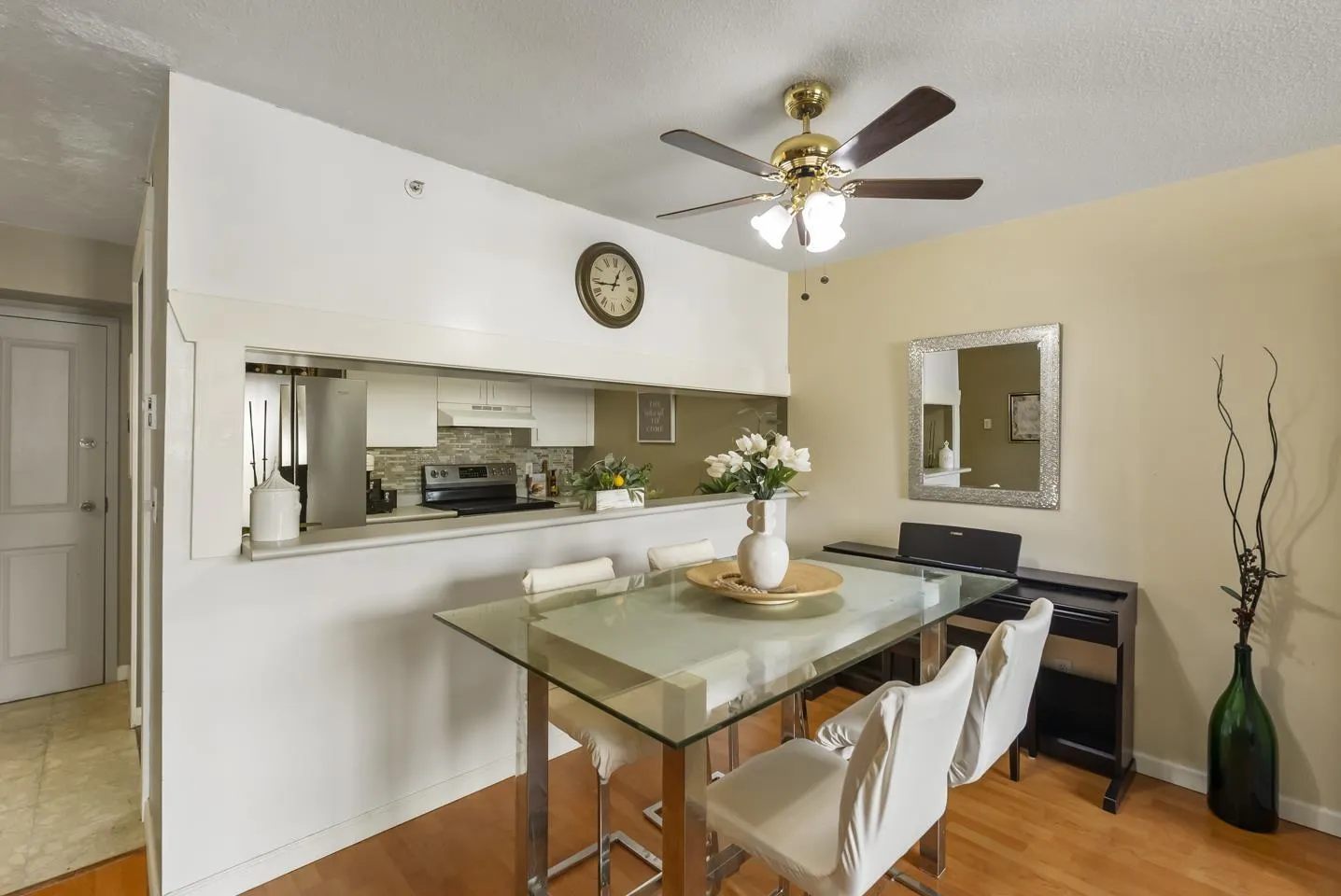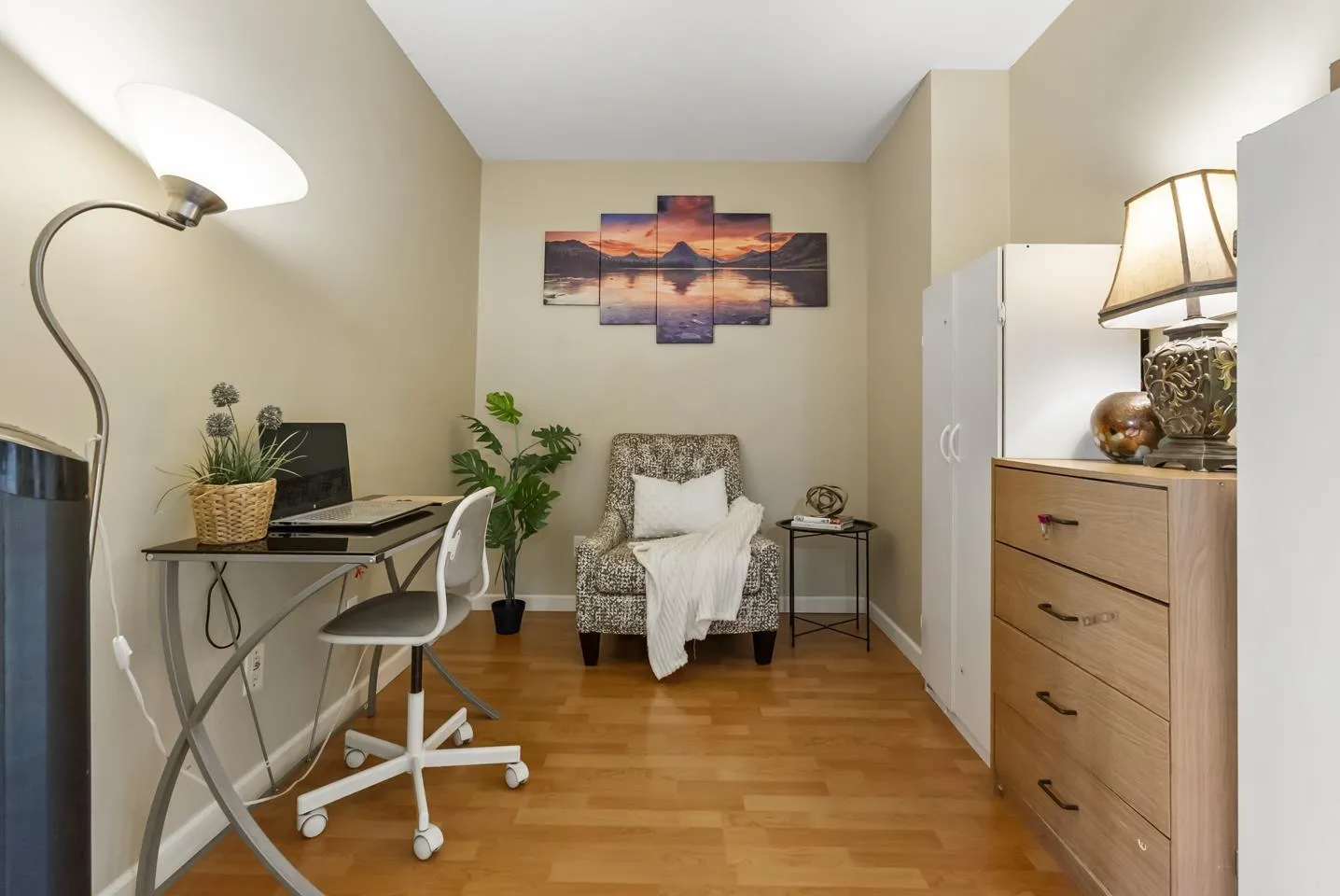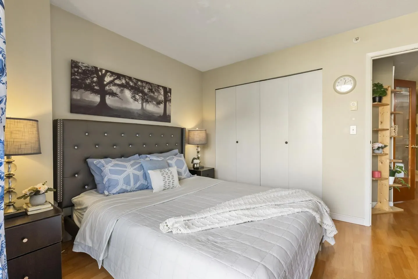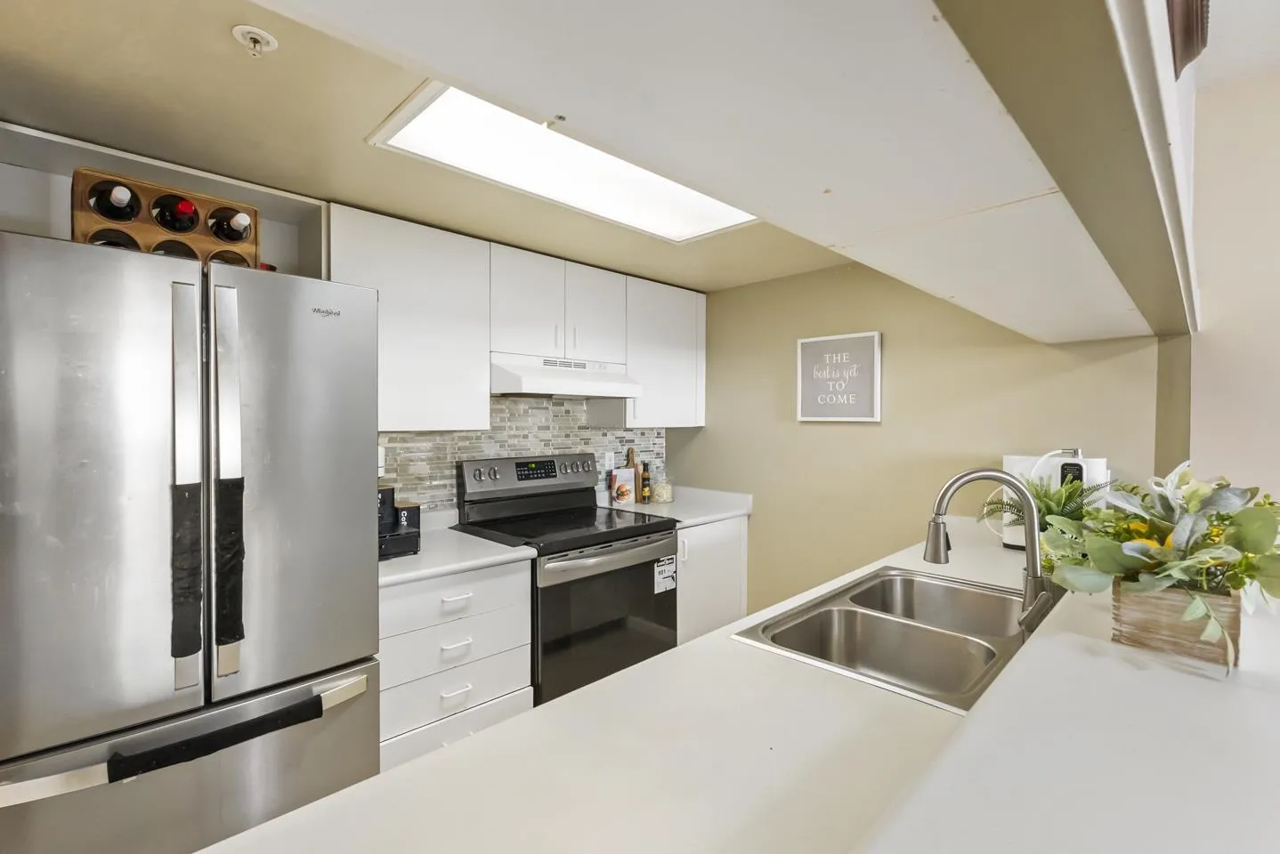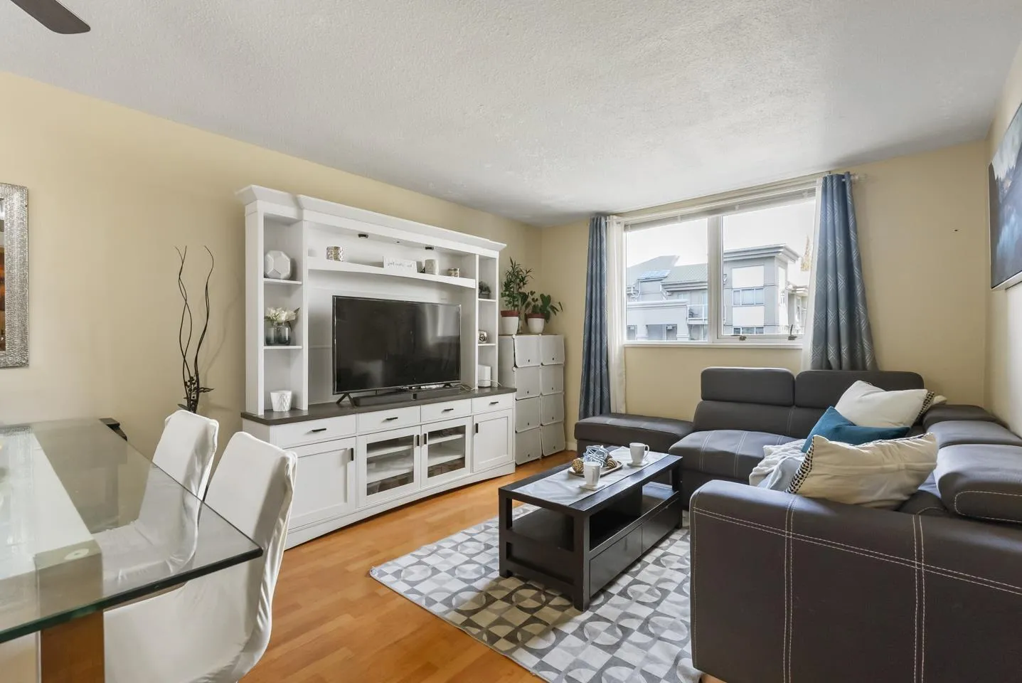Functional Jr. 2 BR 1BTH Downtown Surrey Condo. Centrally located, this upper-level home boasts versatility & convenience. The kitchen features a stainless steel fridge & stove w/ a pass-through window. Flowing w/ laminate flooring, the grand room comfortably fits a dining top while having ample entertainment space to host guests or relax. Oversized windows illuminate the primary (bonus: private balcony) while a sizeable secondary room (w/ sprinkler) can be used as a bedroom, home office, or extra storage space. Everyday living is simplified w/ a 4 pc. bathroom, in-suite laundry, 1 underground parking spot & 1 storage locker. Fabulously located near Central City Mall, SkyTrain Stations, Bus Stops, & Various Amenities/Shops Within Walking Distance. (id:27476)