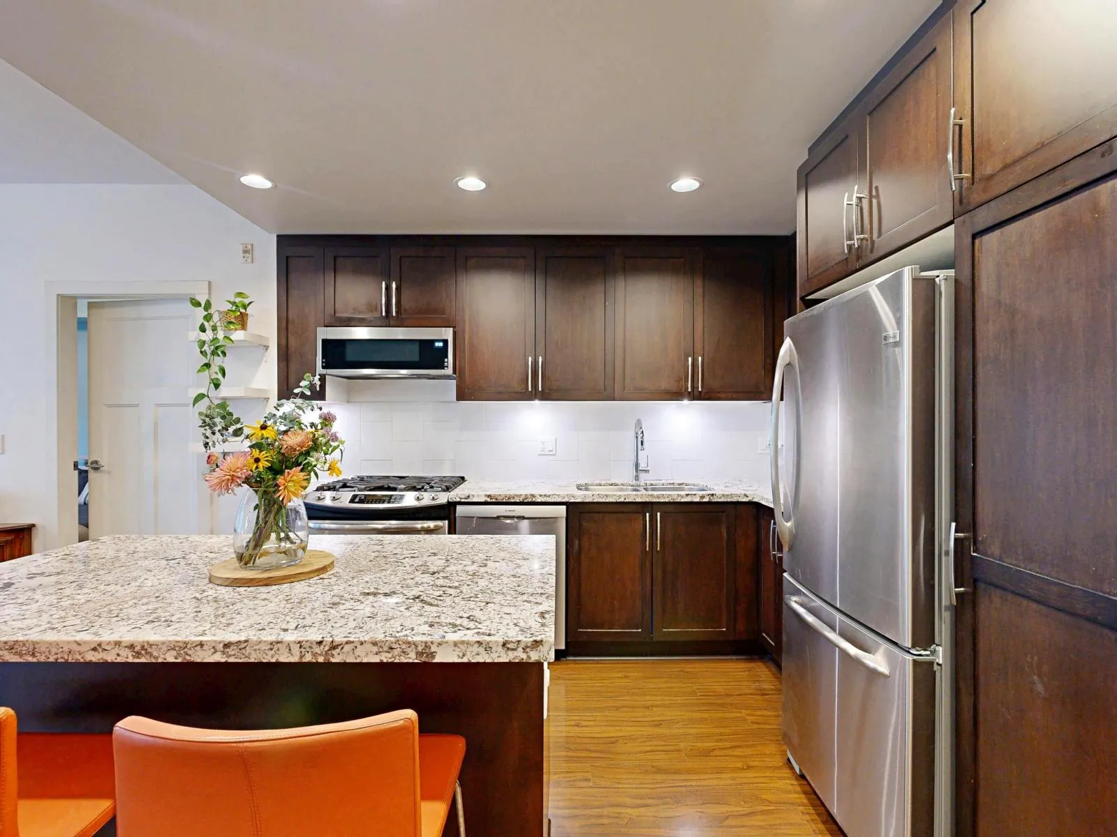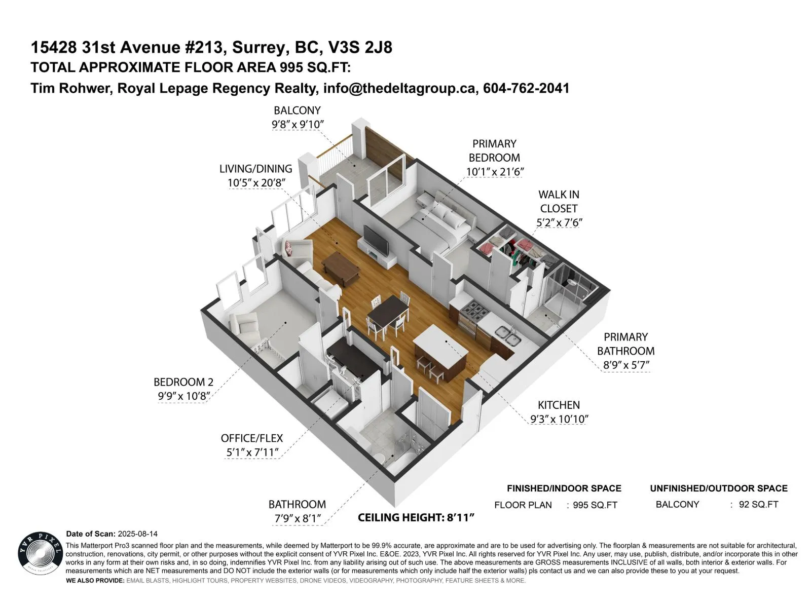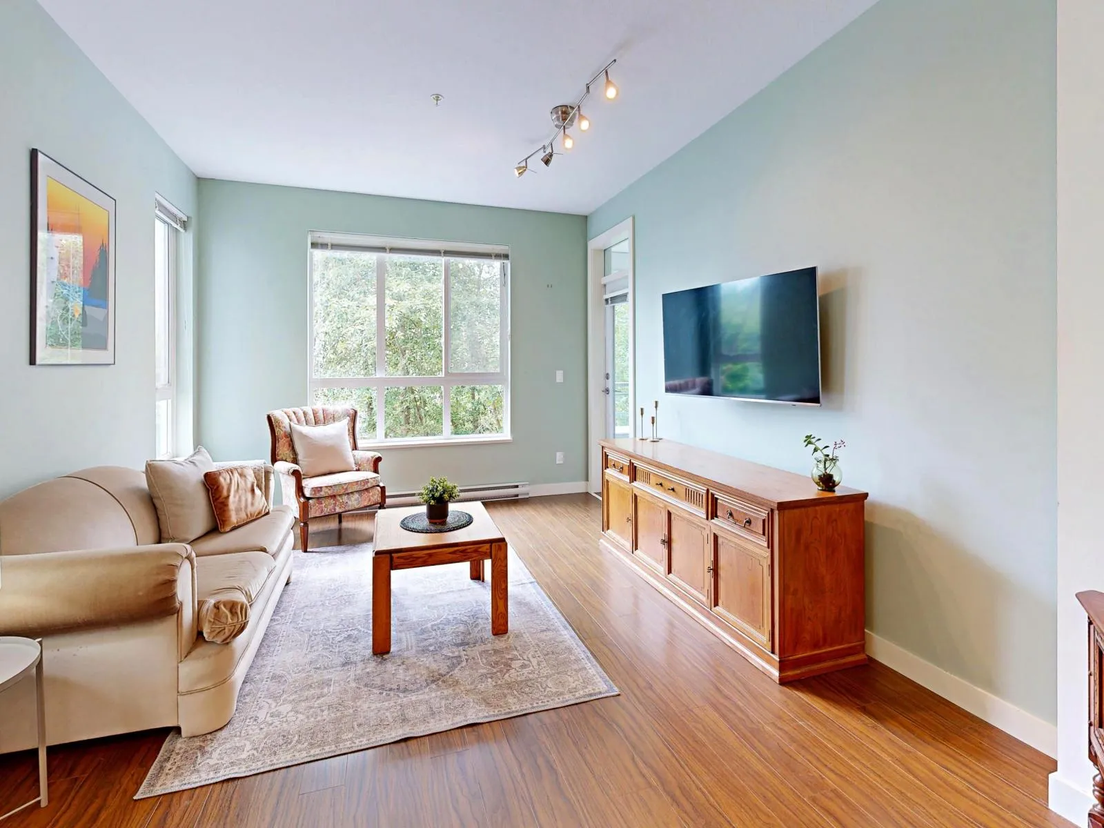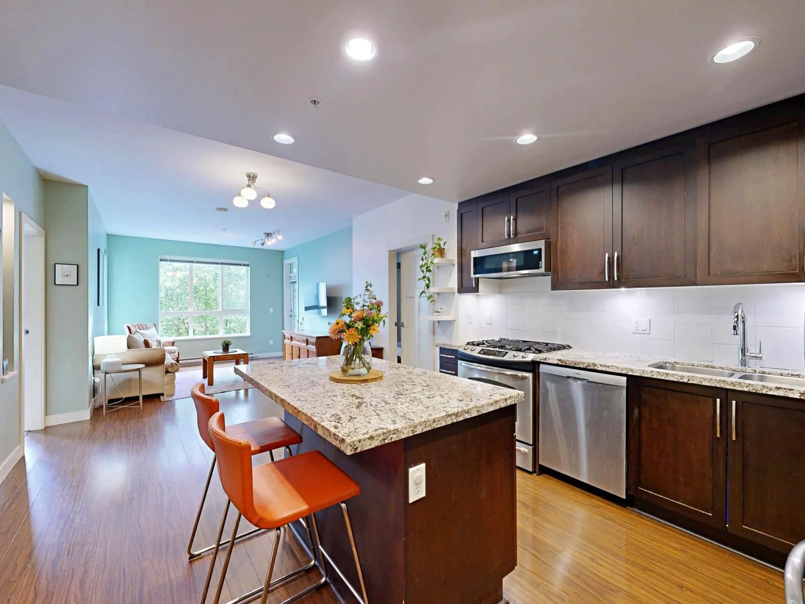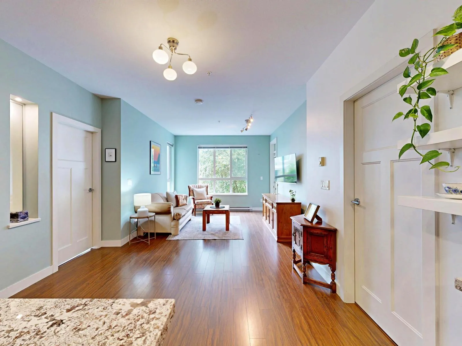 HEADWATERS 2 bdrm 2 bath 995 sq ft condo in the heart of S. Surrey, offers luxury living at the best price in the development. Enjoy a private & quiet outlook onto a greenbelt, oversized windows filling the home with natural light. The open-concept kitchen features granite countertops, SS appliances, a gas stove and ample storage. Both bedrooms are generously sized with their own ensuites, including a walk-in closet in the primary and a built-in workstation in the second, perfect for a home office. Additional highlights include two secured parking stalls, a well appointed gym, and a business centre with rentable rooms. Situated in a well managed strata, this home is just minutes to shopping, community centres, schools, parks, 12 minutes to the beach & 3 minutes to HWY 99. (id:27476)