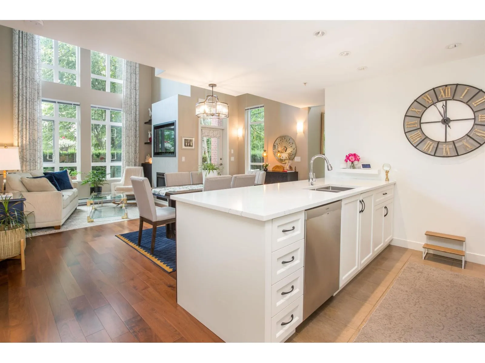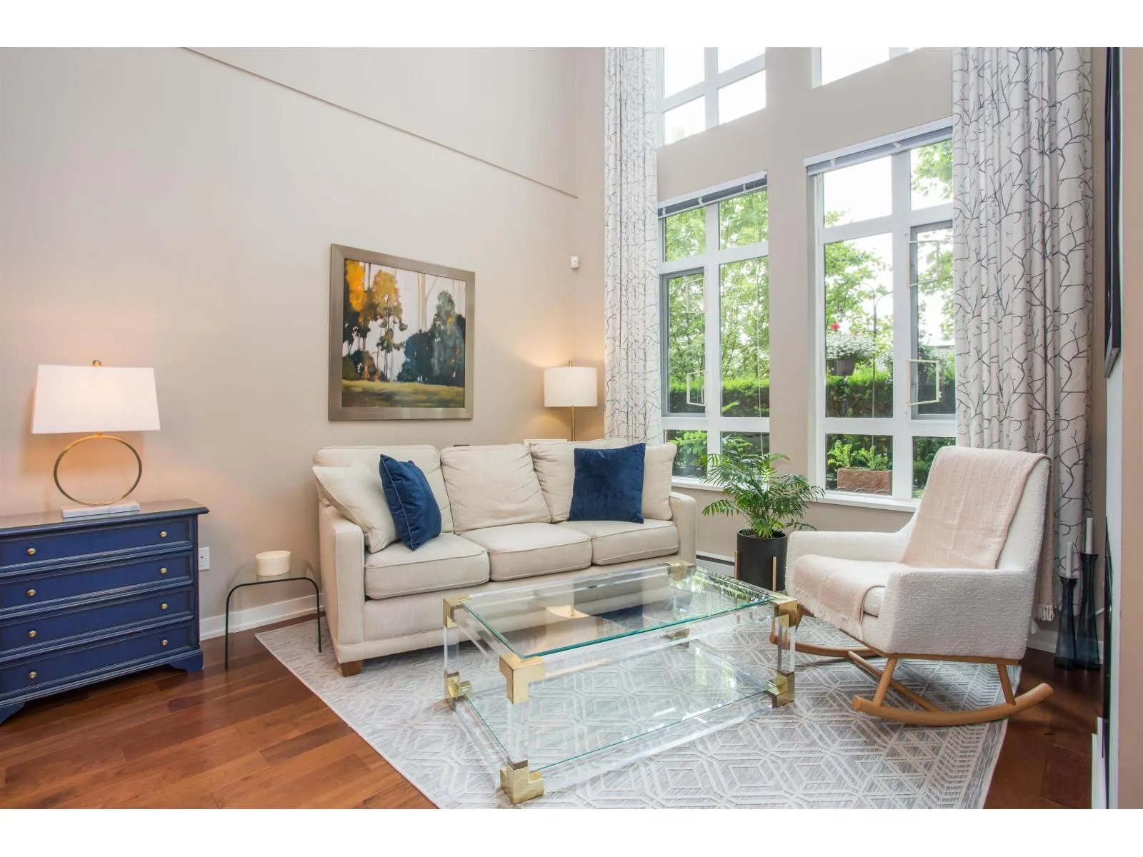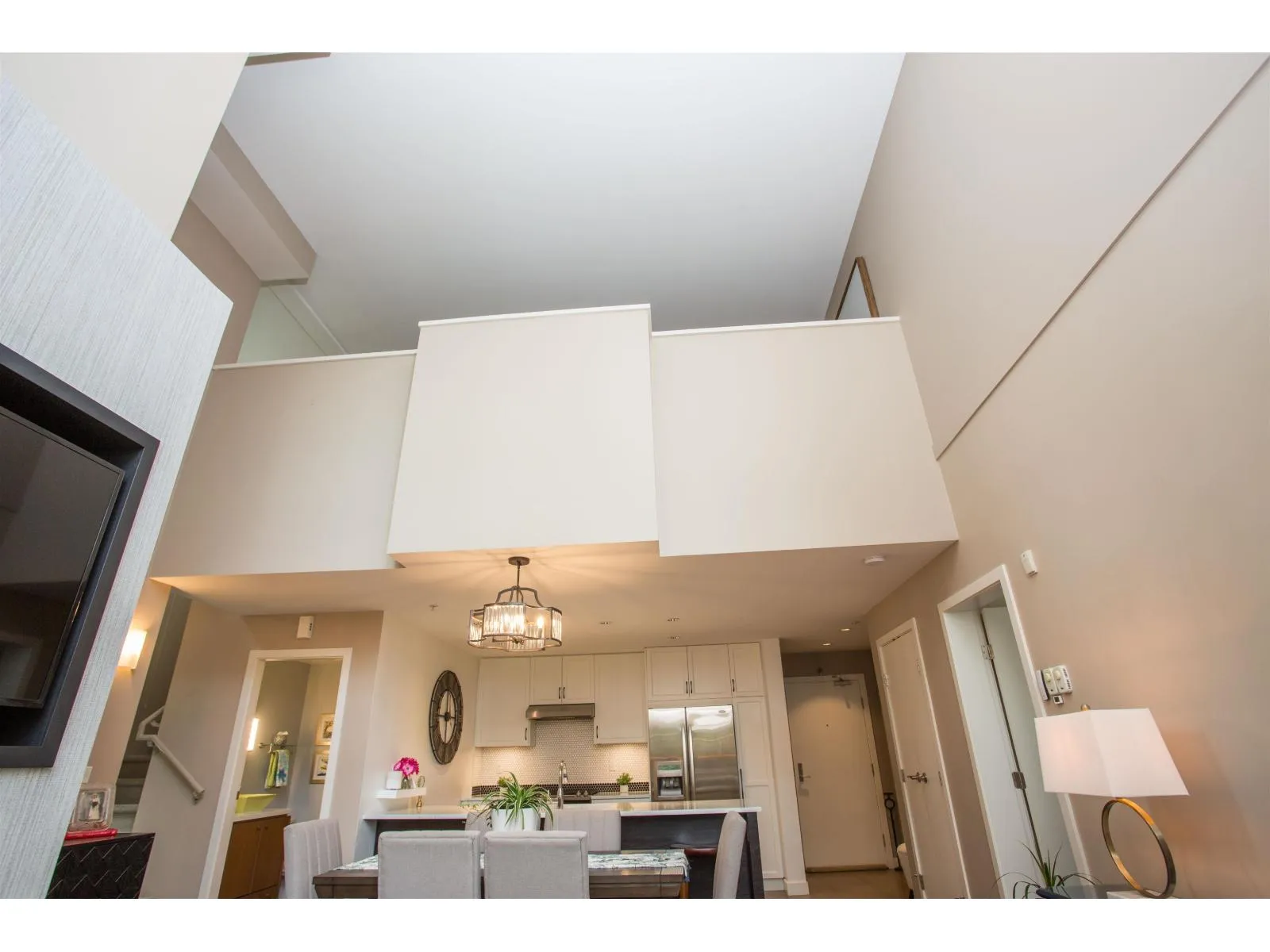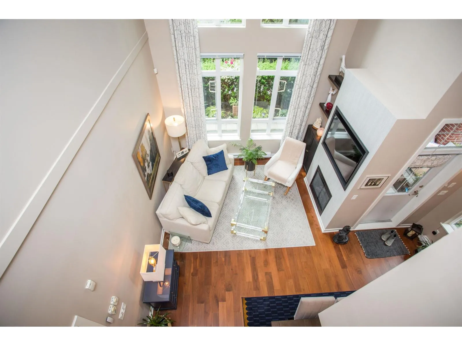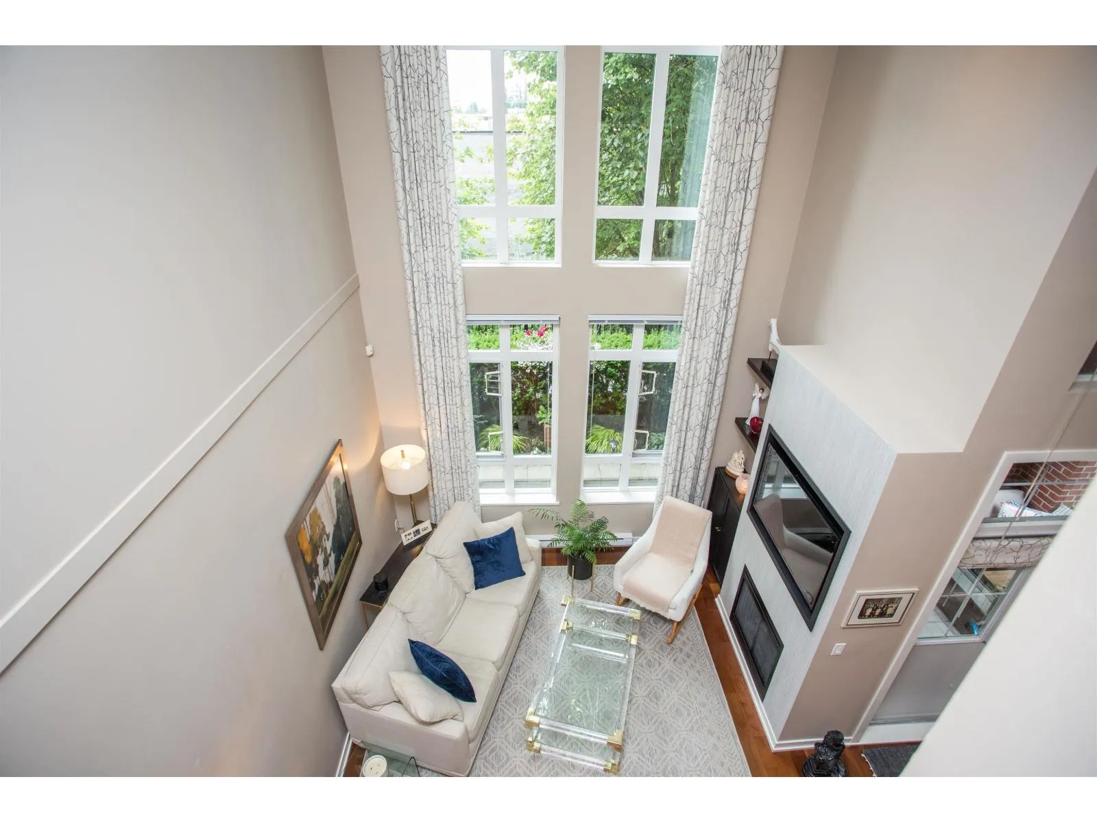 High Street loft condo! Rare 2 level MASTER on the MAIN end unit condo w/over 1400 sq ft. Spacious living room has beautiful 17 ft vaulted ceilings accented with floor to ceiling windows complete with custom motorized curtains. Large private covered PATIO. Bathrooms & kitchen tastefully RENOVATED w/quartz & granite counters. Entertainers kitchen w/ high end appliances,soft close custom cabinets,designer back splash & bar counter with extra seating +Large pantry! Upstairs has 1 bedroom and bath, as well as large open LOFT that could be used as a family rm, spacious office,or Den. Excellent location away from King George on private side of building w/ shopping,coffee shop,grocery store,restaurants,transit all under 5 min walk. 2 parking stalls, 1 storage locker. (id:27476)