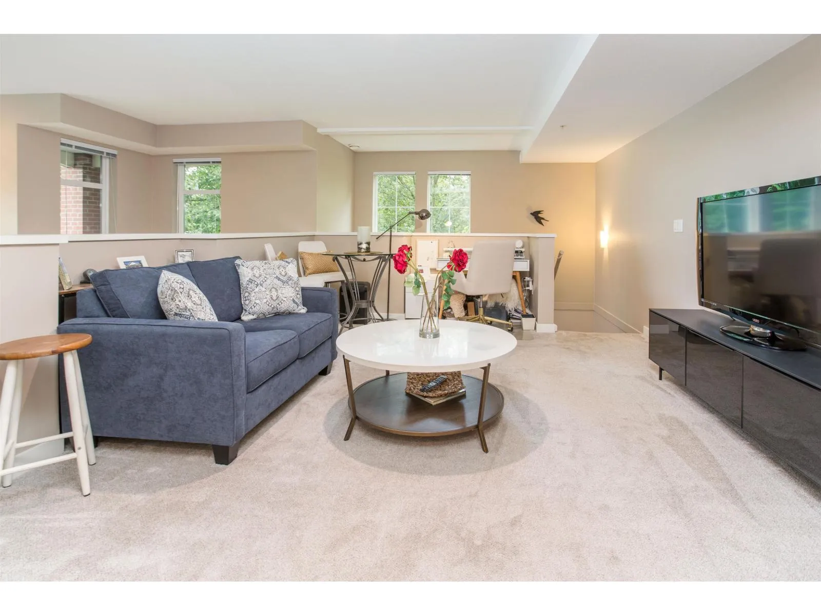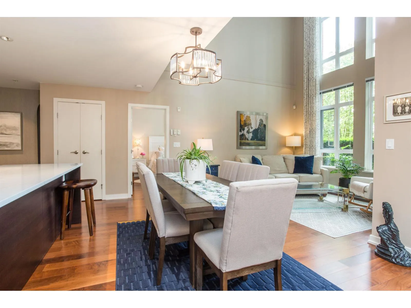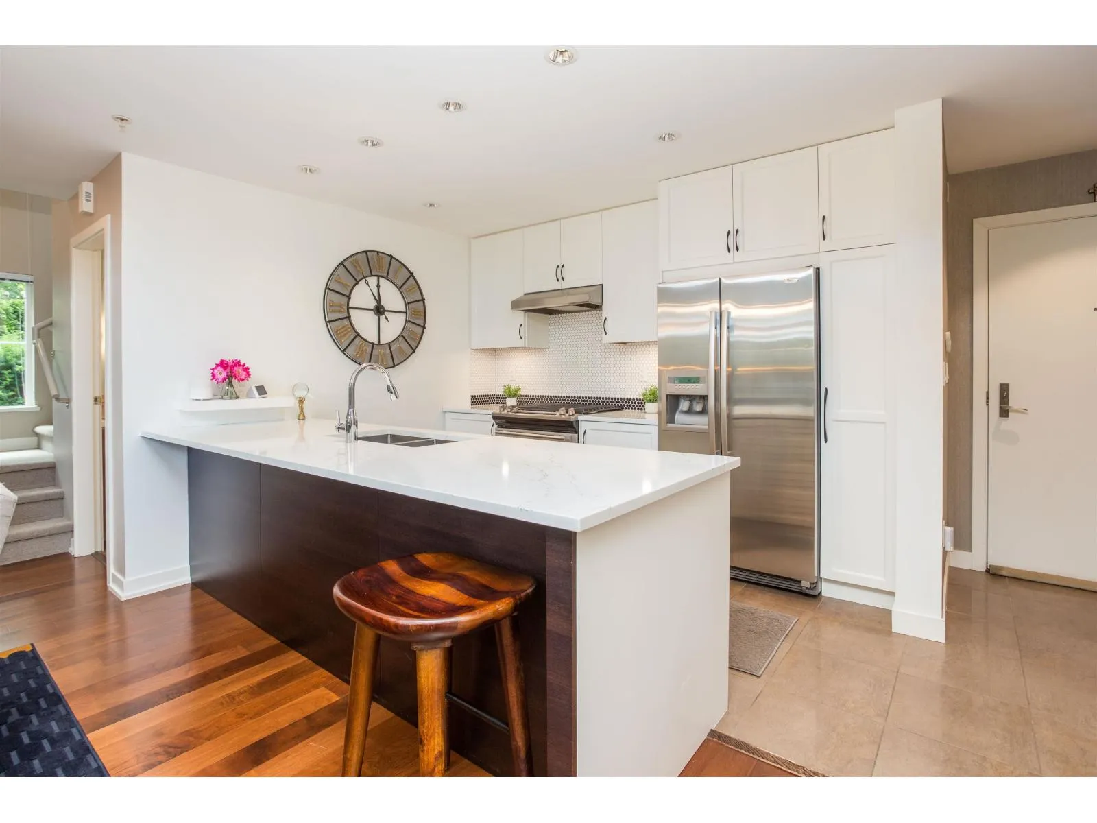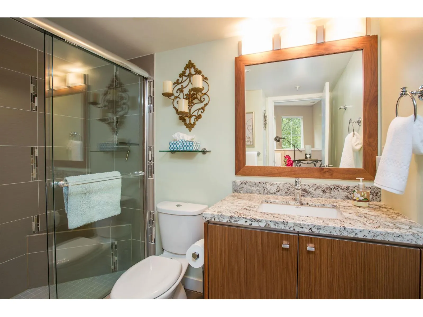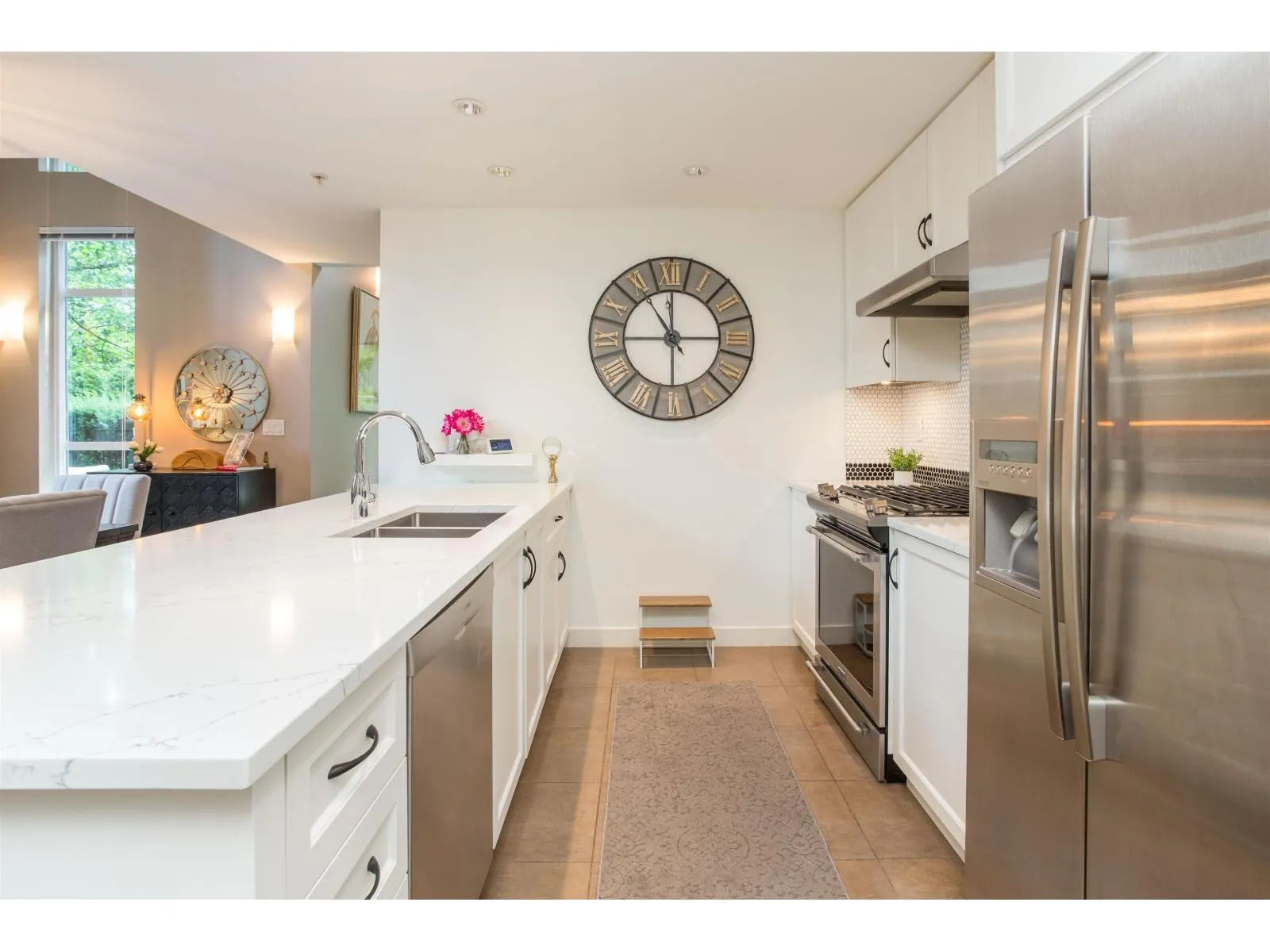 High Street loft condo! Rare 2 level MASTER on the MAIN end unit condo w/over 1400 sq ft. Spacious living room has beautiful 17 ft vaulted ceilings accented with floor to ceiling windows complete with custom motorized curtains. Large private covered PATIO. Bathrooms & kitchen tastefully RENOVATED w/quartz & granite counters. Entertainers kitchen w/ high end appliances,soft close custom cabinets,designer back splash & bar counter with extra seating +Large pantry! Upstairs has 1 bedroom and bath, as well as large open LOFT that could be used as a family rm, spacious office,or Den. Excellent location away from King George on private side of building w/ shopping,coffee shop,grocery store,restaurants,transit all under 5 min walk. 2 parking stalls, 1 storage locker. (id:27476)