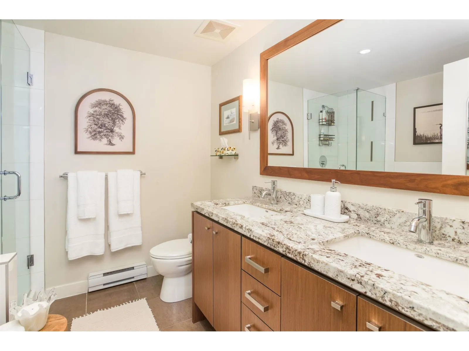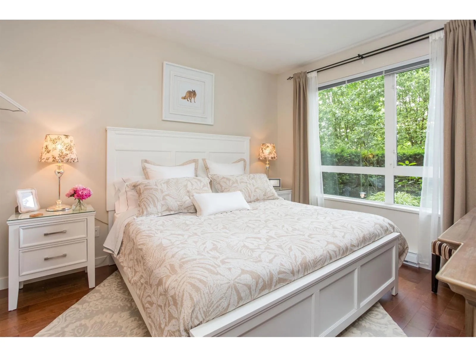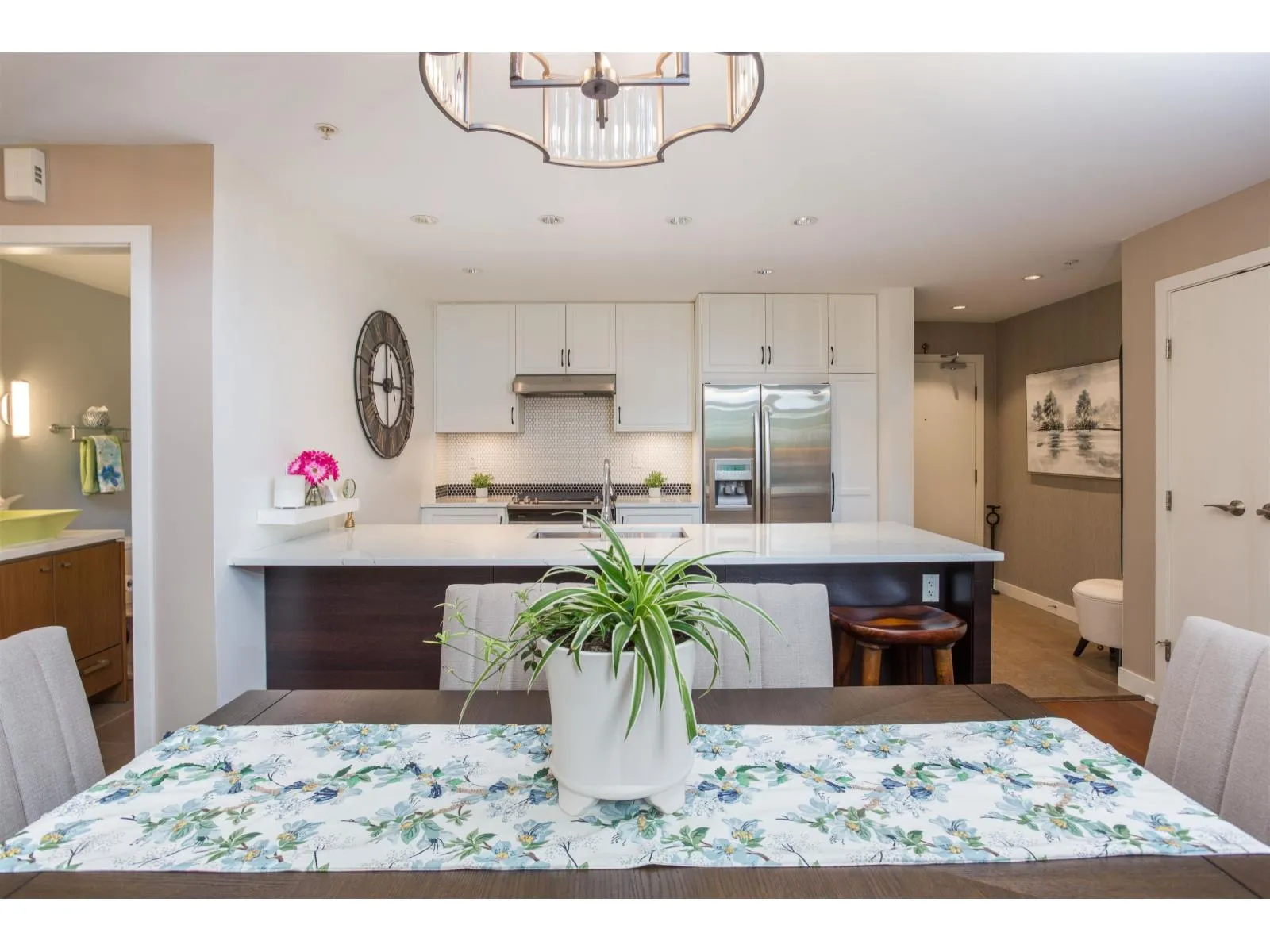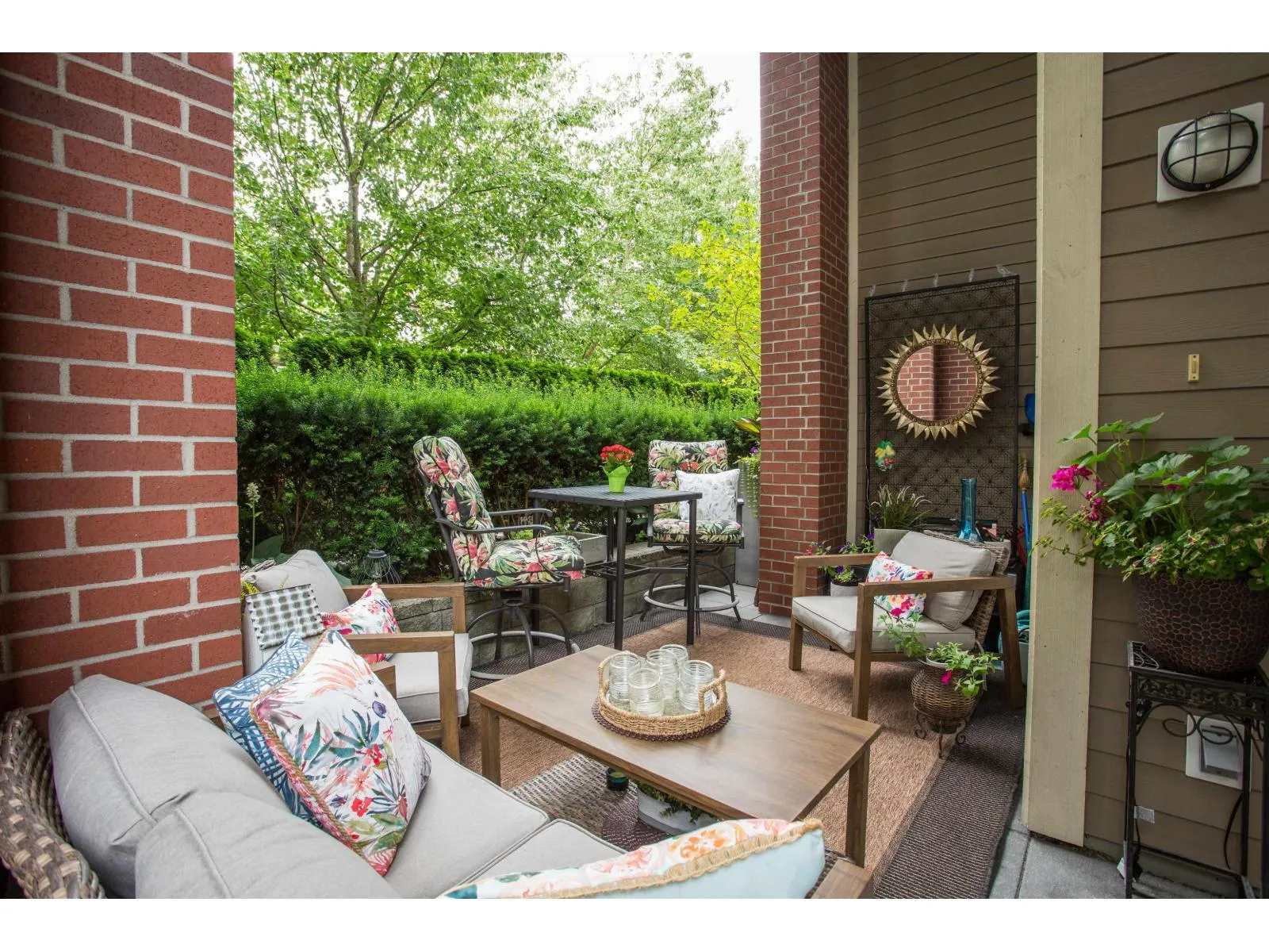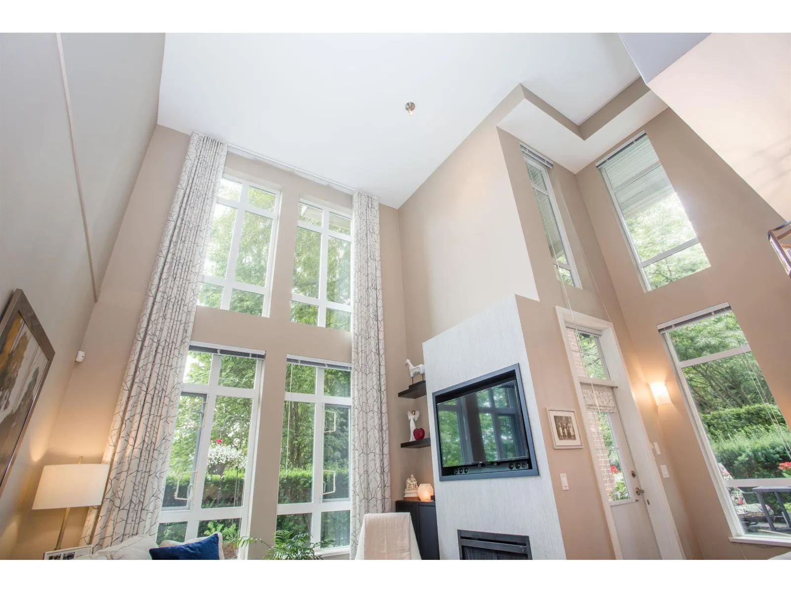 High Street loft condo! Rare 2 level MASTER on the MAIN end unit condo w/over 1400 sq ft. Spacious living room has beautiful 17 ft vaulted ceilings accented with floor to ceiling windows complete with custom motorized curtains. Large private covered PATIO. Bathrooms & kitchen tastefully RENOVATED w/quartz & granite counters. Entertainers kitchen w/ high end appliances,soft close custom cabinets,designer back splash & bar counter with extra seating +Large pantry! Upstairs has 1 bedroom and bath, as well as large open LOFT that could be used as a family rm, spacious office,or Den. Excellent location away from King George on private side of building w/ shopping,coffee shop,grocery store,restaurants,transit all under 5 min walk. 2 parking stalls, 1 storage locker. (id:27476)