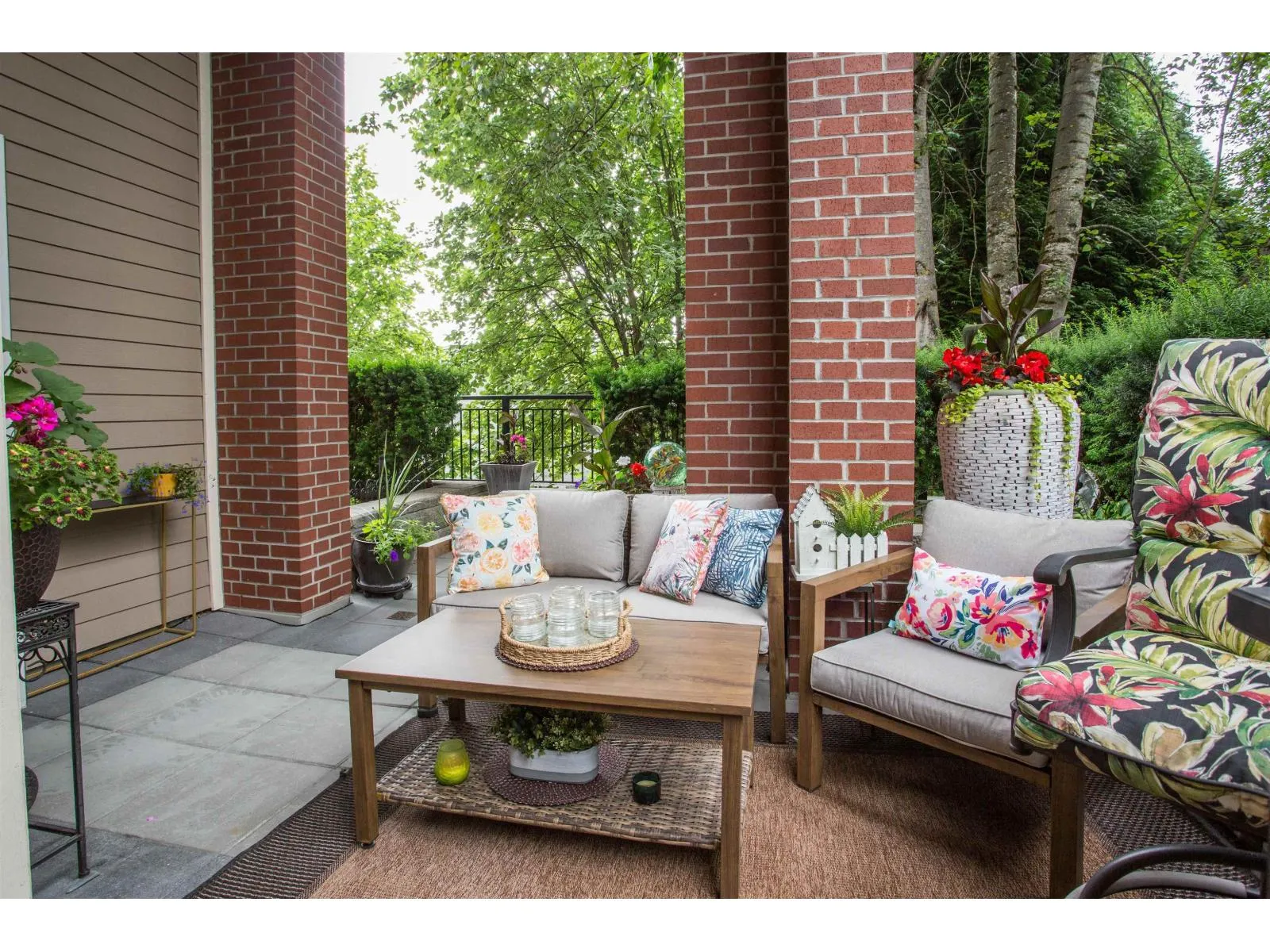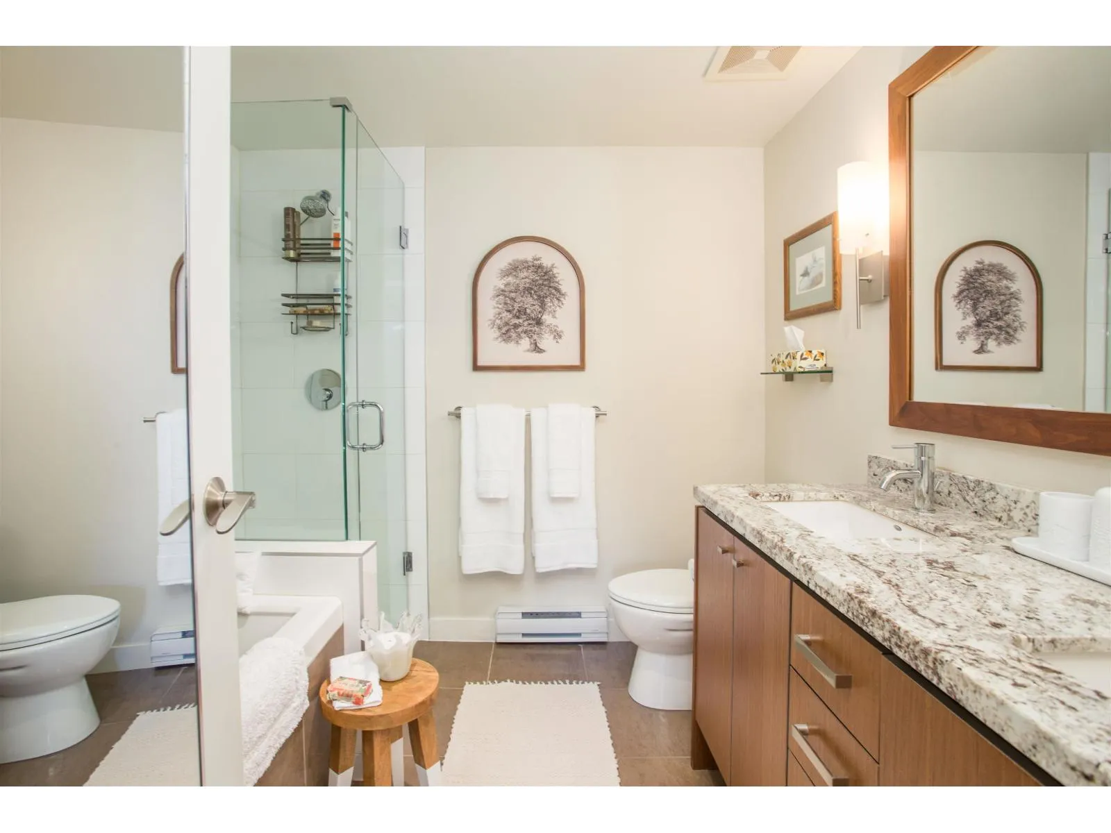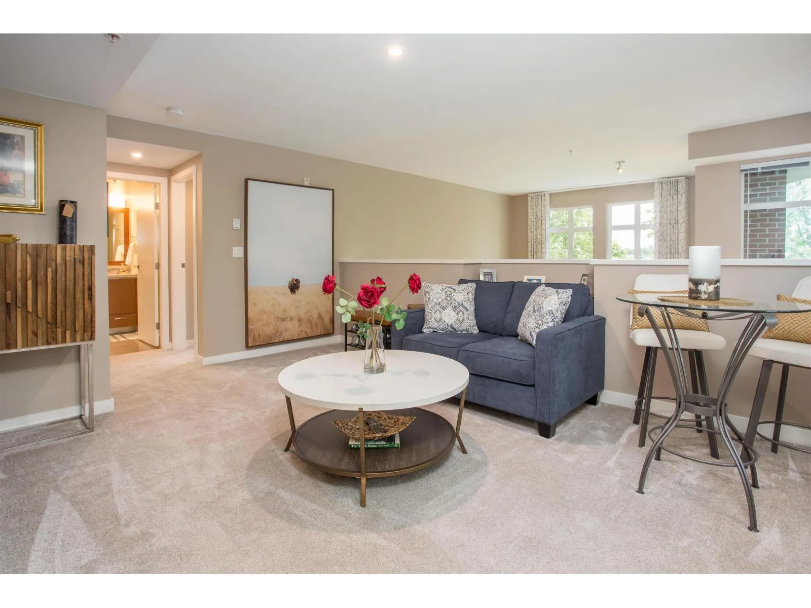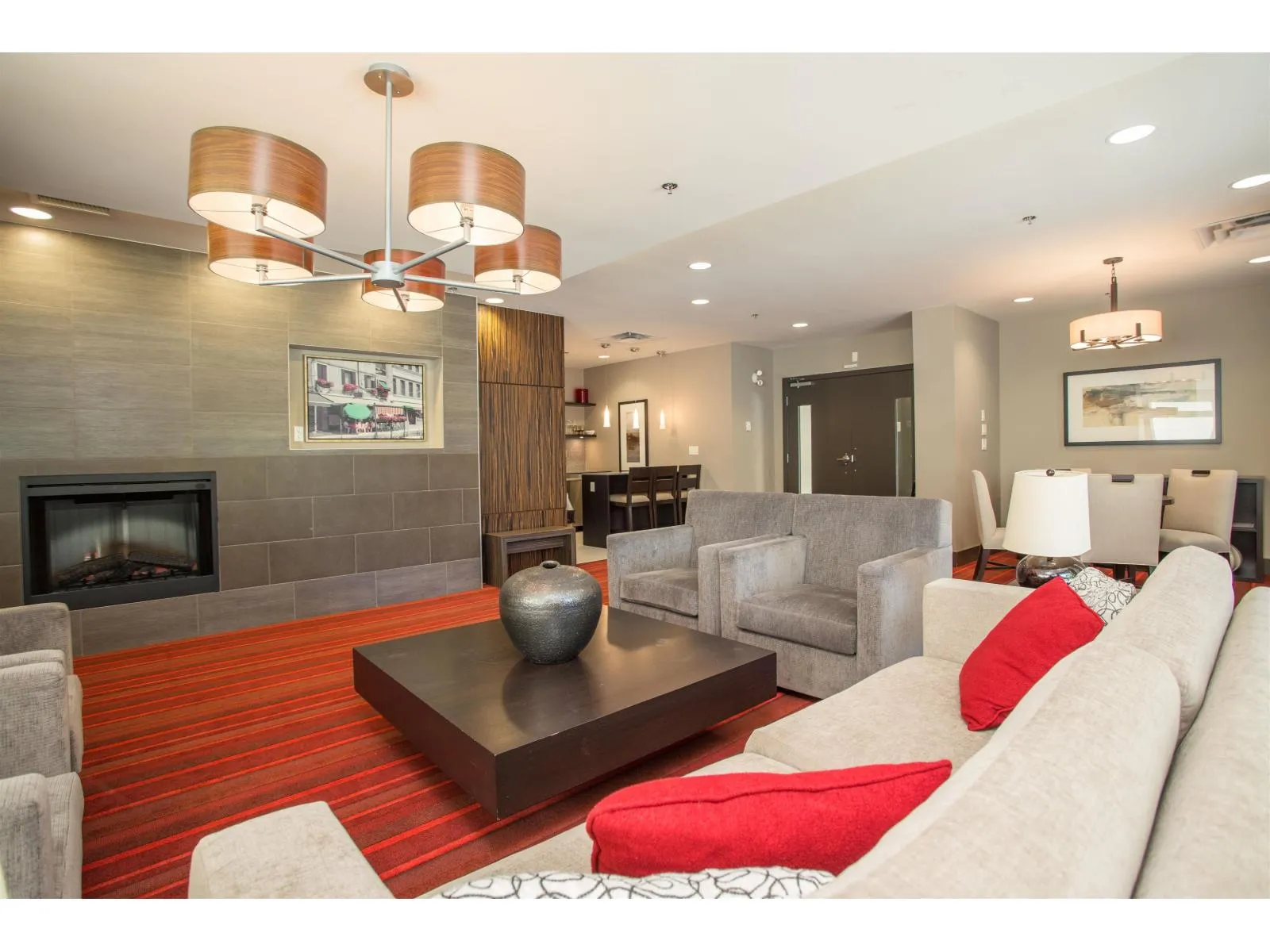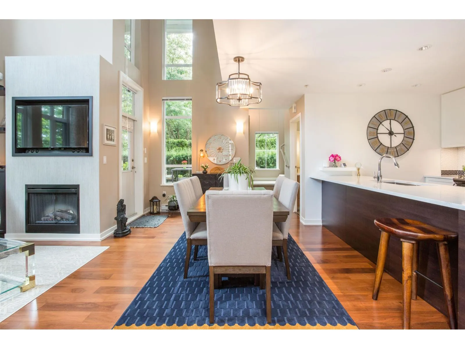 High Street loft condo! Rare 2 level MASTER on the MAIN end unit condo w/over 1400 sq ft. Spacious living room has beautiful 17 ft vaulted ceilings accented with floor to ceiling windows complete with custom motorized curtains. Large private covered PATIO. Bathrooms & kitchen tastefully RENOVATED w/quartz & granite counters. Entertainers kitchen w/ high end appliances,soft close custom cabinets,designer back splash & bar counter with extra seating +Large pantry! Upstairs has 1 bedroom and bath, as well as large open LOFT that could be used as a family rm, spacious office,or Den. Excellent location away from King George on private side of building w/ shopping,coffee shop,grocery store,restaurants,transit all under 5 min walk. 2 parking stalls, 1 storage locker. (id:27476)