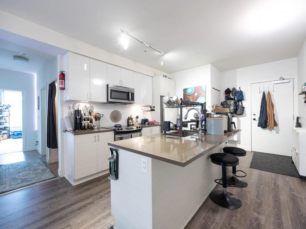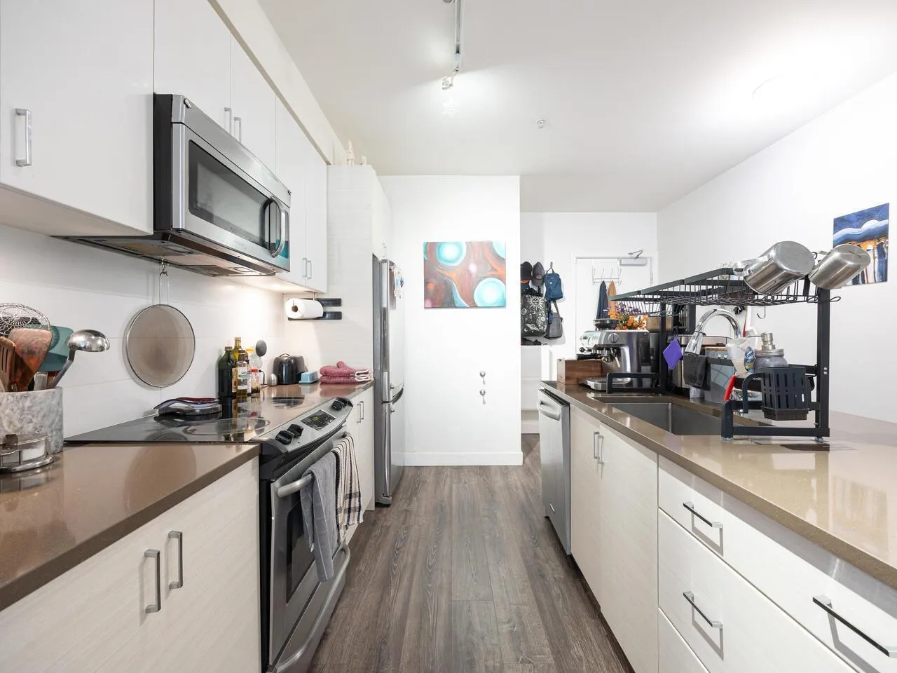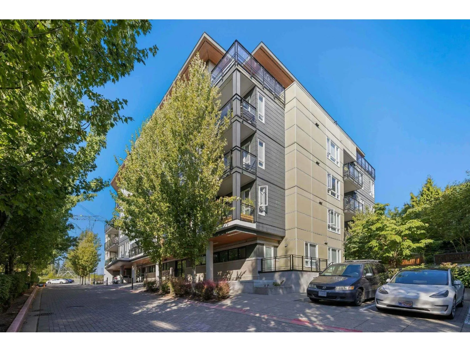 Welcome to Verve - a perfect blend of location and lifestyle! Just steps to King George SkyTrain, SFU Campus, Surrey Memorial Hospital, and Central City shopping, this 2 bed, 2 bath corner condo offers both convenience and comfort. Inside, enjoy a bright and spacious layout with upgraded vinyl flooring, a chef's kitchen with quartz countertops, stainless steel appliances, and a large breakfast bar. The primary bedroom features double sinks and an oversized shower, while second full bath and in-suite laundry add everyday ease. Relax on your quiet patio overlooking a treed setting, away from Fraser Hwy traffic. Building perks include a full gym, yoga room, social lounge, billiards, guest suite, storage, and tandem parking. (id:27476)