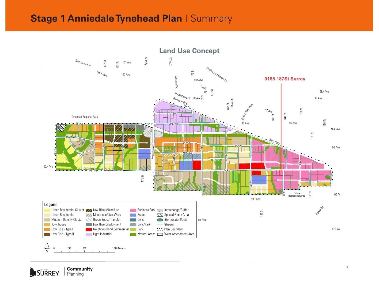 Over $700,000 below the assessment value!!!! 2 separated BUILDINGS + big storage shed on this 1.142 acre CORNER LOT with 2 entrances to the properties, designated for business park in Anniedale-Tynehead Stage 2 NCP. Extremely private and central location. Main house includes: 2 bedroom 2 full bathroom, huge livingroom, family room and den. Second cottage house include: kitchen, dining area, living room and 2 bedroom 1 bathroom. Huge Storage shed. Listing price is based on land value, house/cottage needs TLC but have huge potential. Corner Lot permit easy access to the property from 92 ave or 187 st. Quick access to highway 17 & highway 1. Minutes to freeway and all amenities. Floor Plan shows building A (1,446 sqft) & building B (528 sqft) & Storage (217 sqft). LOTS OF POTENTIAL!! (id:27476)