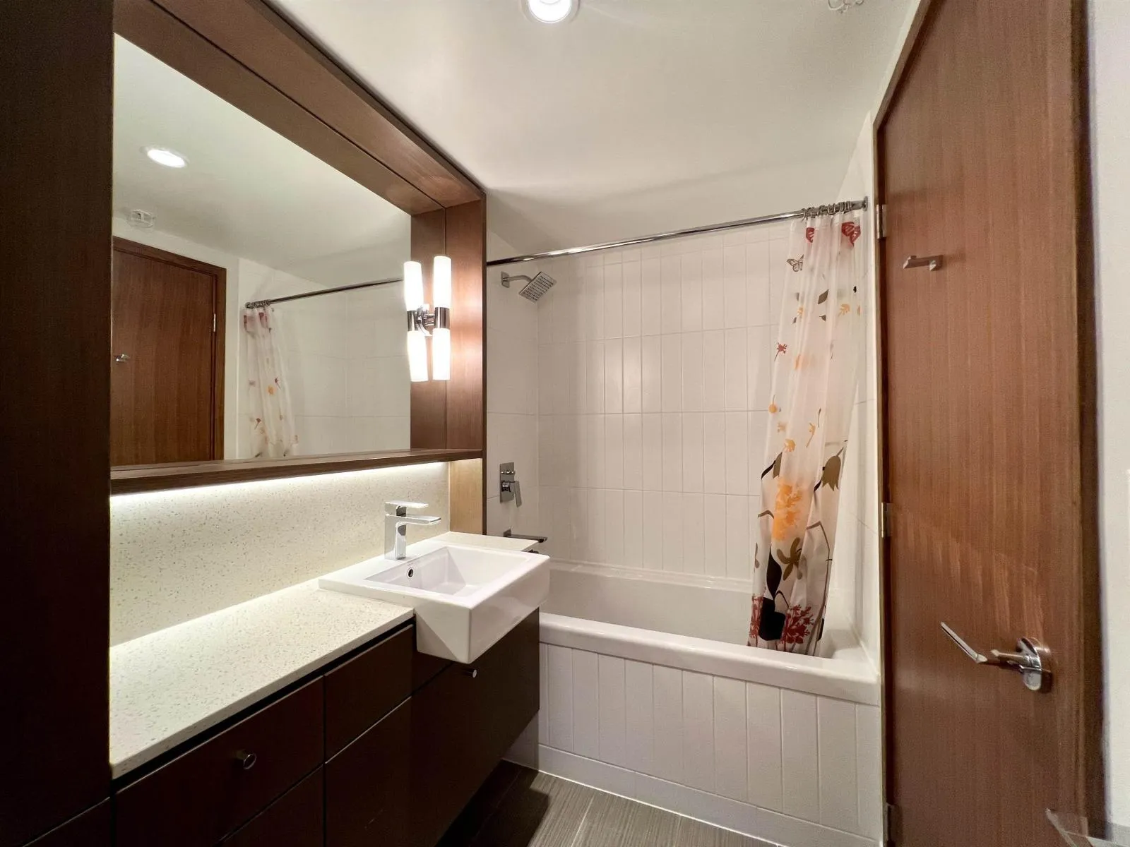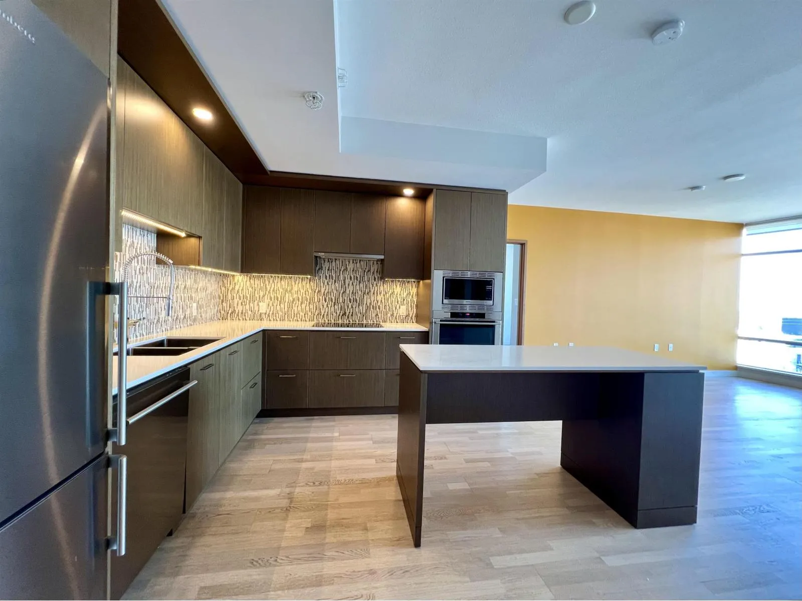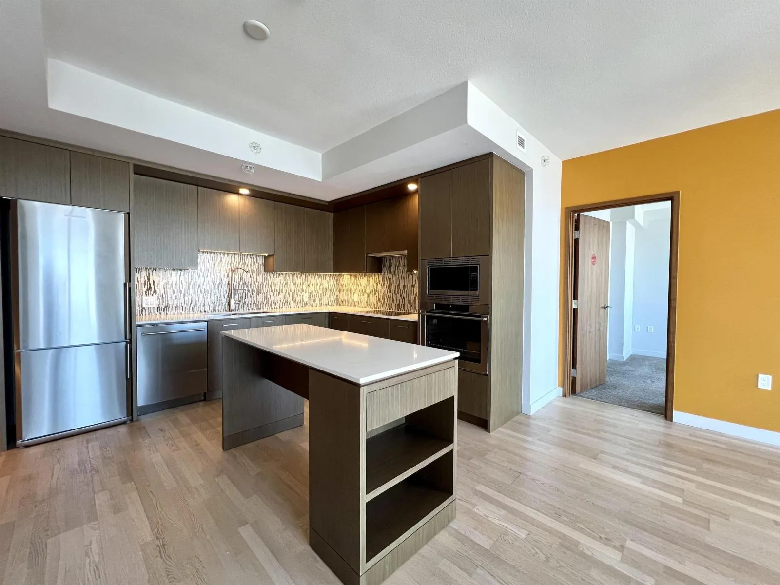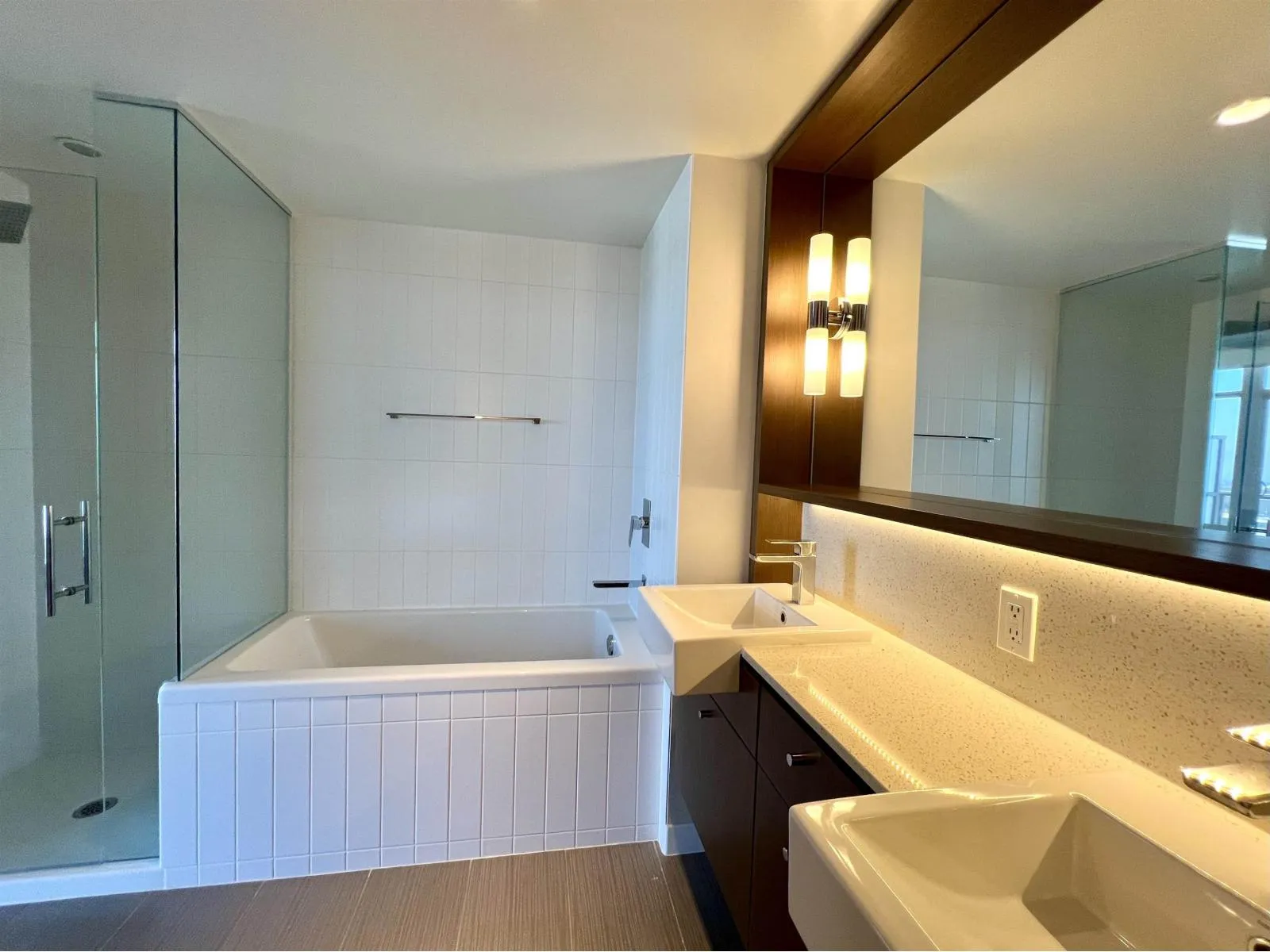 A beautiful 2-bedroom, 2-bathroom west-facing condo on the 41st floor of 3 Civic Plaza offers 1,050 sq. ft. of modern living with hardwood floors, radiant heating, air conditioning, in-suite washer/dryer, and an open kitchen with quartz countertops and stainless steel appliances. Enjoy stunning city views from the balcony, plus 1 parking stall, 1 storage locker, and optional second parking at extra cost. The building features 24-hour security, café, and restaurant, all steps from Surrey Central SkyTrain, SFU, library, recreation centre, shopping, and dining. Minimum 1-year lease; small pets maybe, no smoking. (id:27476)