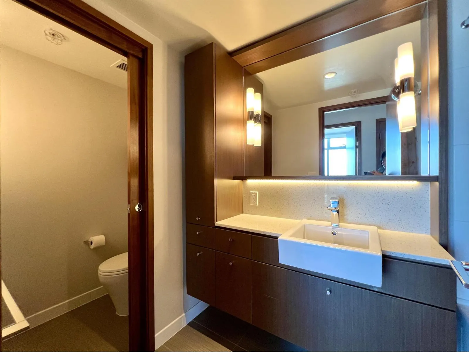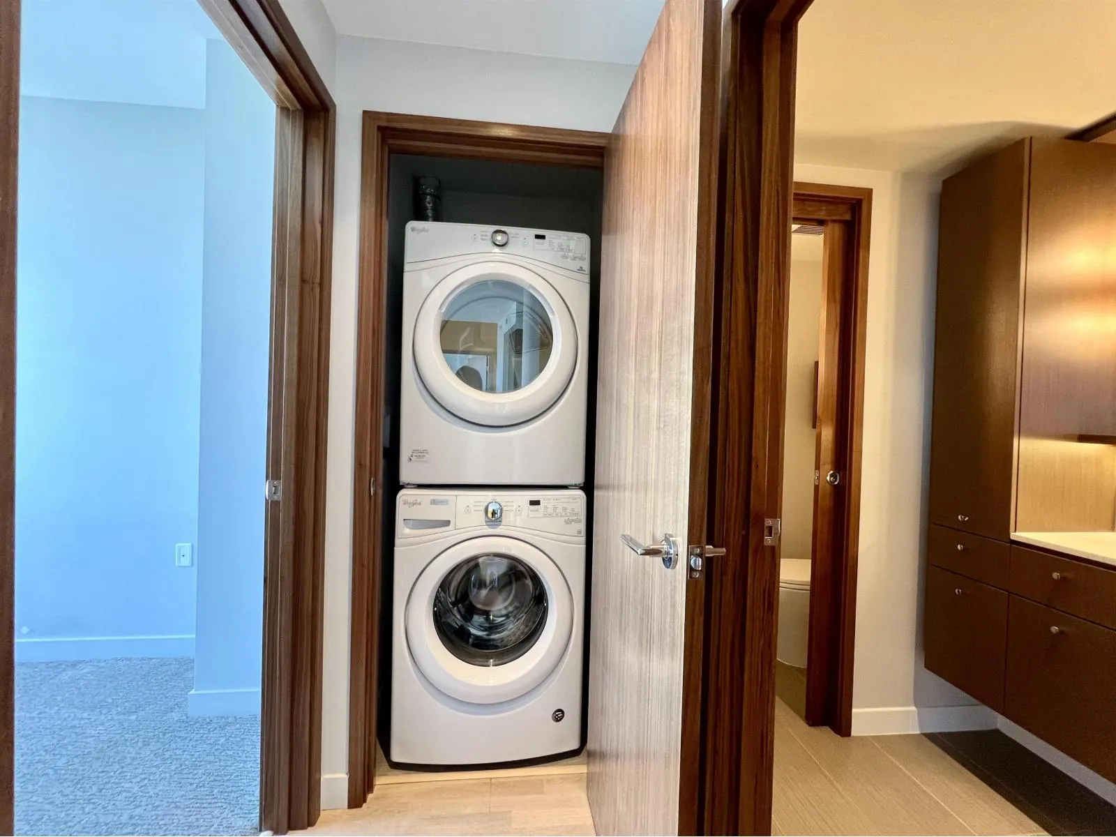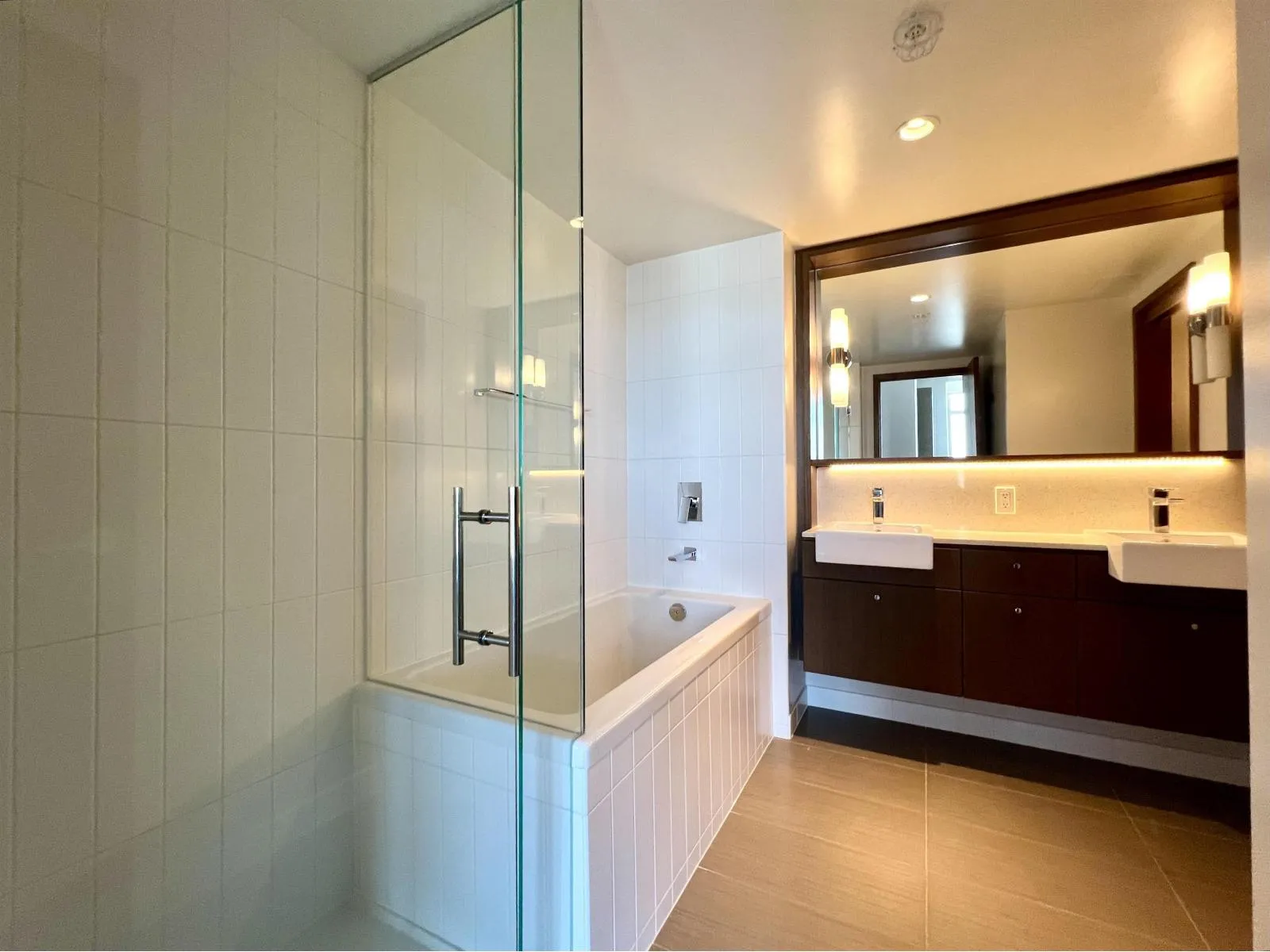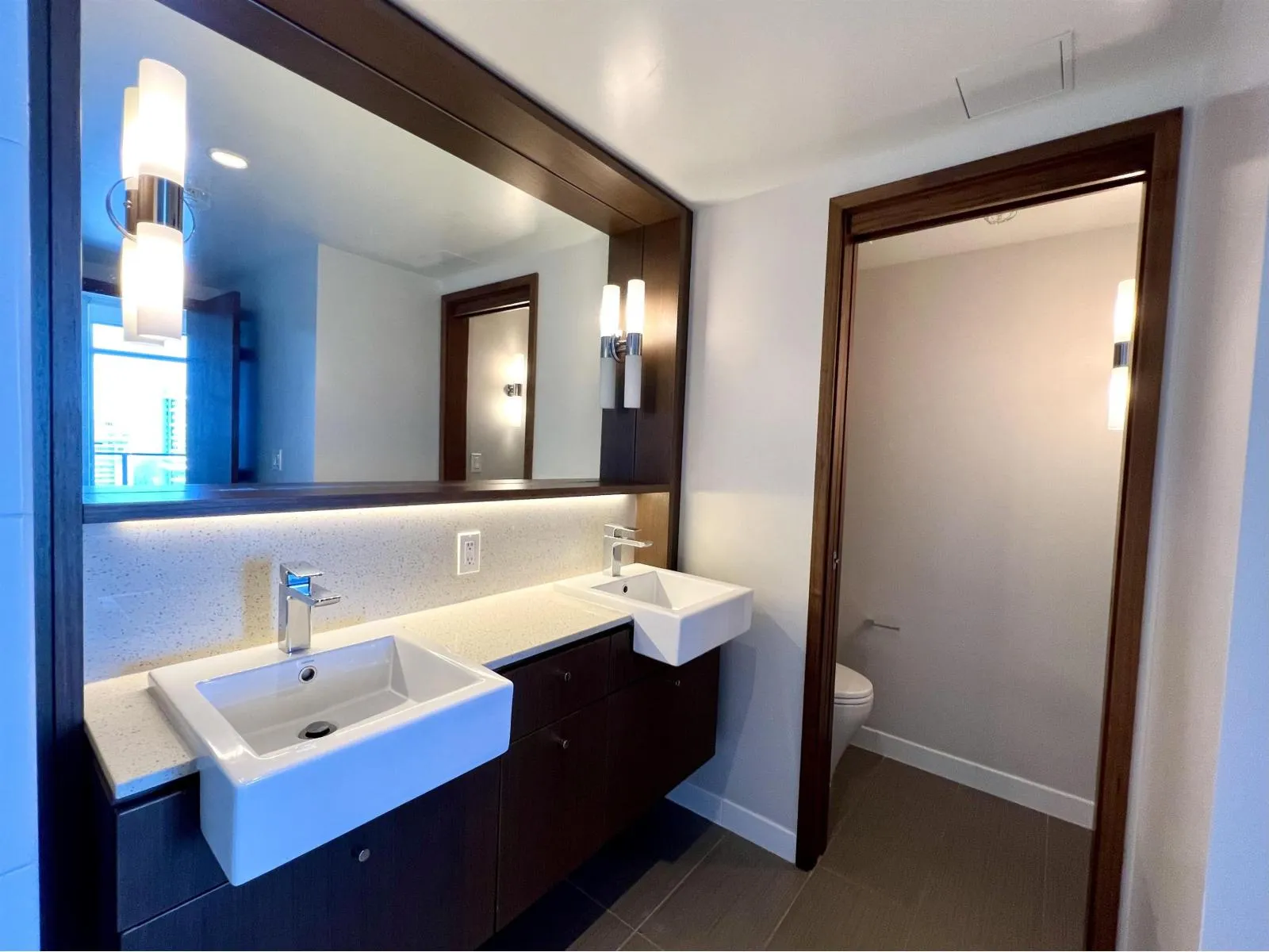 A beautiful 2-bedroom, 2-bathroom west-facing condo on the 41st floor of 3 Civic Plaza offers 1,050 sq. ft. of modern living with hardwood floors, radiant heating, air conditioning, in-suite washer/dryer, and an open kitchen with quartz countertops and stainless steel appliances. Enjoy stunning city views from the balcony, plus 1 parking stall, 1 storage locker, and optional second parking at extra cost. The building features 24-hour security, café, and restaurant, all steps from Surrey Central SkyTrain, SFU, library, recreation centre, shopping, and dining. Minimum 1-year lease; small pets maybe, no smoking. (id:27476)