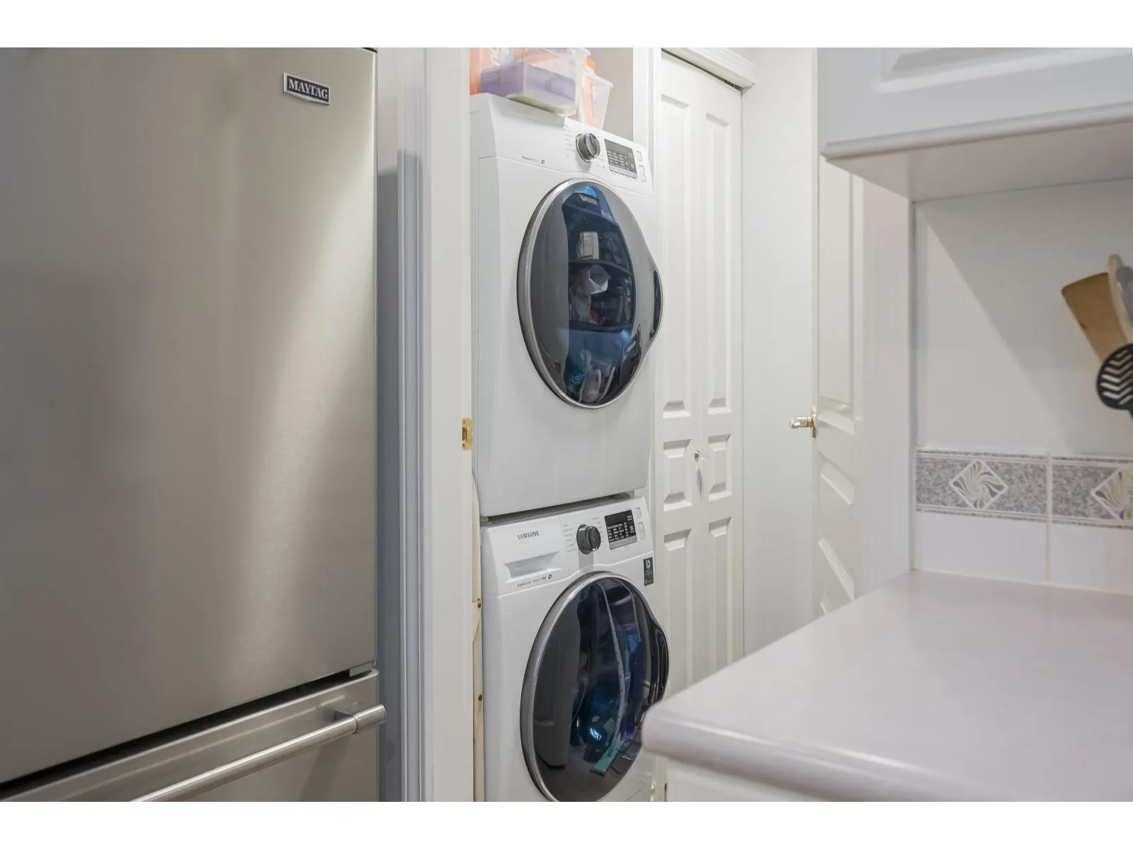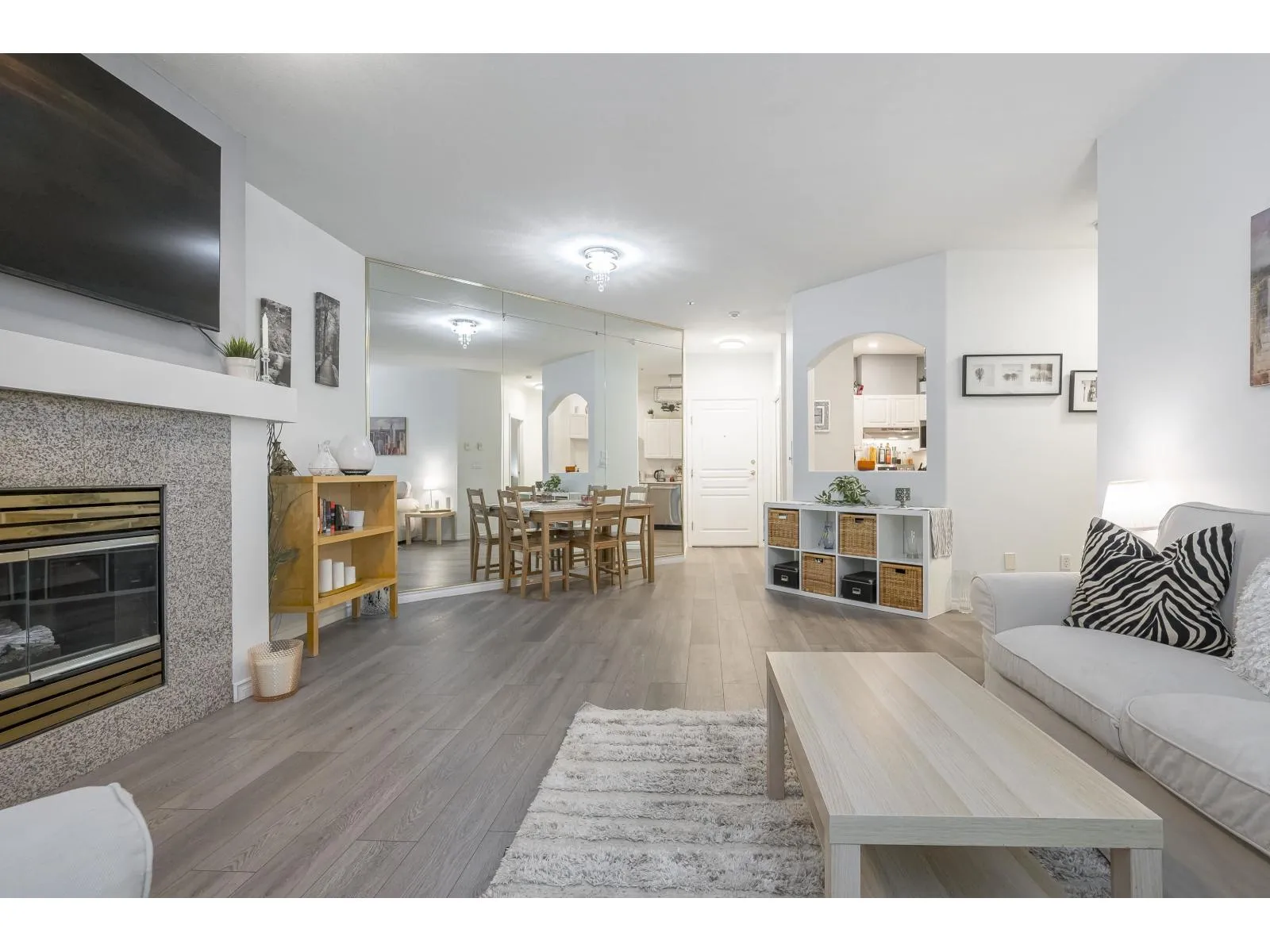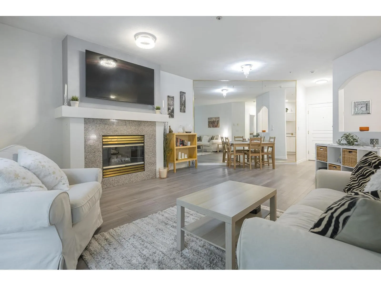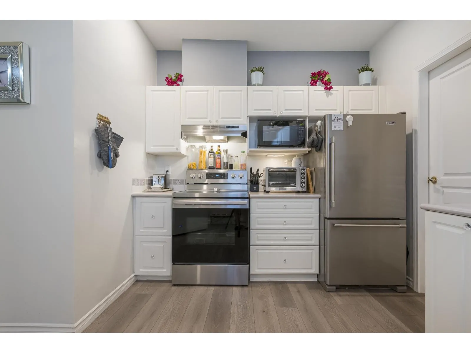 Kingsbrook~ a well maintained lovely complex offers this almost 800 sq ft 1 bdrm, 1 bthrm home that is perfect for first time buyers or down sizers! Great floor plan with 9 ft ceilings! The large kitchen includes tons of white cabinetry, newer S/S appliances ( 2021) and a brand new dishwasher. Living rm has gas fireplace and leads to your amazing outdoor space. The balcony faces south so you get lots of natural light and it backs on to complete privacy with greenbelt and peaceful nature behind. Bedroom is well sized with good closet space and there is a 4 pc bath. Convenient walk in laundry area, 1 parking, and 1 storage. Building was re piped, so no Poly B! Call today to view this great home in the heart of Guildford! (id:27476)