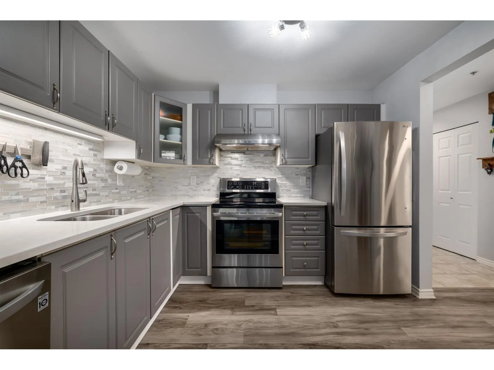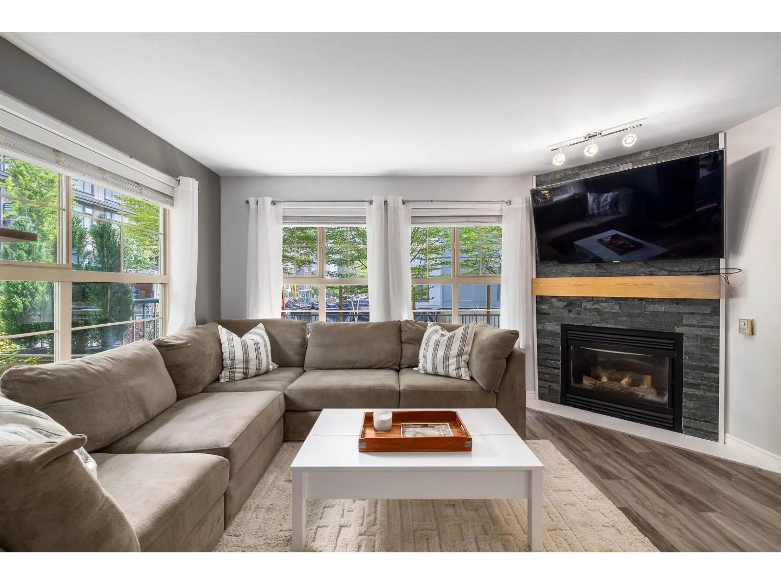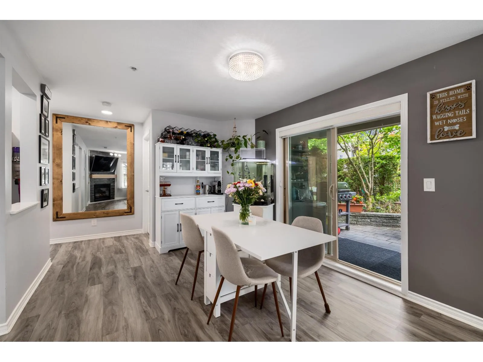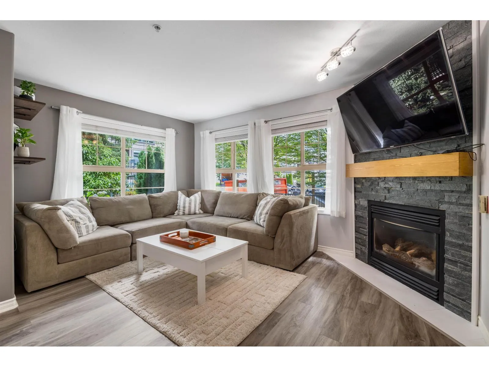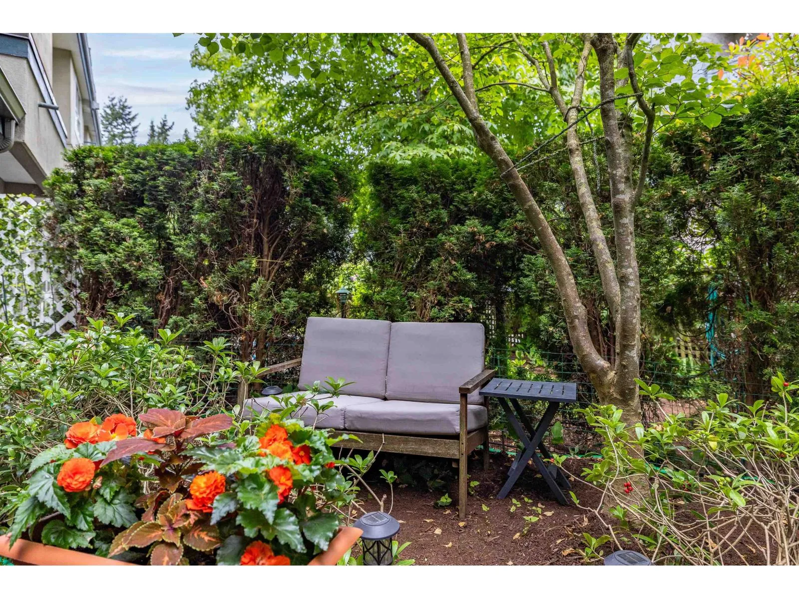 A beautifully updated GROUND LEVEL CORNER UNIT offering an expansive, open-concept layout and exceptional privacy. Large windows and sliding glass doors open to a 428 sq.ft. garden oasis, perfect for relaxing or entertaining. Thoughtful updates include new flooring, sleek kitchen countertops and backsplash, modern blinds, and more. Additional features include a generous laundry/storage room, and a spacious primary bedroom complete with a walk-in closet behind a barn door and en-suite. Enjoy the comfort of a gas fireplace (included in the strata fee), BRAND NEW ROOF, 2 SIDE-BY-SIDE PARKING STALLS + NO SHARED UNIT WALLS. Walking distance to transit, restaurants and shopping. Call today to book your private viewing! (id:27476)
