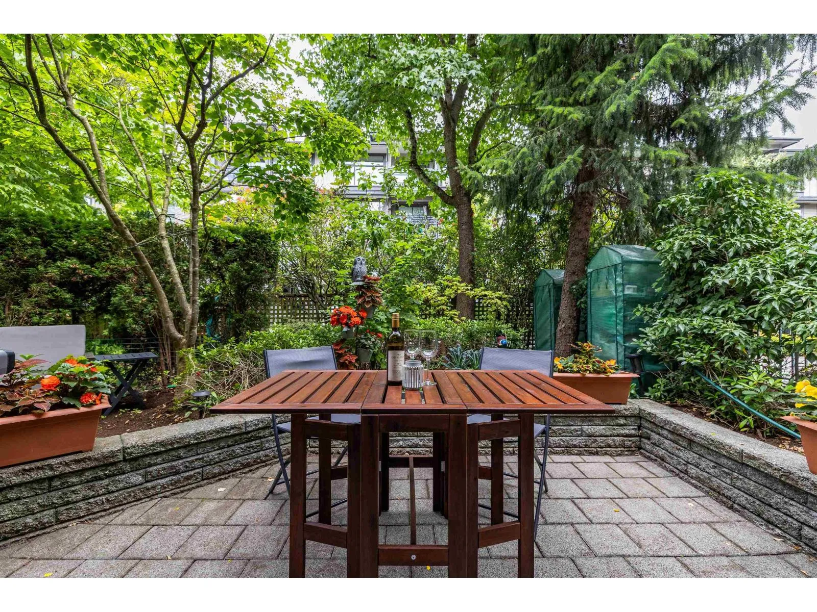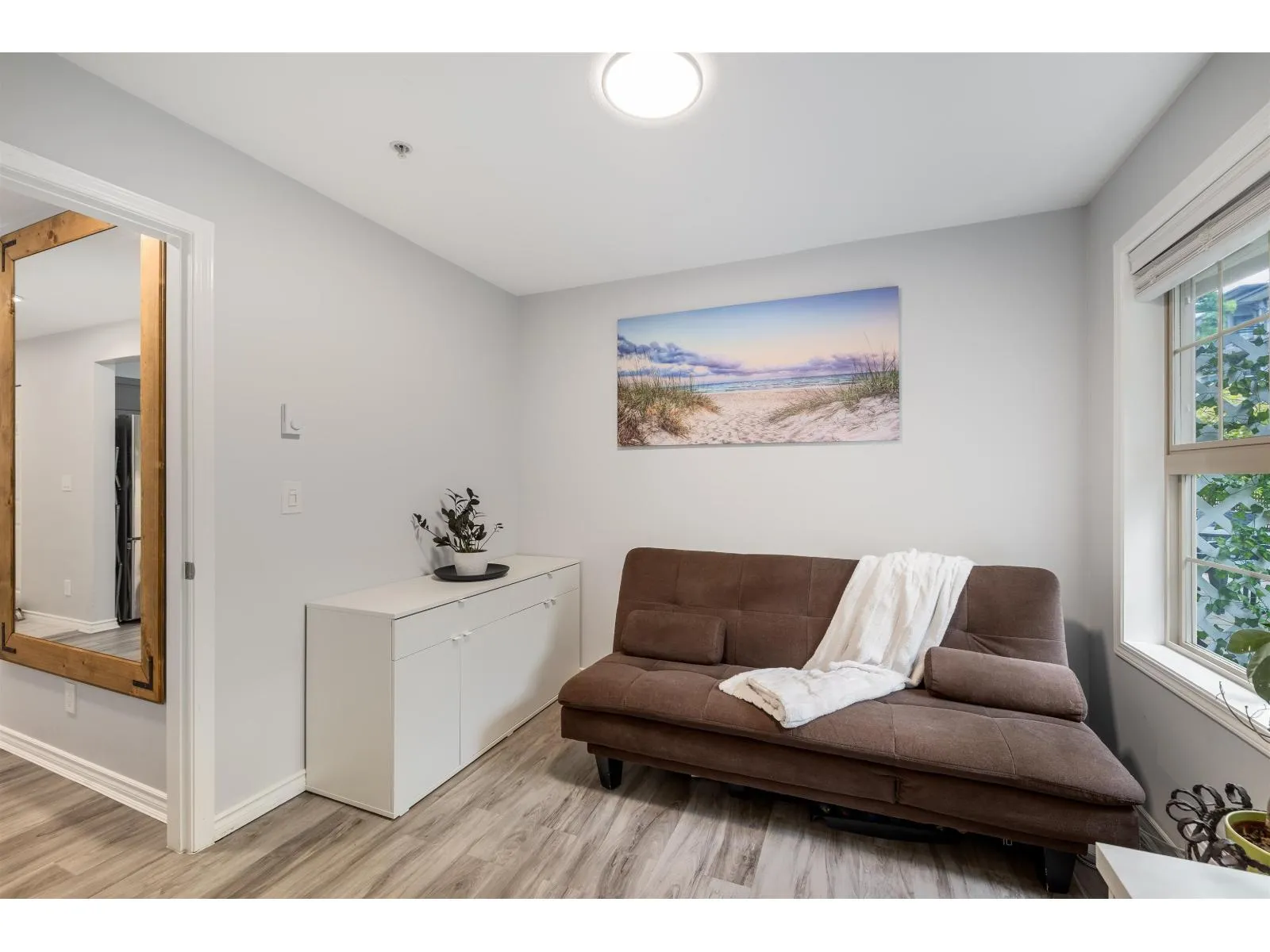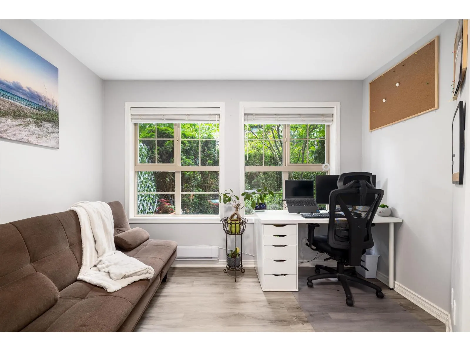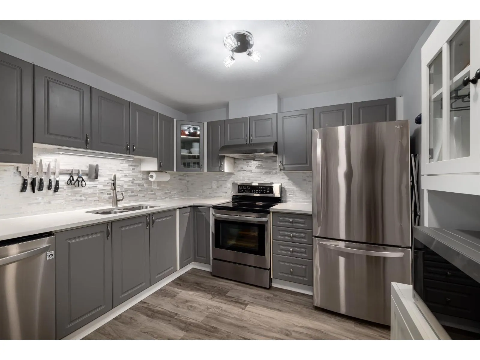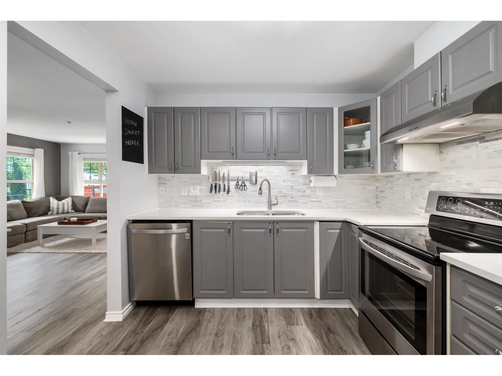 A beautifully updated GROUND LEVEL CORNER UNIT offering an expansive, open-concept layout and exceptional privacy. Large windows and sliding glass doors open to a 428 sq.ft. garden oasis, perfect for relaxing or entertaining. Thoughtful updates include new flooring, sleek kitchen countertops and backsplash, modern blinds, and more. Additional features include a generous laundry/storage room, and a spacious primary bedroom complete with a walk-in closet behind a barn door and en-suite. Enjoy the comfort of a gas fireplace (included in the strata fee), BRAND NEW ROOF, 2 SIDE-BY-SIDE PARKING STALLS + NO SHARED UNIT WALLS. Walking distance to transit, restaurants and shopping. Call today to book your private viewing! (id:27476)