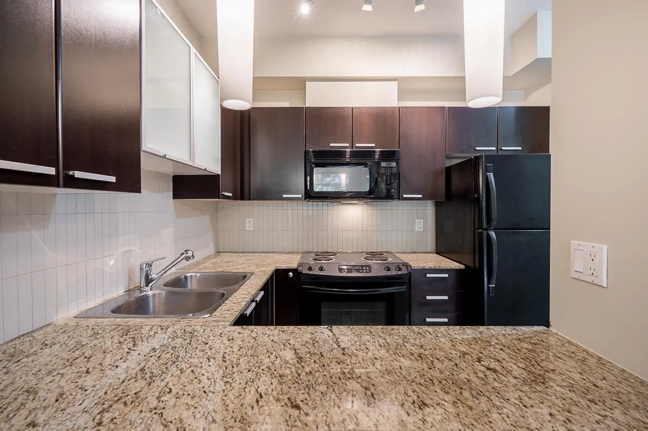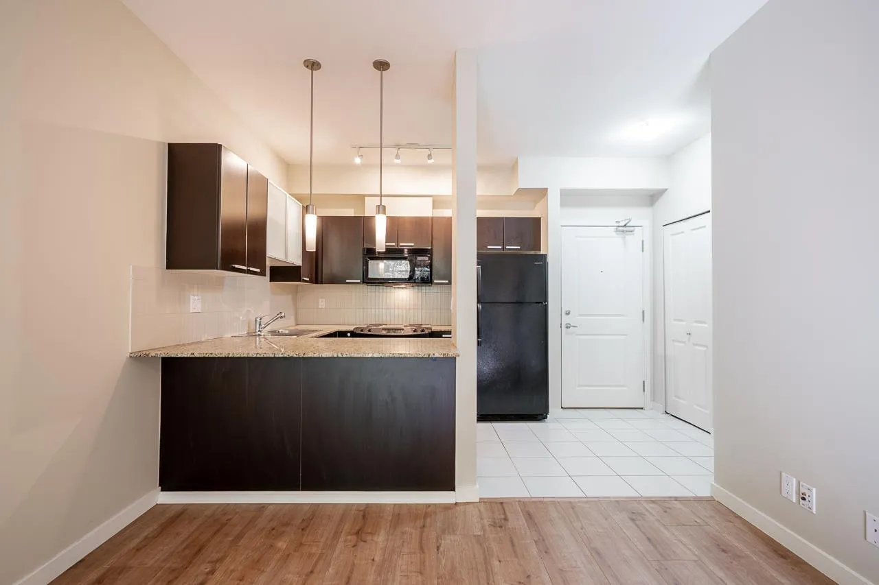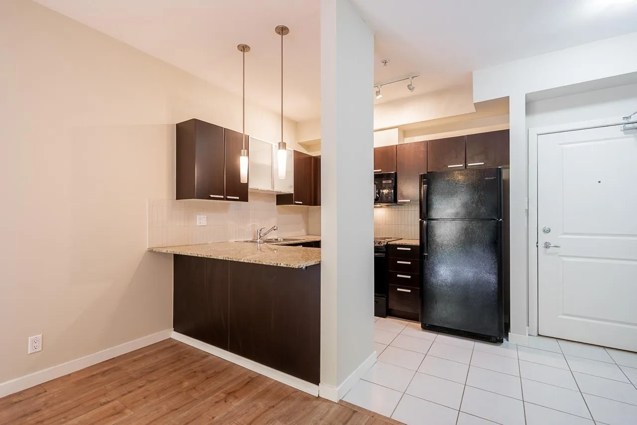 Located in the popular D'Cor community of Surrey City Centre. This Spacious One bedroom, one bathroom condominium is move in ready. Freshly updated with new wide plank laminate flooring in the living and dining areas and a new coat of paint. The Kitchen features dark wood grain cabinets, black appliances, granite counter top, tile backsplash and flooring. Situated on the second floor and on the quiet side of the building with dual-access balcony. 1 parking and 1 locker. Pet-friendly (One cat or one small dog permitted - maximum 20 kgs). The Building offers Secure Gated underground parking, onsite amenity and fitness rooms. Just a short stroll to SFU, KPU, Surrey Central Skytrain, and all the shops and restaurants of Central City Mall. OPEN HOUSE SATURDAY 2-4 PM NOVEMBER 15. (id:27476)