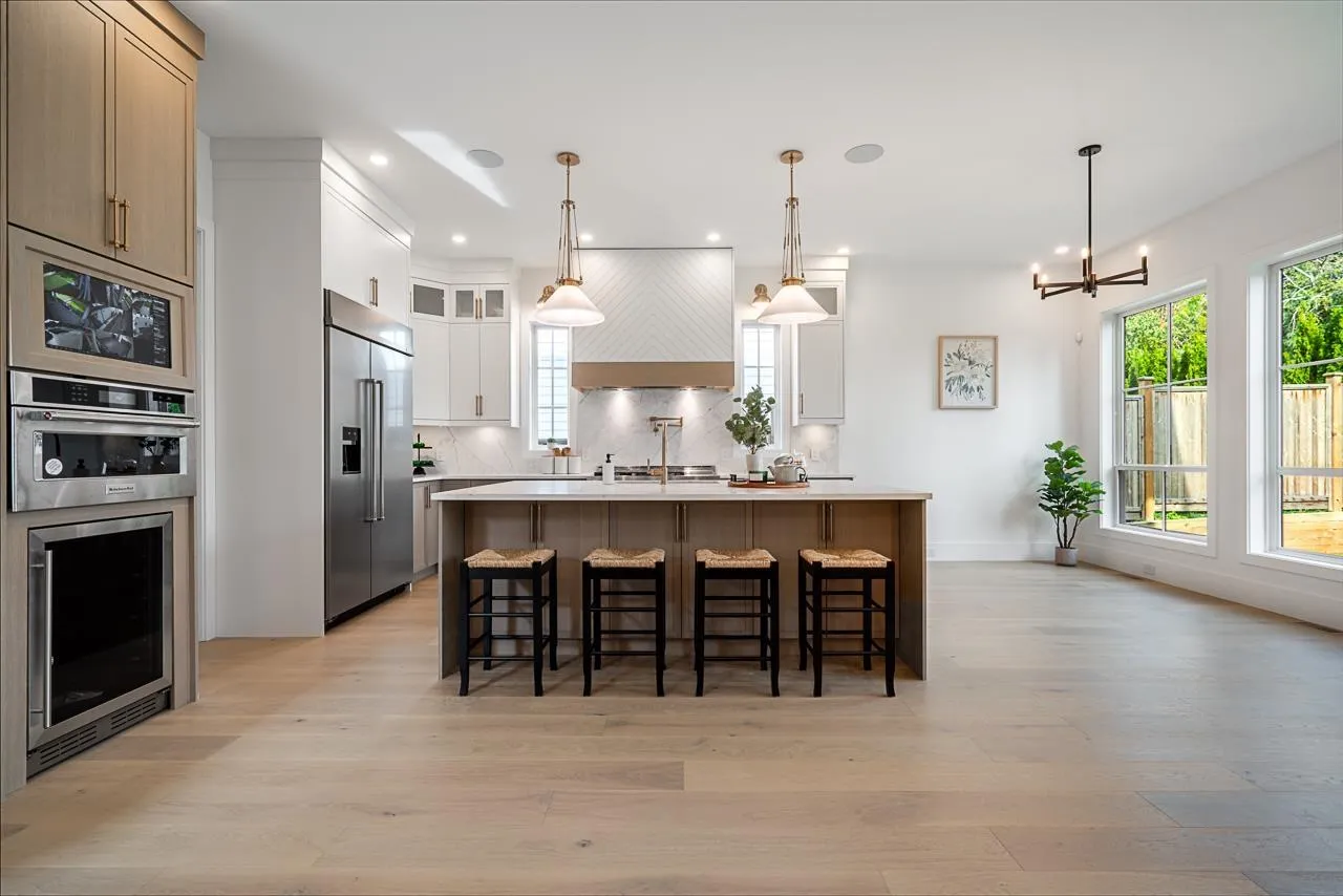 This breathtaking designer home blends Craftsman architecture with Farmhouse elegance & luxurious living in sought-after West Cloverdale. Bright, airy interiors feature expansive windows with automatic blinds, exquisite millwork, and premium flooring. The showstopping great room centers around a stunning fireplace and a custom two-tone white oak kitchen with top-tier appliances, a spice kitchen, and walk-in pantry. Upstairs boasts 4 generous vaulted bedrooms including a dreamy primary ensuite with soaker tub. The lower level features a 2-bed legal suite, media room with wet bar, 3-pc bath, storage, and mudroom. Enjoy central A/C, designer details & the 2/5/10 New Home Warranty - a perfect blend of sophistication, comfort, and functionality. (id:27476)