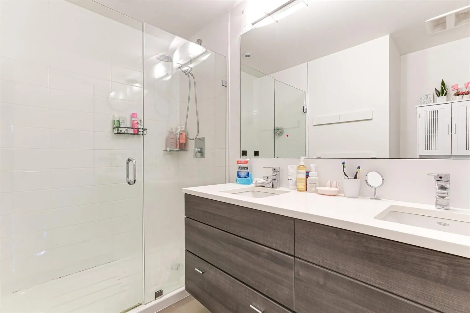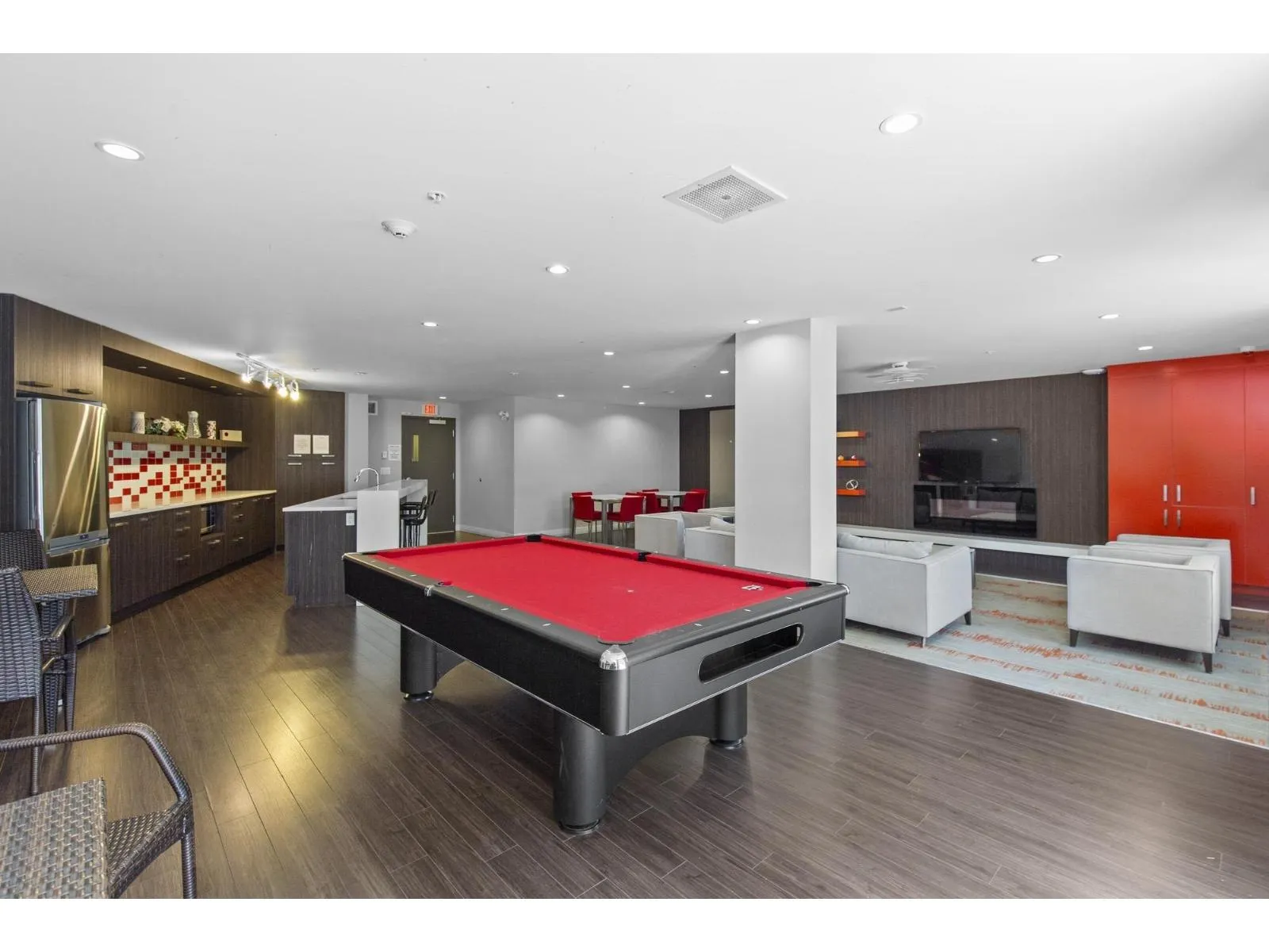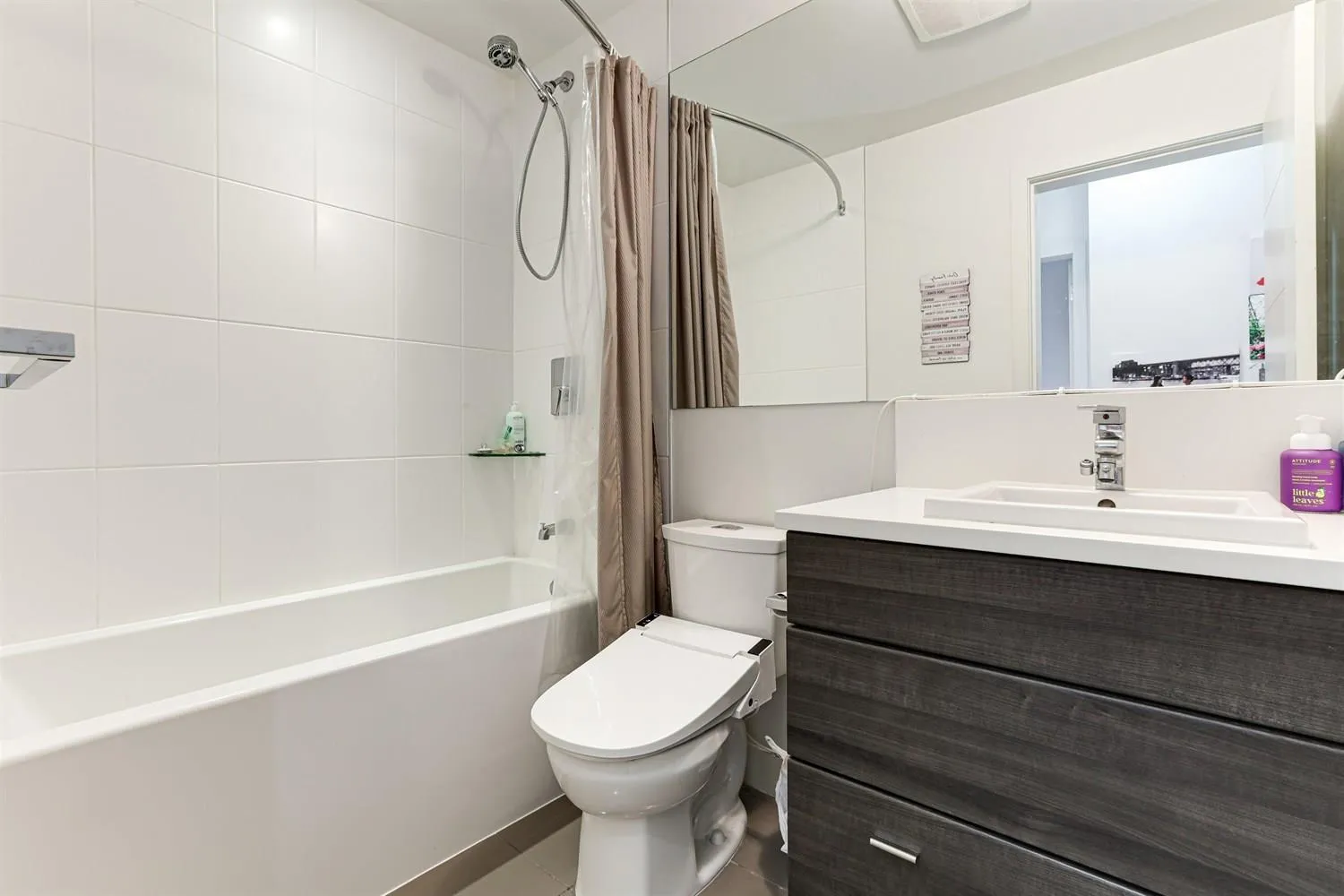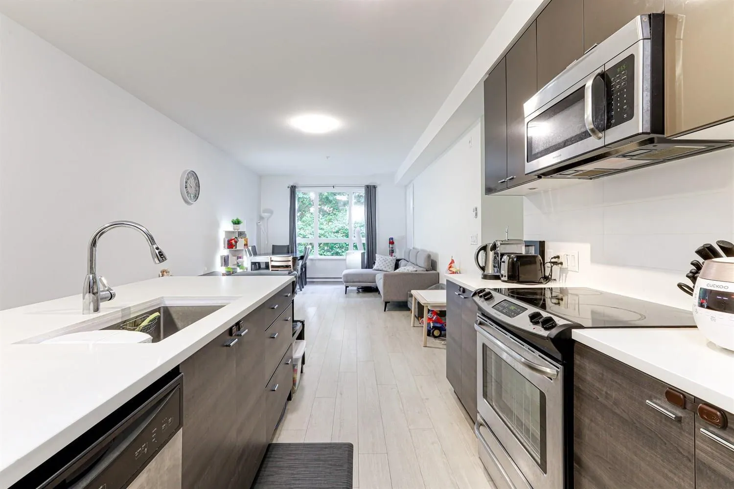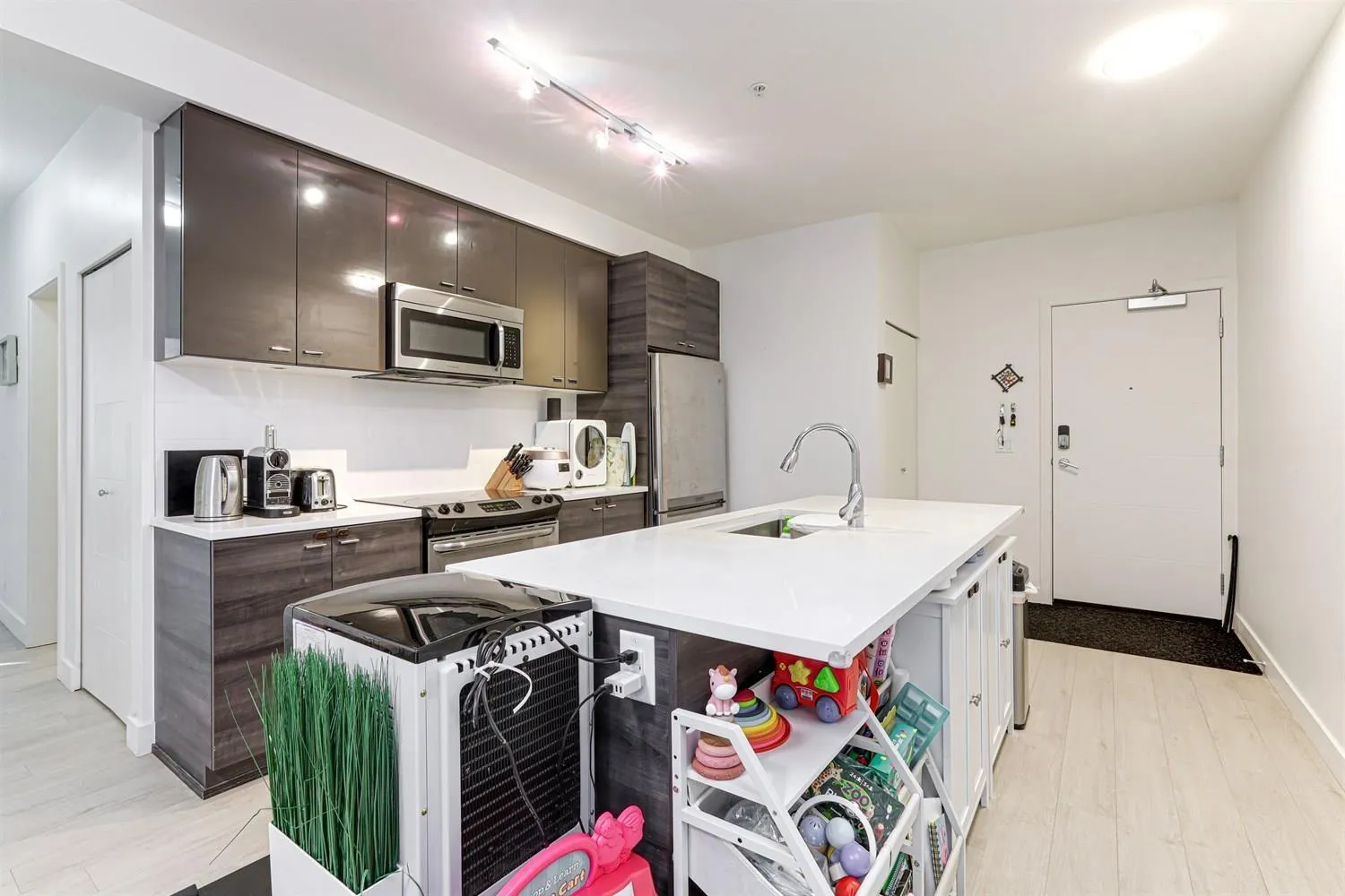 Welcome to Verve - Where Location Meets Lifestyle! Steps from King George SkyTrain, SFU, Future UBC, Surrey Memorial Hospital, and Central City, King George HUB This 2 bed, 2 bath corner unit offers 988 sq.ft. of bright, functional living space. Enjoy upgraded Laminate flooring, a modern kitchen with quartz counters, stainless steel appliances, and a large breakfast bar. The spacious primary bedroom fits a king bed and features double sinks and an oversized shower. Relax on your quiet patio with a treed outlook, away from Fraser Hwy traffic. Extras include in-suite laundry, 9ft ceilings, storage locker, and TANDEM (can fit 2 cars)parking. Building amenities: gym, yoga room, lounge, billiards, and guest suite. A perfect blend of style, comfort &convenience in one of Surrey's best locations (id:27476)