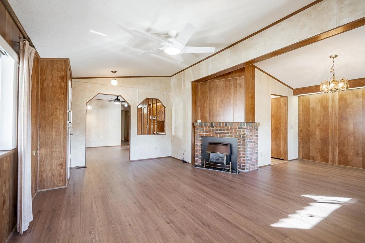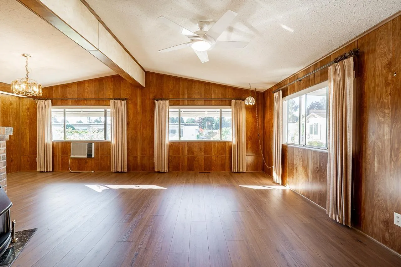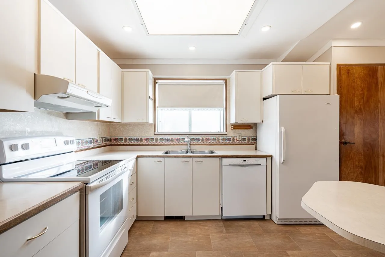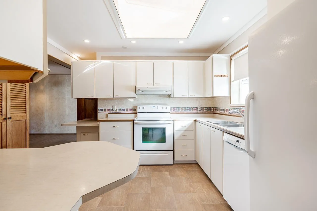 SEA RIDGE BAYS! Lovely double wide manufactured home on its own land. This home offers two bedrooms, two bathrooms and den/family room, plus addition of solarium and storage room. Large open plan living and dining room with vaulted ceilings and gas fire insert. Bright kitchen with skylights and greenhouse window, lots of cupboards, large counters, breakfast nook, pantry and storage. Primary bedroom with generous ensuite. Beautiful park setting. Age 55+. Council Approval Required Central location at King Georgie Corridor, close to shopping districts & White Rock Beach. (Please note some rooms have been virtually staged). (id:27476)
