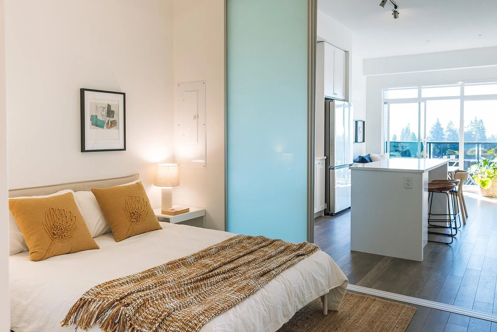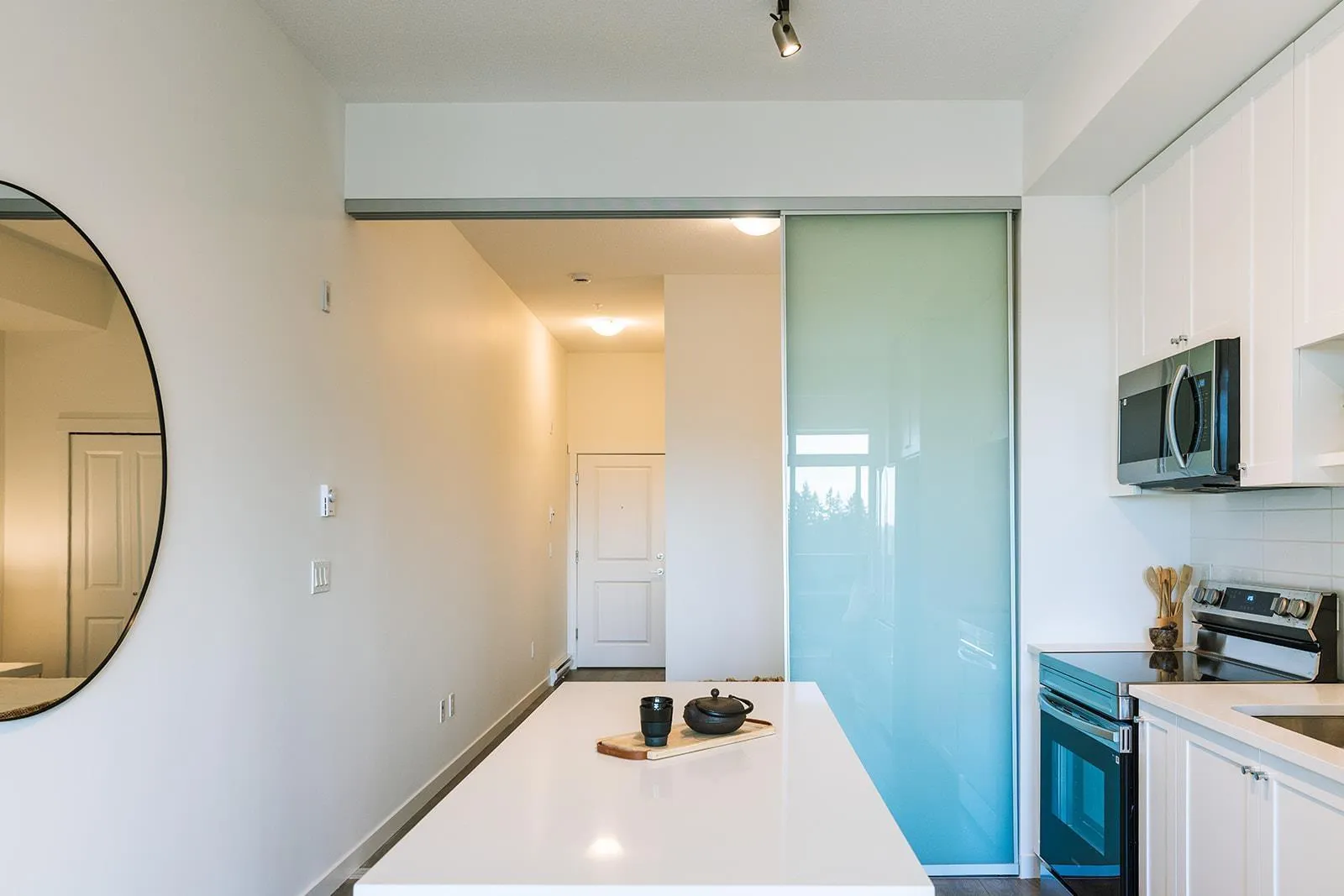 Brand new JR. 1 BED (bedroom/studio) with 10ft ceilings on penthouse level in the heart of Fleetwood. Enjoy all the benefits of full-size kitchen appliances in island, quartz countertop kitchen. LOFTY & SPACIOUS features over-sized patio door which opens to a south-facing balcony with unobstructed panoramic views. In-suite laundry, Community Amenities Rooftop gardens, BBQ areas, Lounge, Gym & Yoga Studio, Walking paths, 1 storage locker and 1 parking in secure underground garage. Walking to distance to Fresh Street Market, restaurants, medical clinics, bike trails, parks & schools. 1 minute walk to bus & future skytrain. (id:27476)