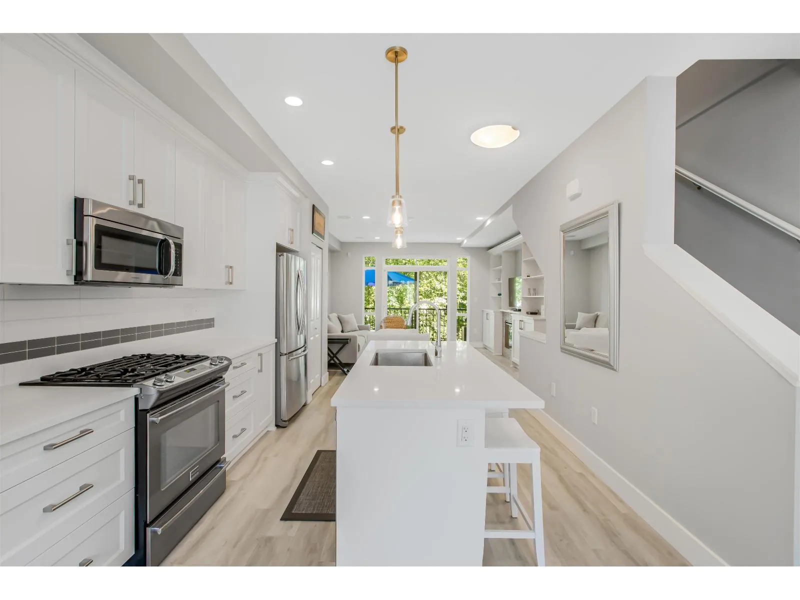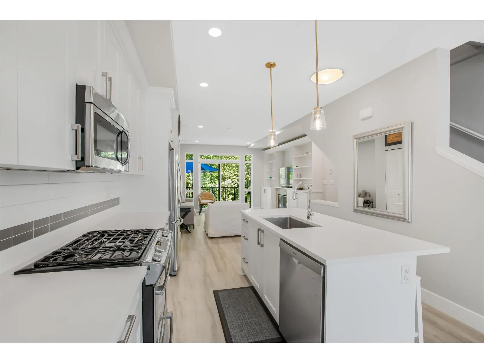 Welcome to the NICHE! This beautifully designed 3 bedroom townhome is turn key and ready for you to move in! Enjoy designer touches throughout, including luxury vinyl flooring and a sleek, chef-inspired kitchen featuring white cabinetry, quartz countertops and a premium 4-burner gas range. Step out onto the north-facing balcony looking at a tranquil greenbelt, or unwind in the fully fenced backyard with artificial turf. Upstairs, the primary suite offers a relaxing retreat with a large closet and spa-inspired ensuite complete with double sinks a deep soaker tub and walk-in shower. Ideally located just minutes from Grandview shops, top-rated schools, and transit. This complex also offers a clubhouse and fully equipped gym! Book a private showing today! (id:27476)