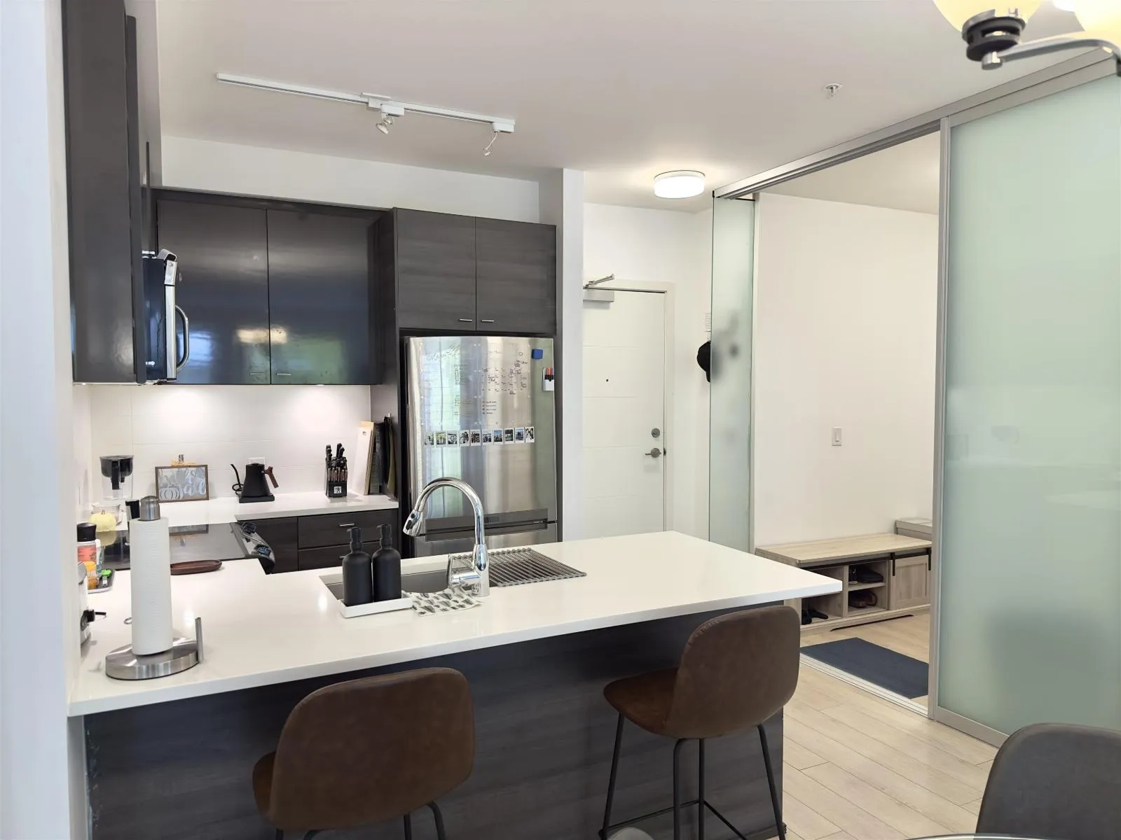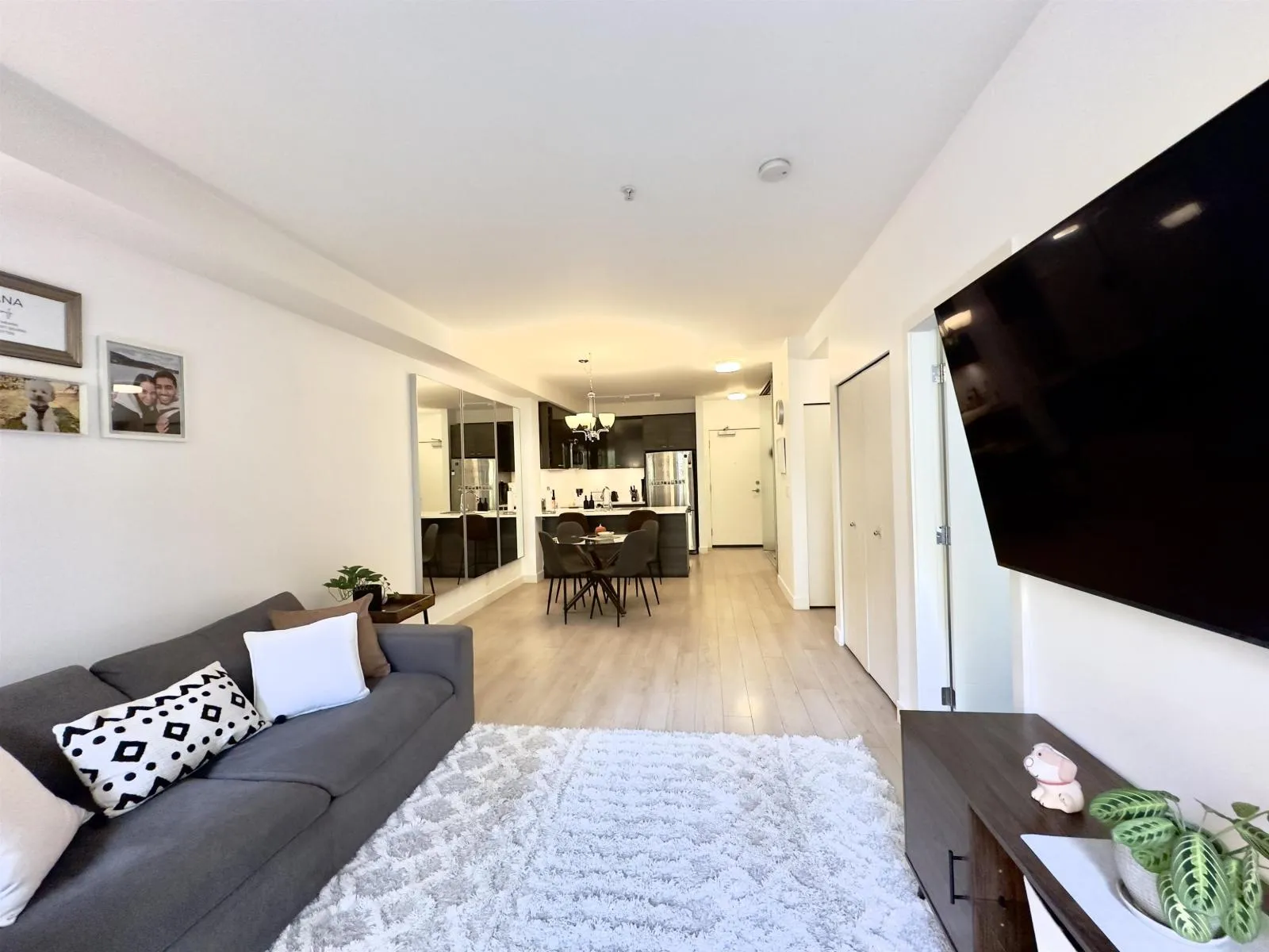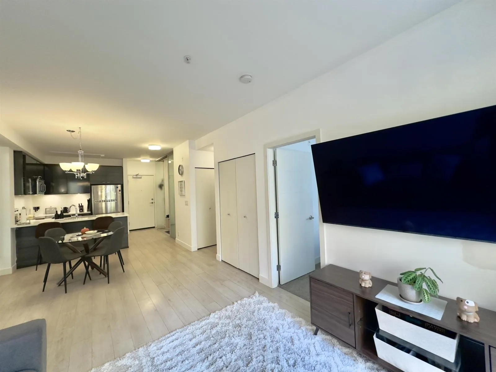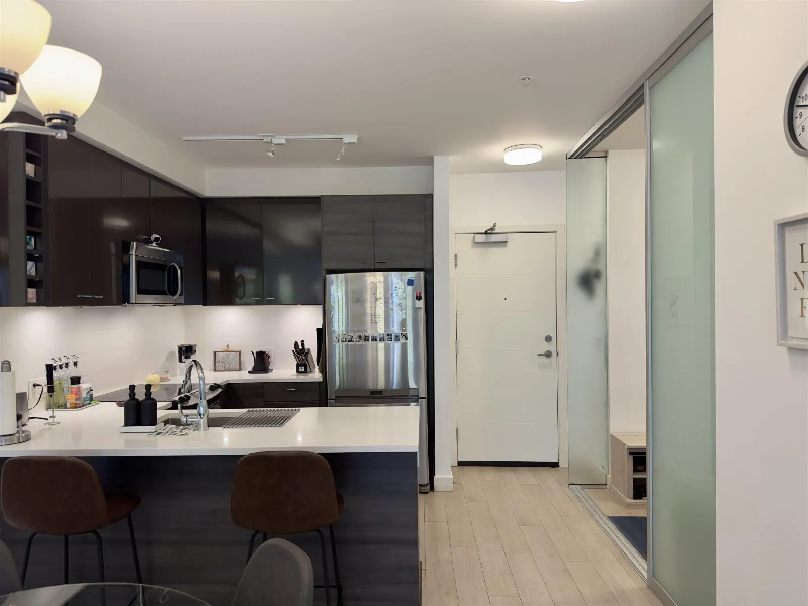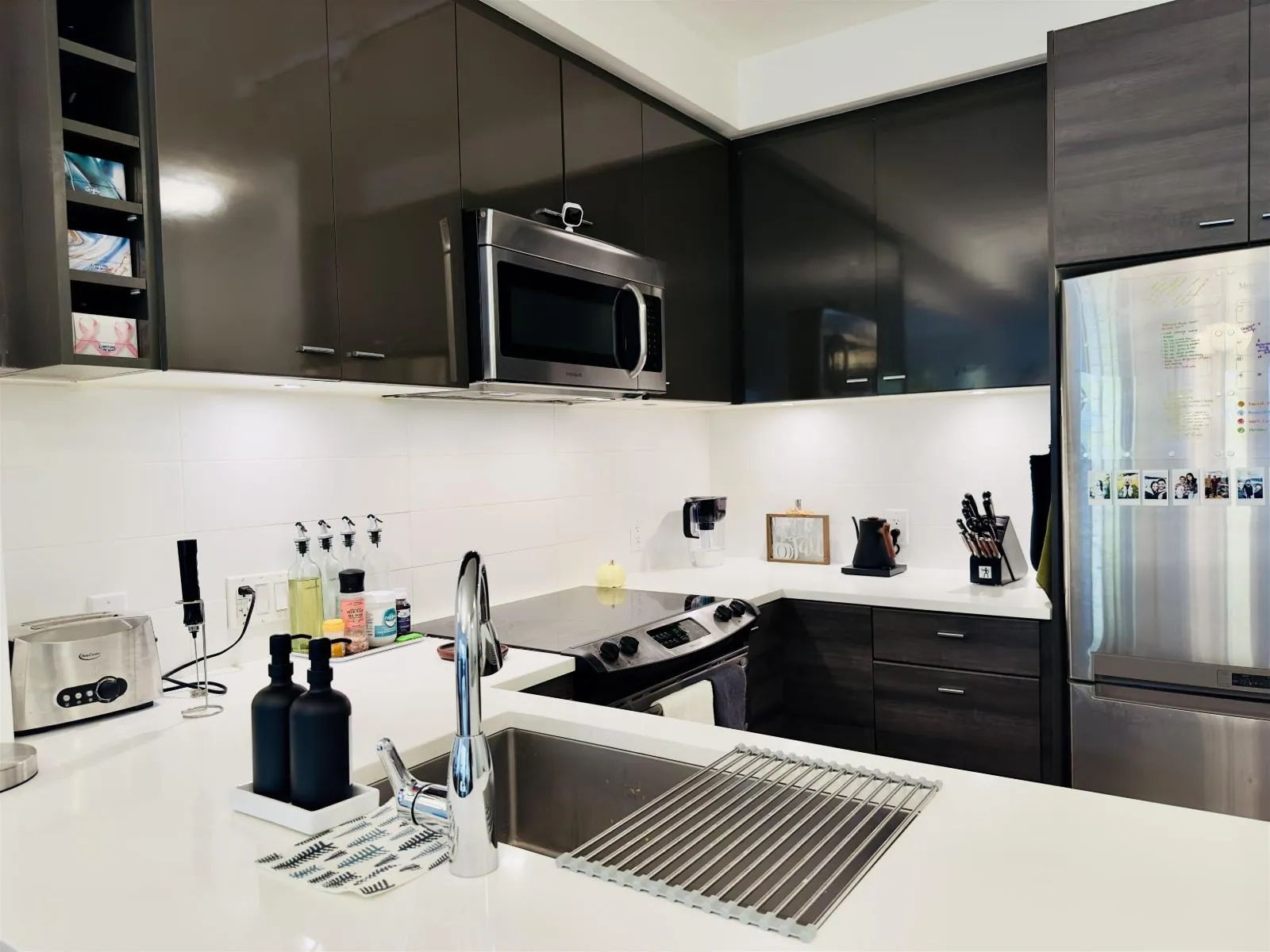 Experience spacious living in the heart of Surrey at The Verve! This bright 1-Bed + Large Den (719sqft) features 9' ceilings, a modern kitchen with quartz counters, full-size stainless steel appliances, large island with breakfast bar, and under-cabinet lighting. The oversized bedroom includes his & her closets and dual-access bathroom. Enjoy in-suite laundry and a west-facing balcony perfect for relaxing or BBQs. Includes 1 underground parking & storage locker. Building amenities: gym, yoga, billiards lounge, guest suite, and secure entry. Steps to King George SkyTrain, SFU, Central City Mall, parks, hospitals & restaurants-must see! Open House: Sat. & Sun (Nov.15&16) 2-4pm. (id:27476)