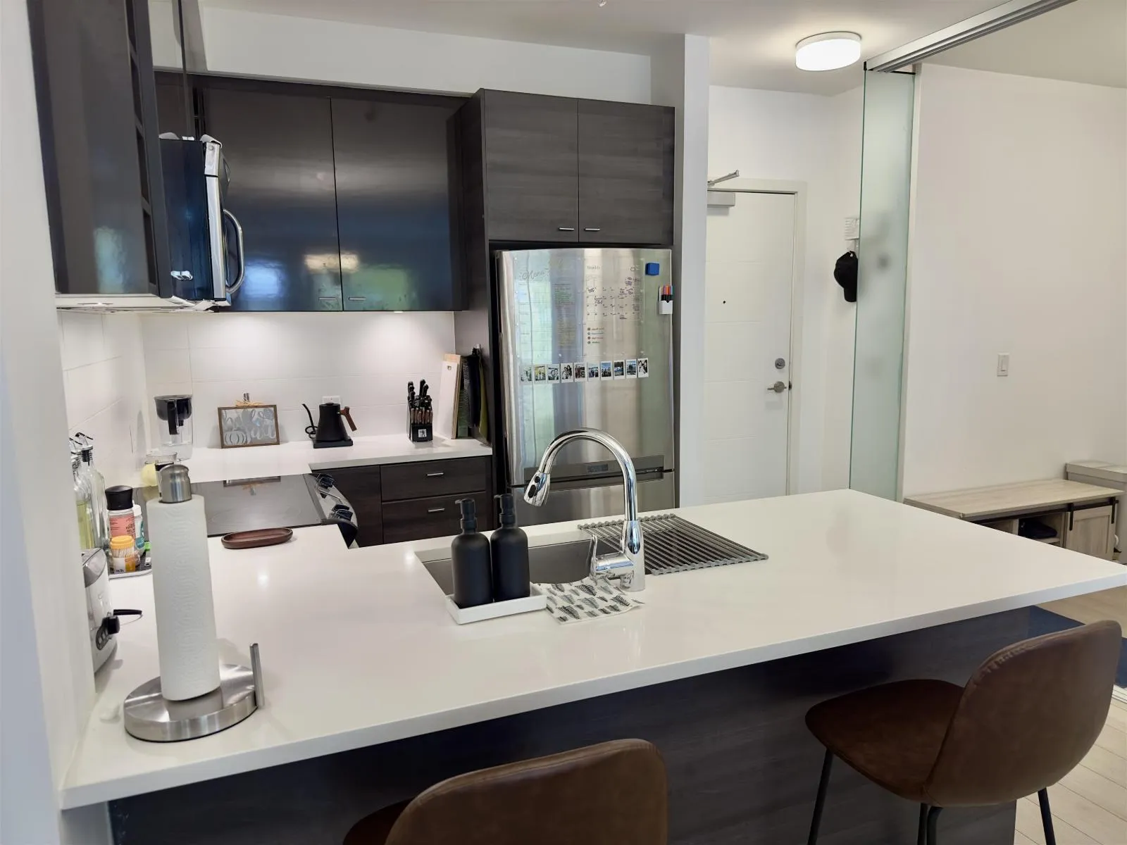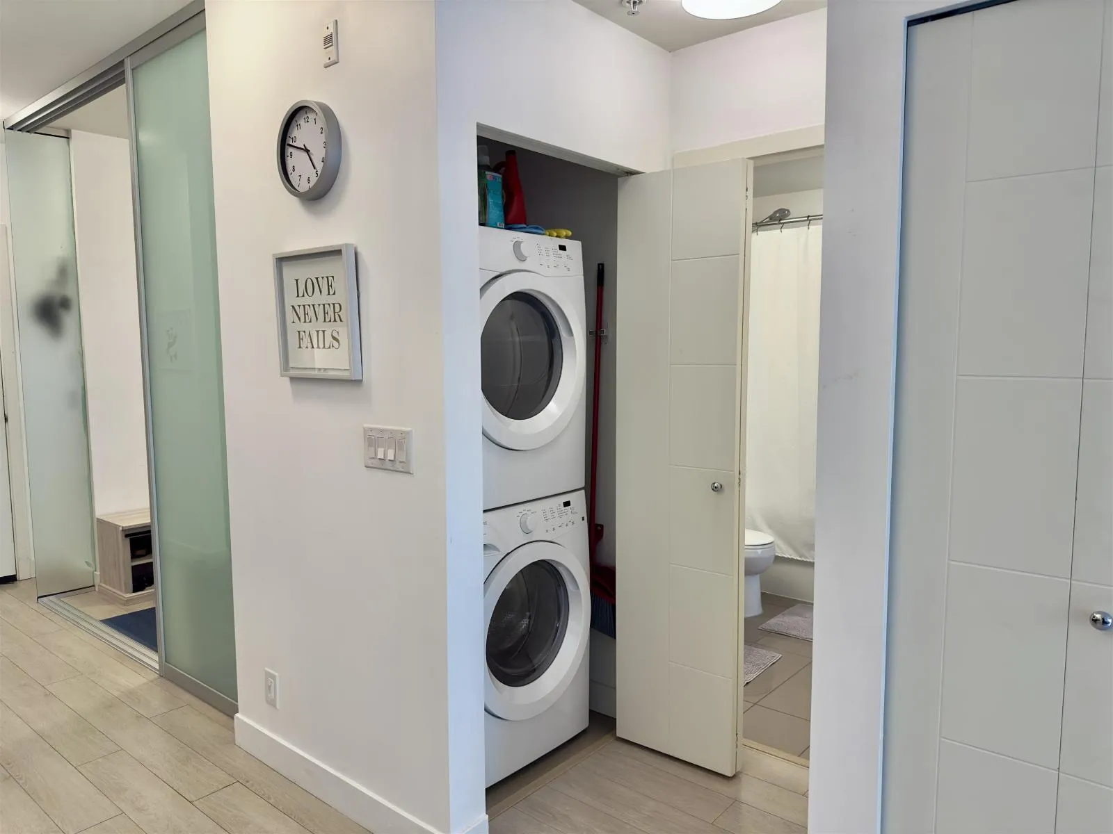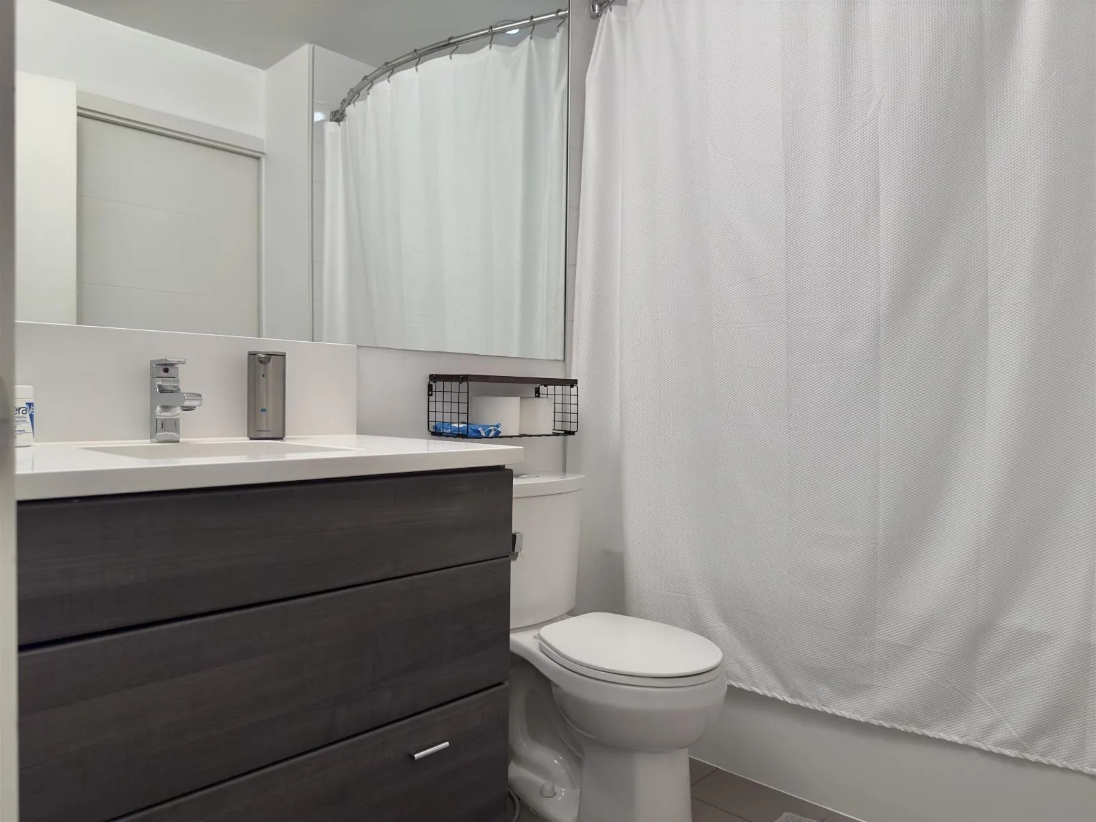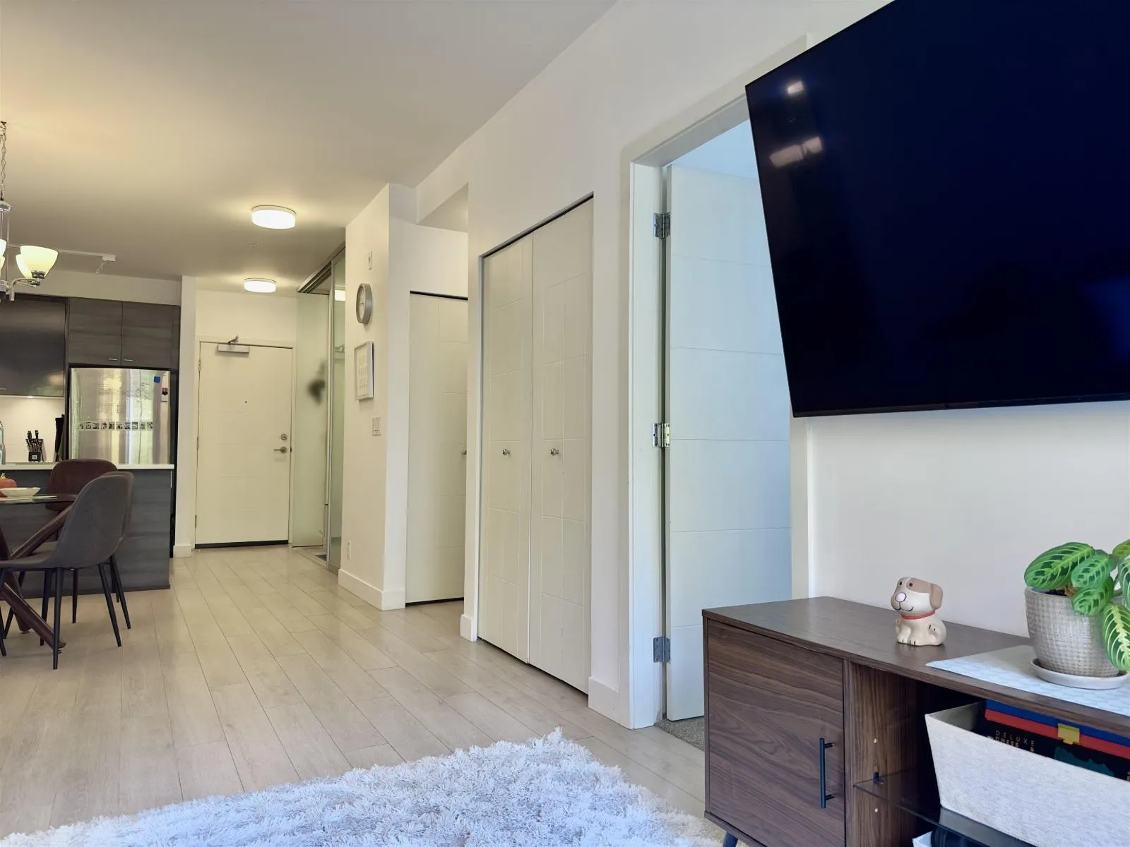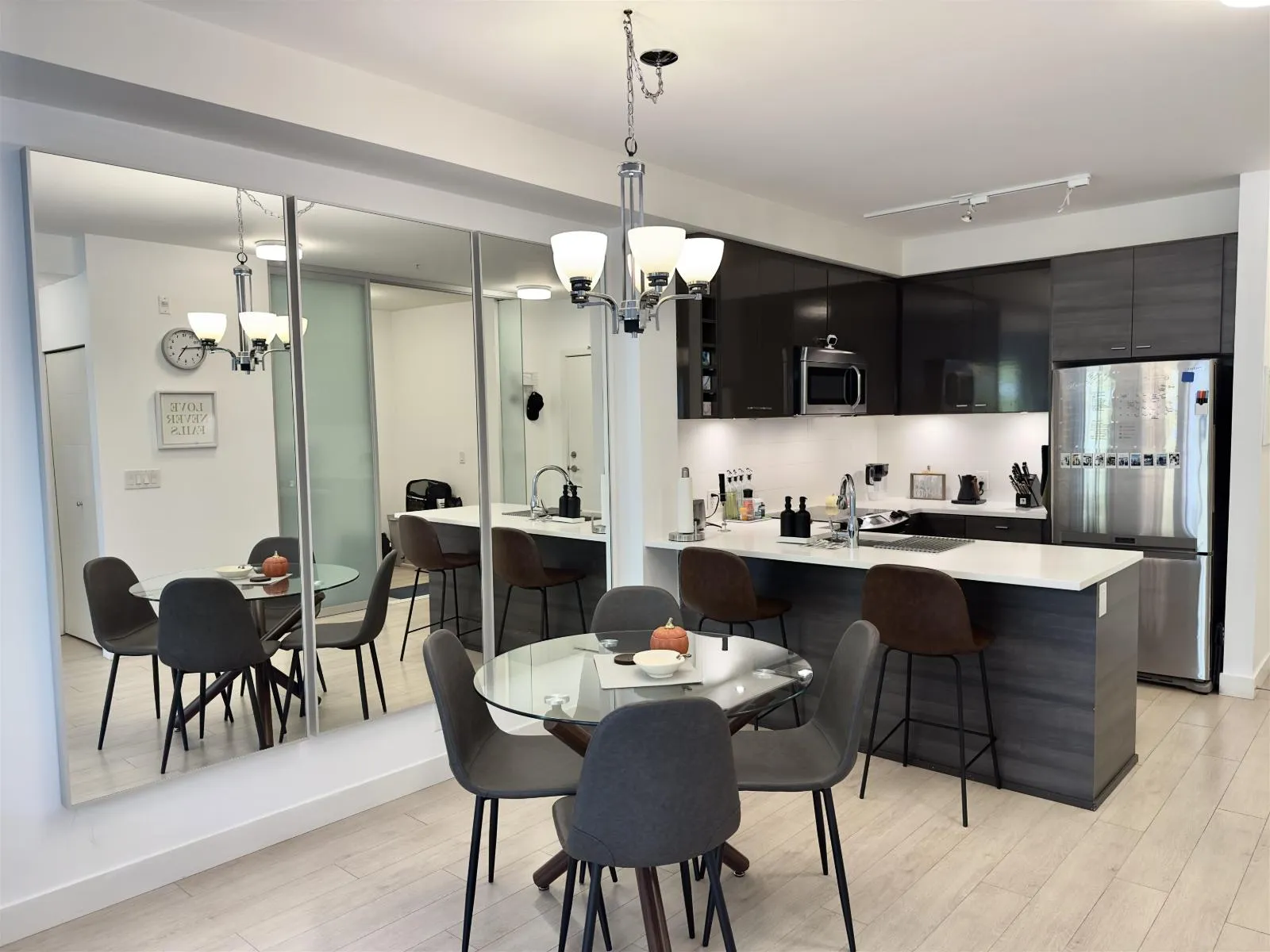 Experience spacious living in the heart of Surrey at The Verve! This bright 1-Bed + Large Den (719sqft) features 9' ceilings, a modern kitchen with quartz counters, full-size stainless steel appliances, large island with breakfast bar, and under-cabinet lighting. The oversized bedroom includes his & her closets and dual-access bathroom. Enjoy in-suite laundry and a west-facing balcony perfect for relaxing or BBQs. Includes 1 underground parking & storage locker. Building amenities: gym, yoga, billiards lounge, guest suite, and secure entry. Steps to King George SkyTrain, SFU, Central City Mall, parks, hospitals & restaurants-must see! Open House: Sat. & Sun (Nov.15&16) 2-4pm. (id:27476)