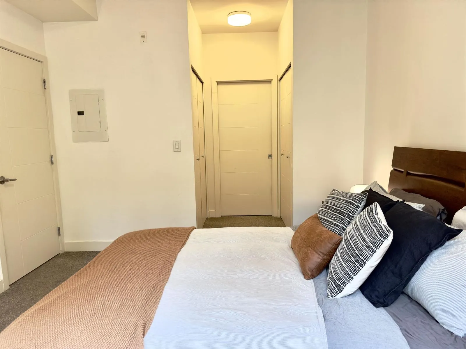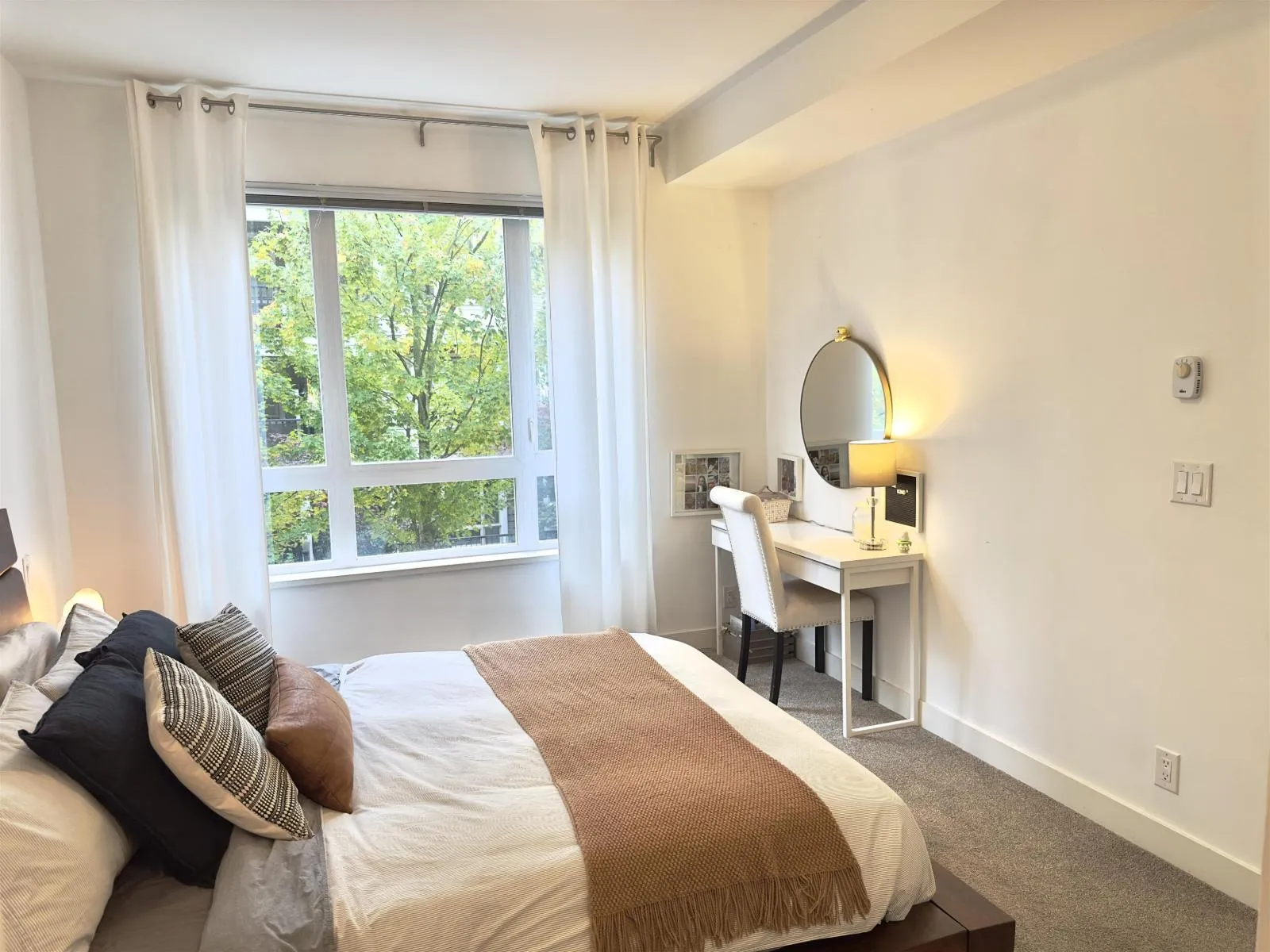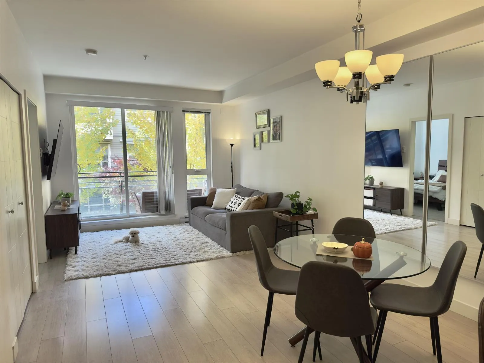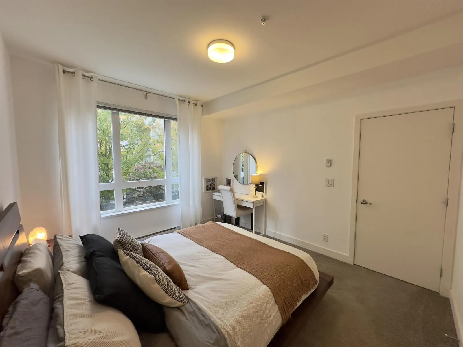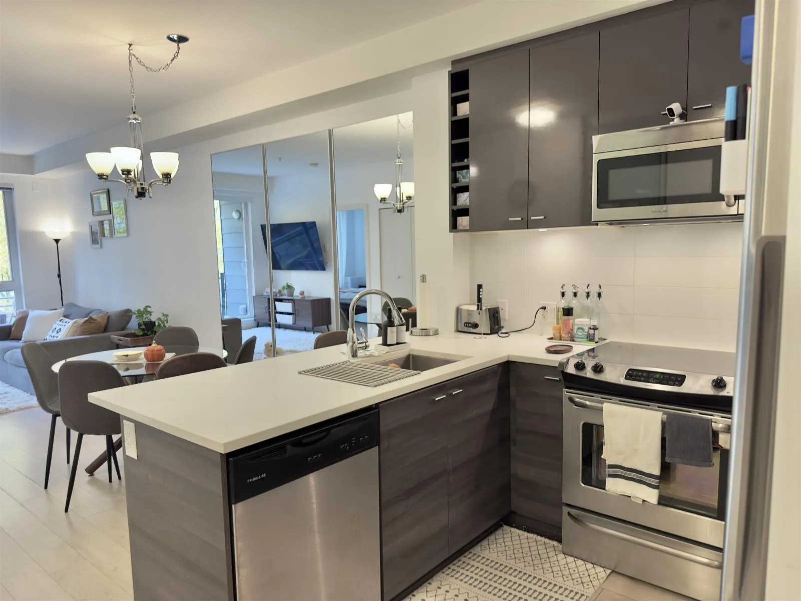 Experience spacious living in the heart of Surrey at The Verve! This bright 1-Bed + Large Den (719sqft) features 9' ceilings, a modern kitchen with quartz counters, full-size stainless steel appliances, large island with breakfast bar, and under-cabinet lighting. The oversized bedroom includes his & her closets and dual-access bathroom. Enjoy in-suite laundry and a west-facing balcony perfect for relaxing or BBQs. Includes 1 underground parking & storage locker. Building amenities: gym, yoga, billiards lounge, guest suite, and secure entry. Steps to King George SkyTrain, SFU, Central City Mall, parks, hospitals & restaurants-must see! Open House: Sat. & Sun (Nov.15&16) 2-4pm. (id:27476)
