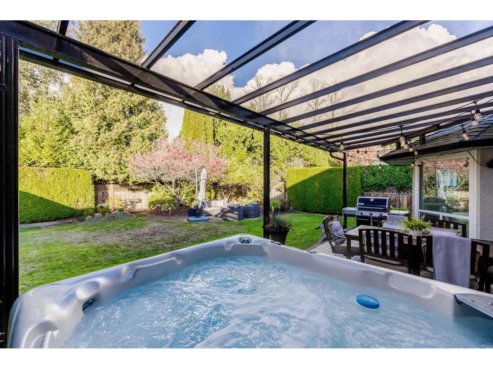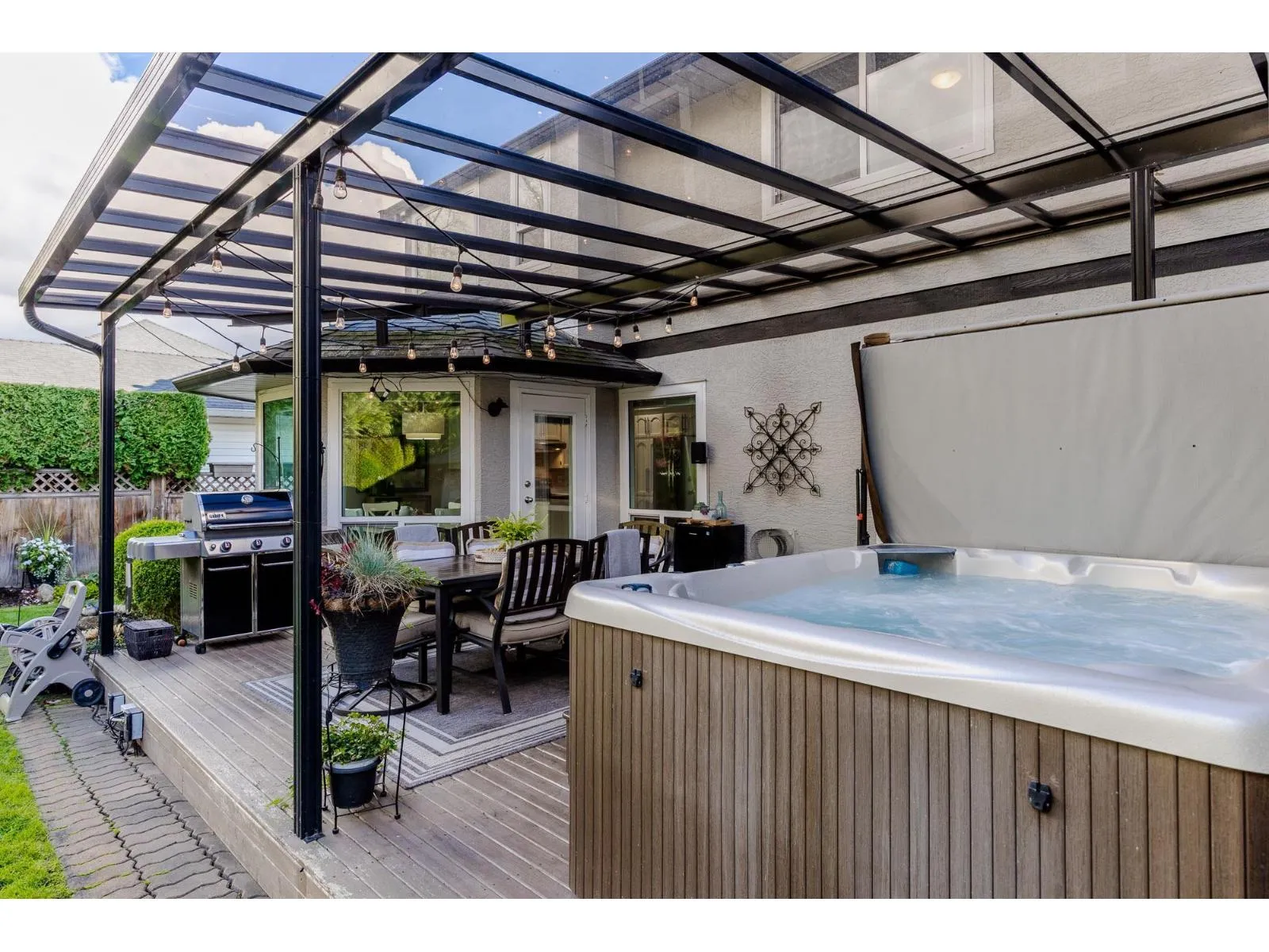 This fabulous home is positioned in a fantastic location in Cloverdale~ Eagle Crest, & is on a great street with the best neighbours! Offering 2337 sq ft 4 bdrms, 3 bthrms & a den it is move in ready & has been lovingly maintained. Main floor offers formal dining & living rm with vaulted ceiling. Kitchen opens to family rm with gas fireplace, & there is a convenient 2 pc powder rm! Up boasts a large primary retreat with beautiful 4 pc ensuite & walk in closet. Massive 4th bdrm could be a games/flex space! If your perfect evening involves relaxing in a hot tub looking out at your gorgeous landscaped private yard this home is for you! The covered deck makes year round barbequing easy & it backs onto a park for ultimate privacy. Updates include windows, pex, roof, furnace, h/w/t, A/C & more! (id:27476)