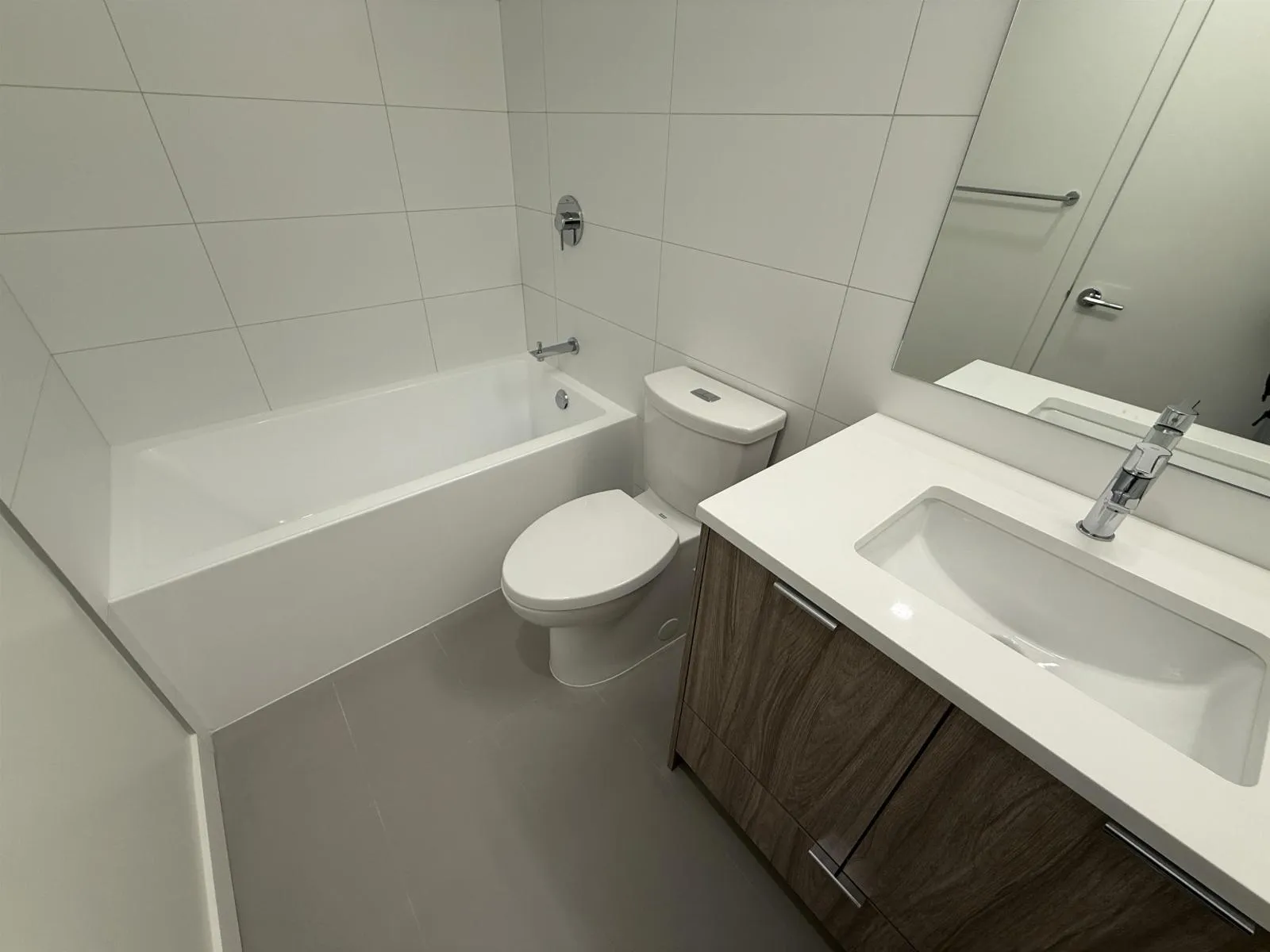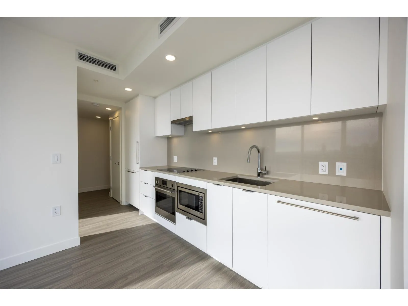 Welcome to Flamingo One, the highly anticipated new tower in Surrey Central! This bright 2-bedroom, 2-bathroom home (Unit 2302) offers 779 sqft of stylish interior space plus a 104 sqft balcony. The modern kitchen is equipped with premium integrated appliances, quad countertops, and sleek flat-panel cabinetry, complemented by wide plank flooring throughout. Includes one parking stall with EV charger and one storage locker. Residents enjoy outstanding amenities including a fireside lounge, BBQ courtyard, party room with kitchen, hobby room, fully equipped gym, theatre, playground, and dog park. Conveniently located just a 5-minute walk to Gateway SkyTrain, shops, and restaurants - a perfect blend of comfort, style, and convenience. (id:27476)
