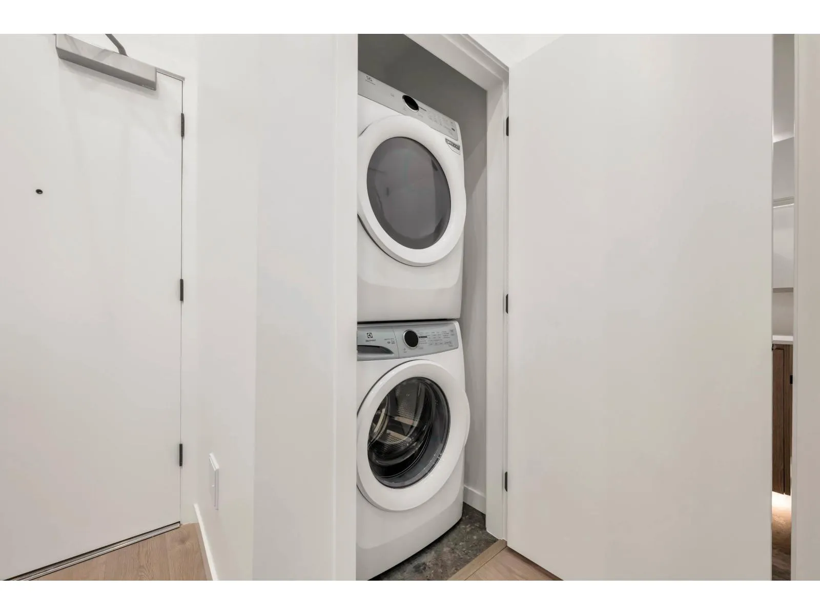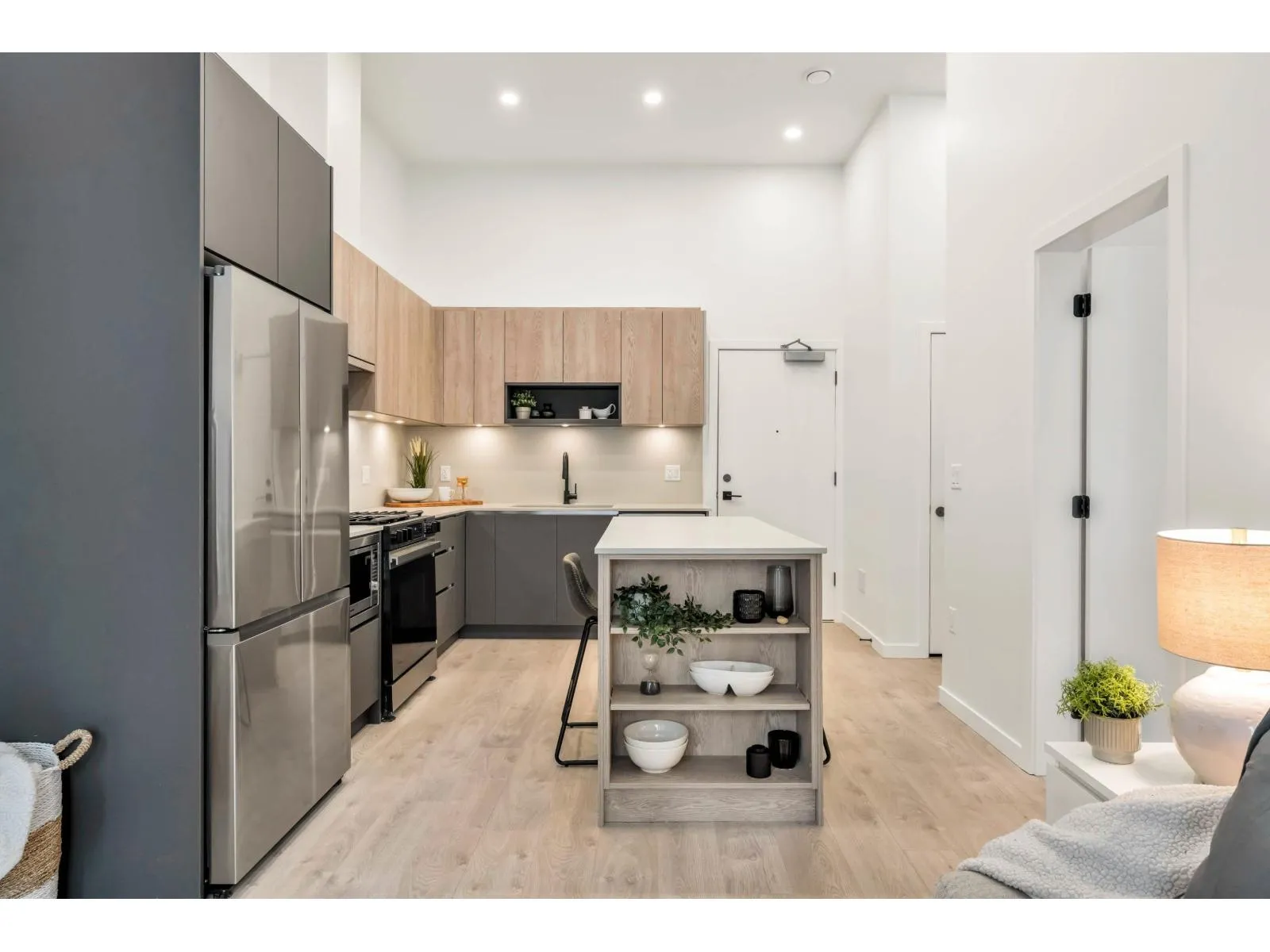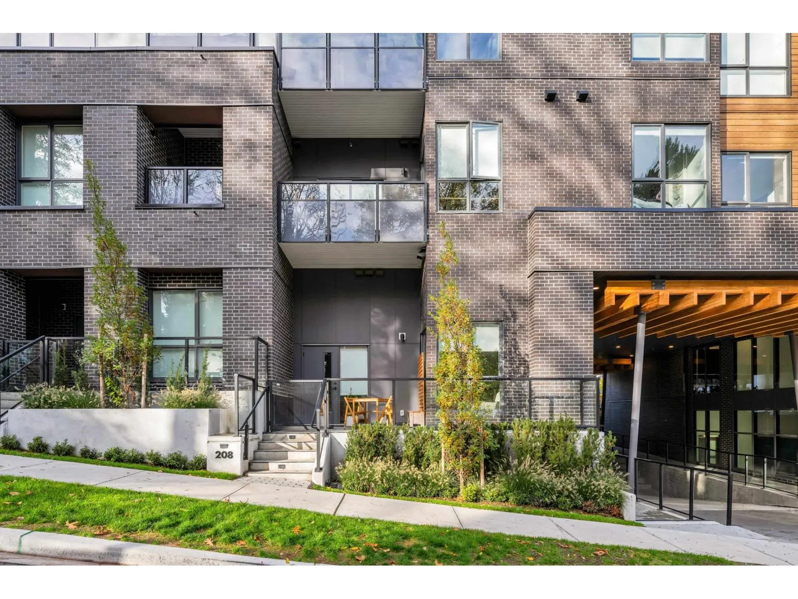 Harlo is in a prime location with parks, shopping & all amenities outside your door. This upscale GROUND level CORNER 1 bdrm, 1bthrm unit has its own separate entrance/access to the street! Boasting a modern design, high ceilings (12 ft main,14 ft. bdrm) beautifully finished & like new. Enjoy the open layout with a large outdoor patio & south facing so nice & bright! Kitchen features high-end S/S appliances incl gas stove, quartz, & an integrated pantry. There is in suite laundry, a spacious bdrm, and a lavish 4 pc bthrm. Elevated amenities including a rooftop terrace with stunning mountain views, children's play area, co-working space, gym, Peloton rm, lounge & more! 1 parking spot and 1 storage locker on same floor. Future Skytrain will make this a great investment & commuting a breeze! (id:27476)