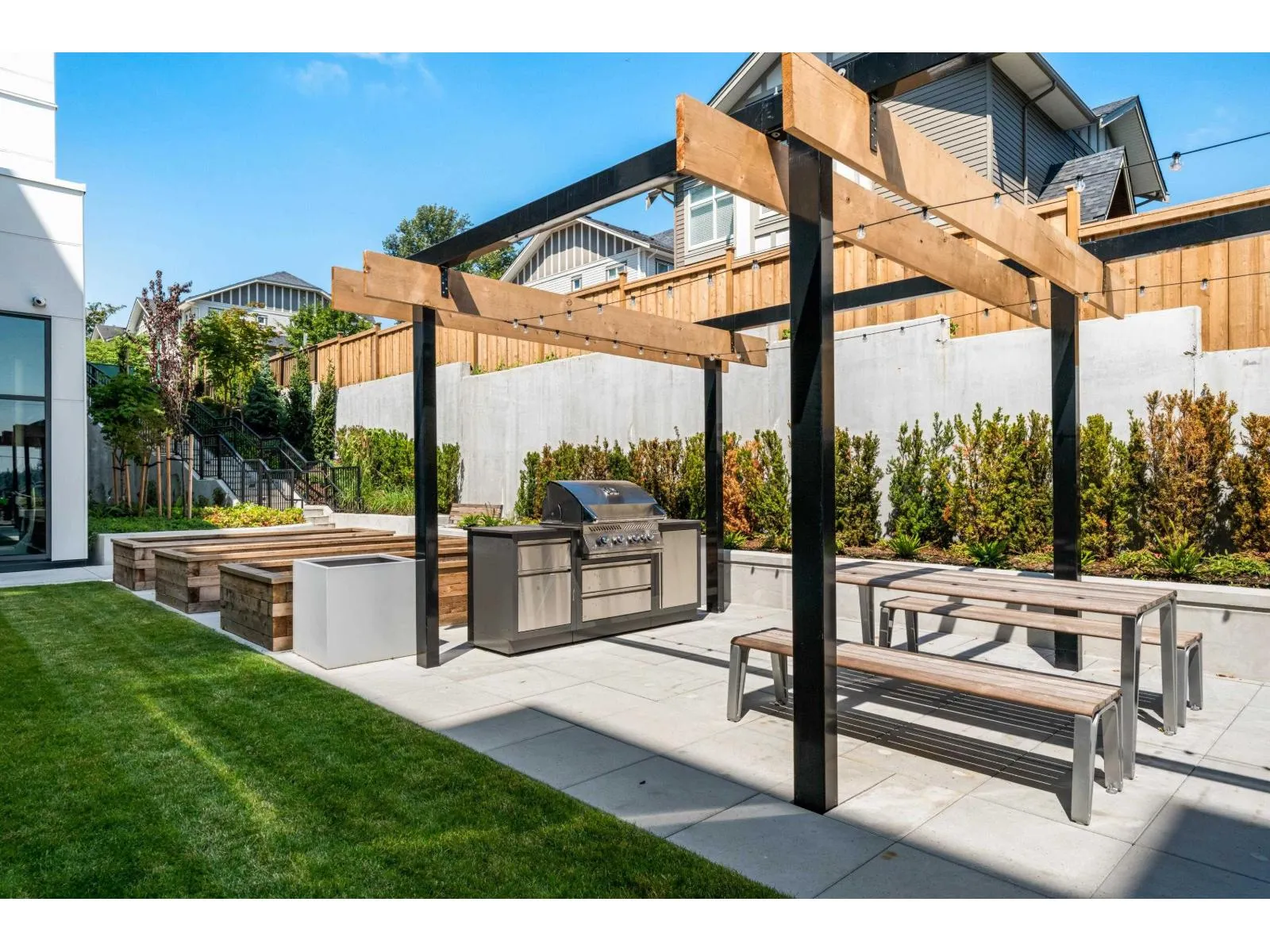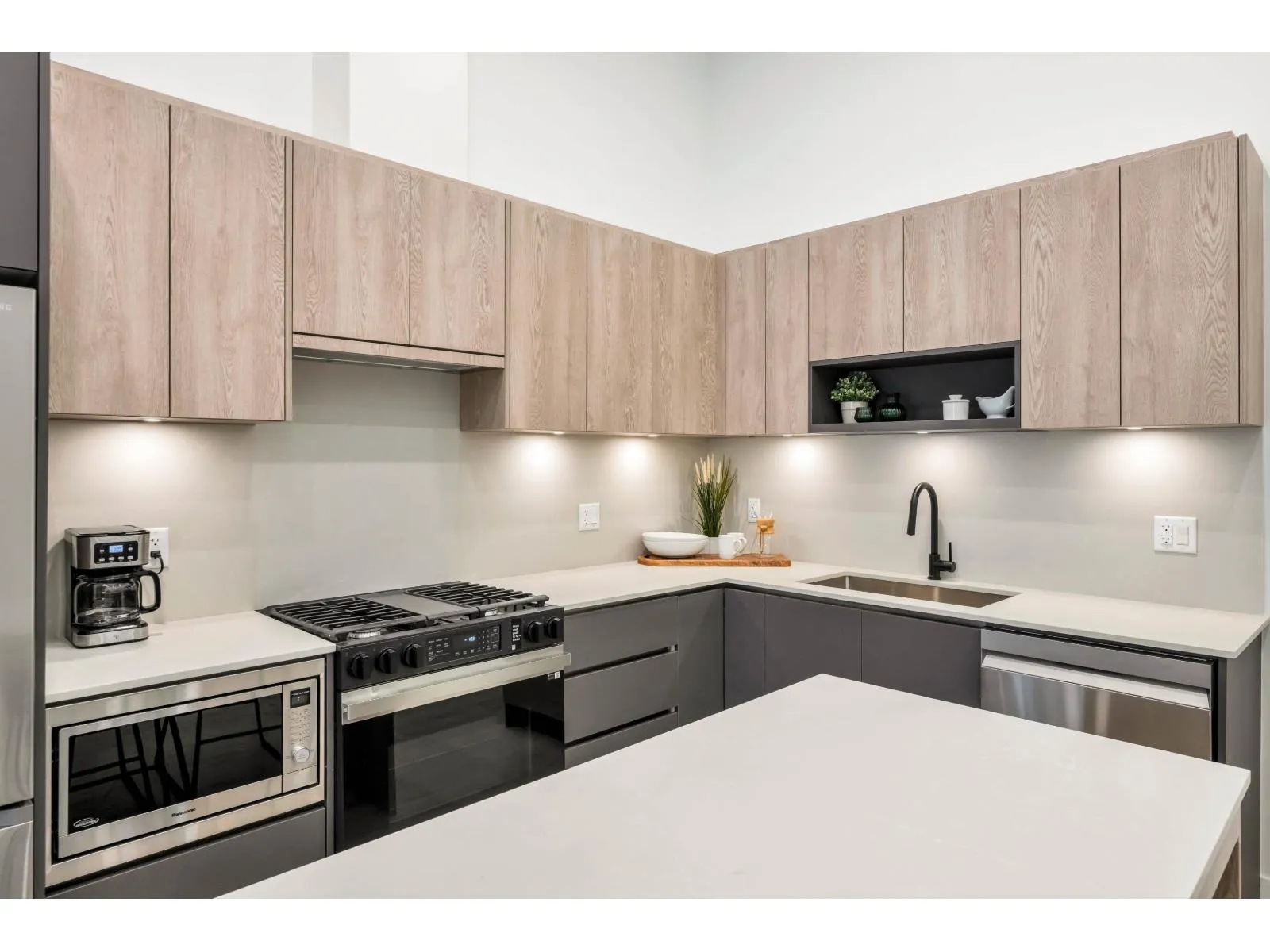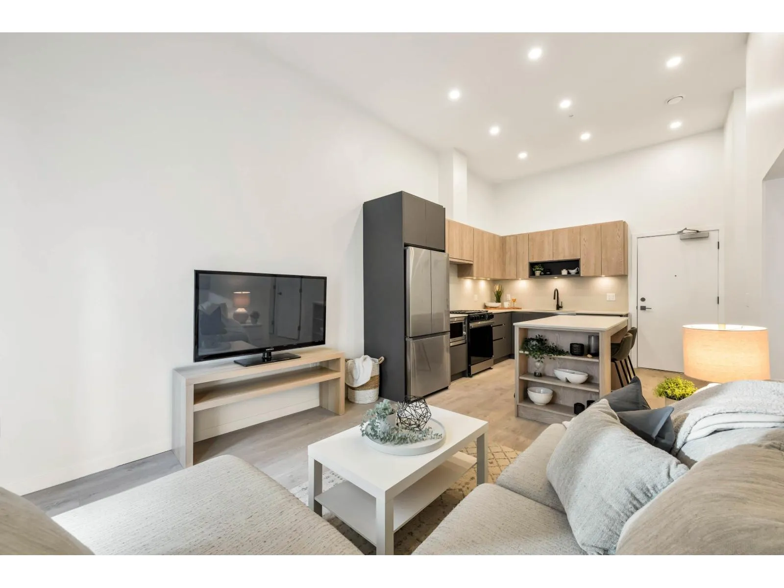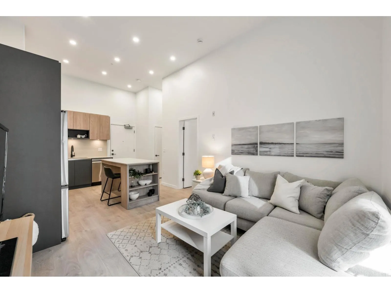 Harlo is in a prime location with parks, shopping & all amenities outside your door. This upscale GROUND level CORNER 1 bdrm, 1bthrm unit has its own separate entrance/access to the street! Boasting a modern design, high ceilings (12 ft main,14 ft. bdrm) beautifully finished & like new. Enjoy the open layout with a large outdoor patio & south facing so nice & bright! Kitchen features high-end S/S appliances incl gas stove, quartz, & an integrated pantry. There is in suite laundry, a spacious bdrm, and a lavish 4 pc bthrm. Elevated amenities including a rooftop terrace with stunning mountain views, children's play area, co-working space, gym, Peloton rm, lounge & more! 1 parking spot and 1 storage locker on same floor. Future Skytrain will make this a great investment & commuting a breeze! (id:27476)