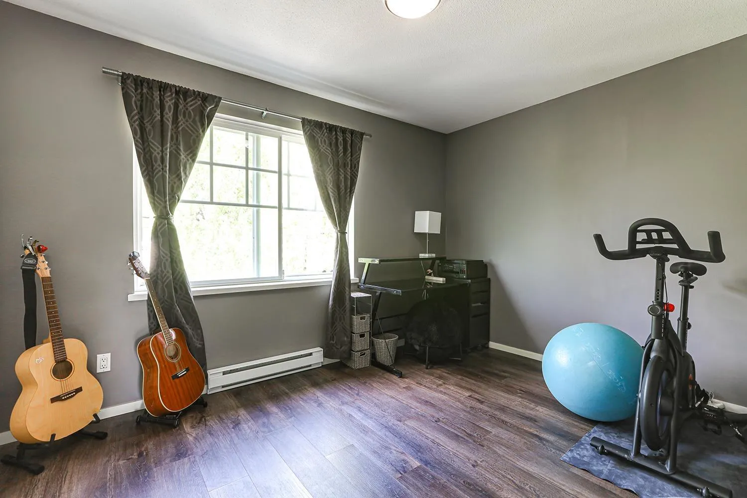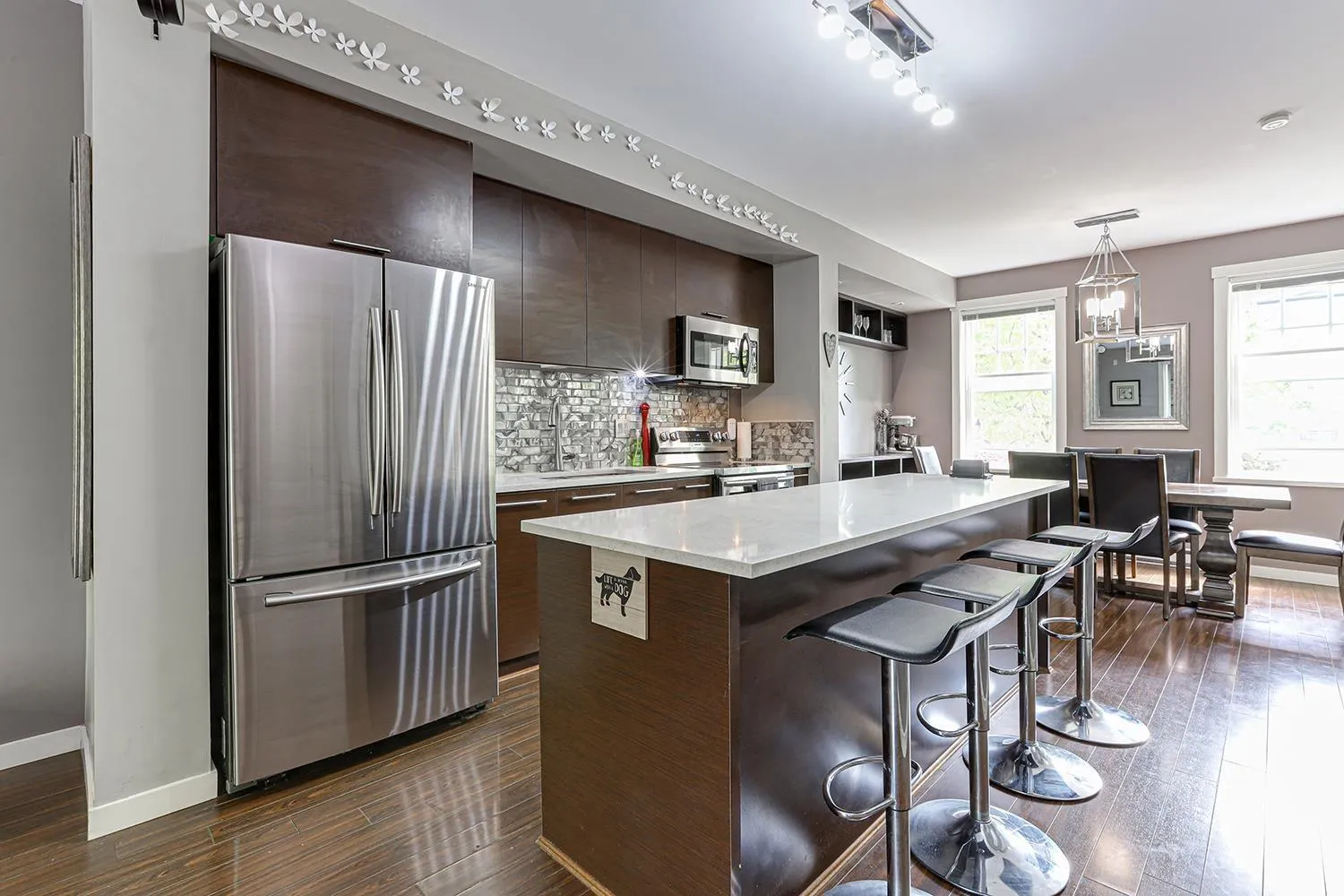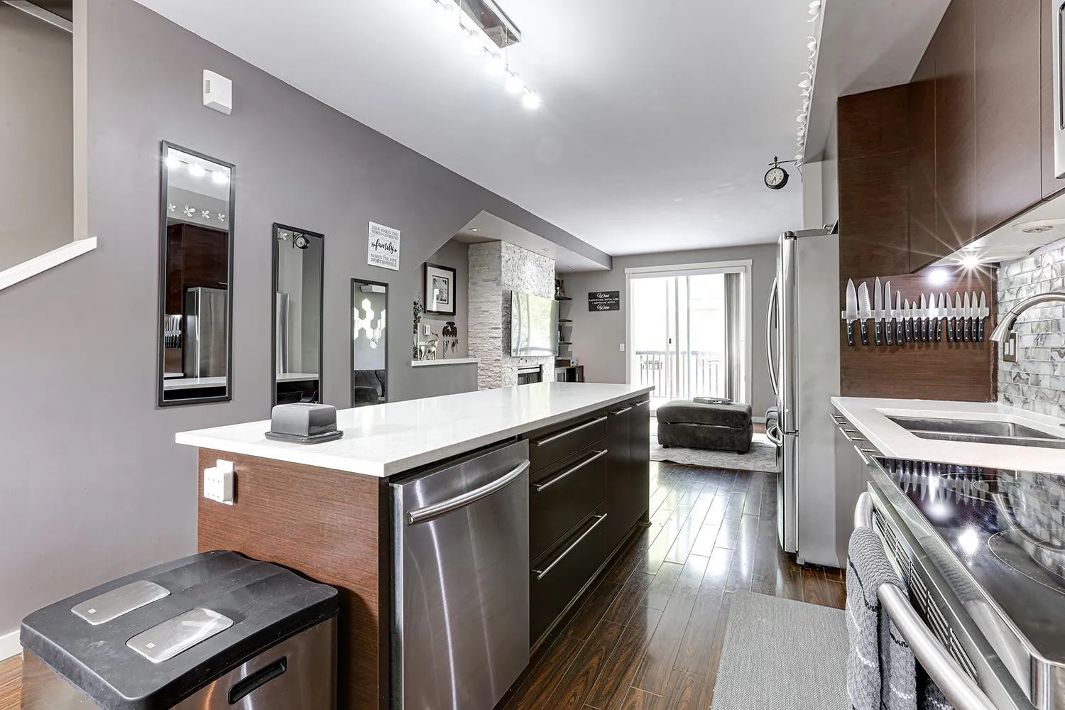 Welcome to Kew, built by MOSAIC! This well taken care of 2bed, 2bath and den townhome boasts modern features including quartz countertops, new stainless steel appliances/WD, hardwood floors. The open floor plan on the 2nd level is perfect for entertaining featuring a good sized deck, living room with an ashler fireplace and built in cabinetry, a large island leading to the dining room that can sit 8. Upstairs there is new vinyl flooring, 2 bathrooms updated with new countertops, the primary bedroom offering an ensuite with plenty of closet space and separated from the primary, the second bedroom is a functional size. On the main floor, there is a den with a window and a closet that has the potential to be a 3rd bedroom. Outside epoxied garage is room for 2nd car. Open House Nov. 8, 1-3. (id:27476)