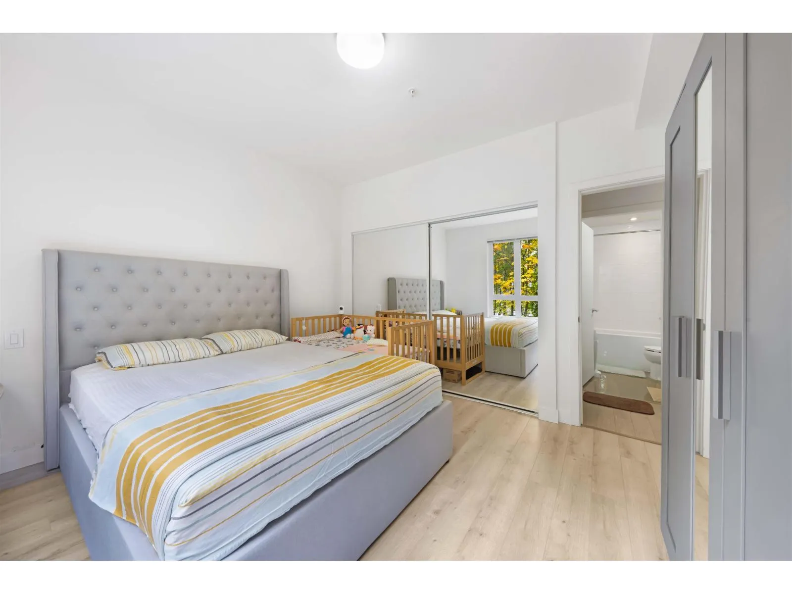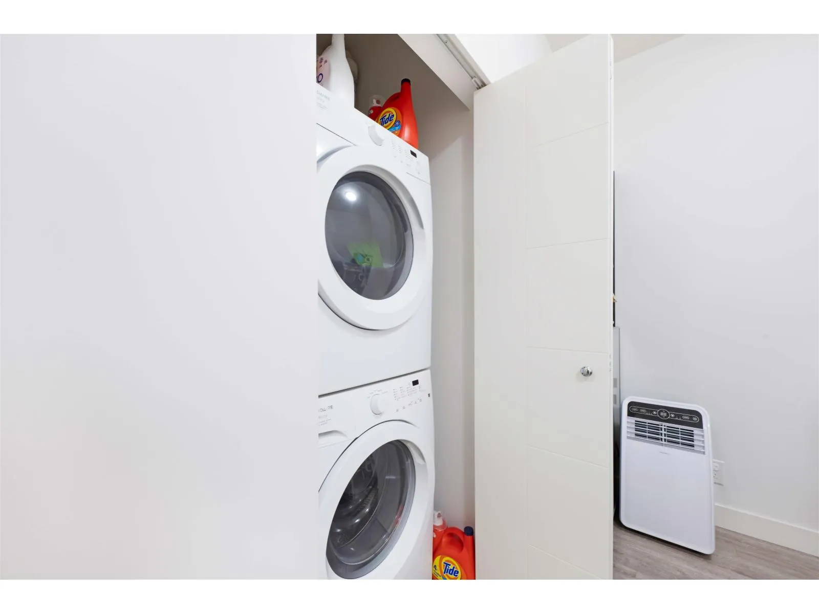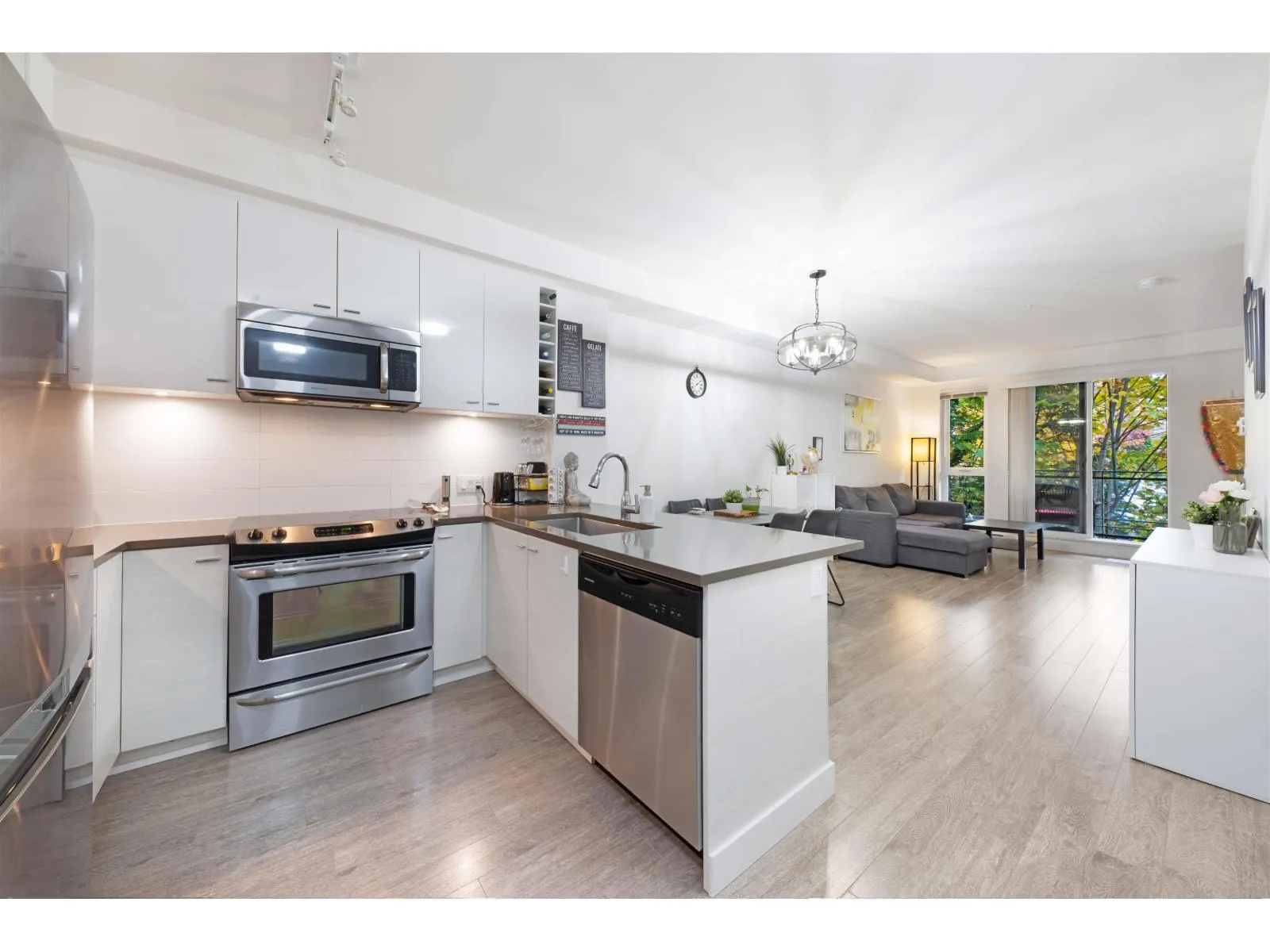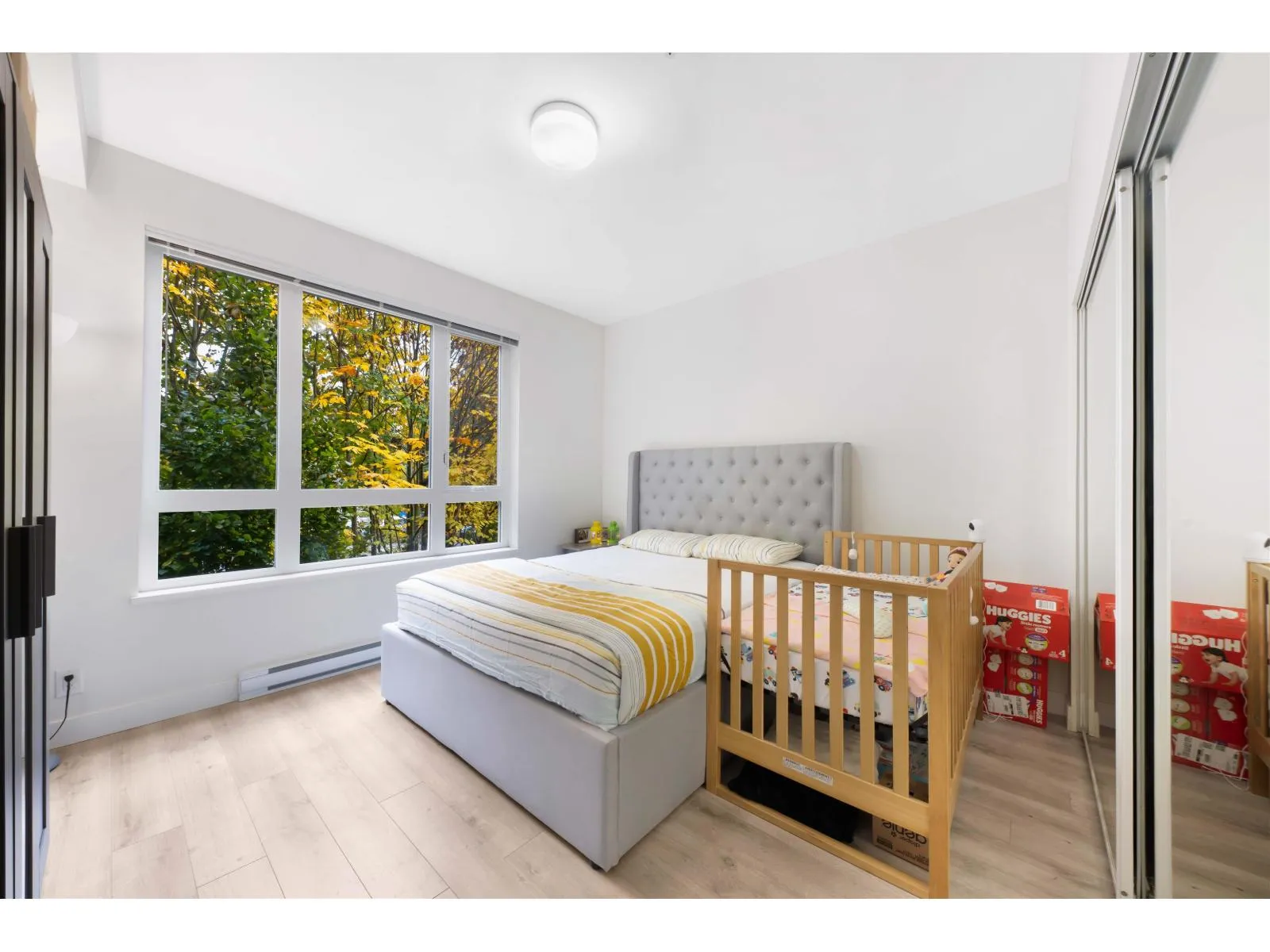 Welcome to VERVE by PORTE! Just minutes from King George Skytrain, King George HUB, Central City Mall, SFU, Future UBC & Surrey Memorial Hospital. This Quiet and Bright 1 Bedroom + Large Den home features 9' ceilings, quartz counter top, stainless steel appliances, soft-close cabinets & a spacious breakfast bar. The den is large enough for an office or guest room. Enjoy a private balcony with a peaceful treed outlook, offering excellent privacy. Includes 1 EV Ready Parking & 1 Locker. Amenities include gym, yoga studio, clubhouse & guest suite. Recently updated laminate flooring in the Primary Bedroom. Rentals & pets allowed-ideal for first-time buyers or investors! A rare opportunity, don't miss out. Open House on November 15th & 16th (Sat & Sun) from 2:00pm to 4:00pm. (id:27476)