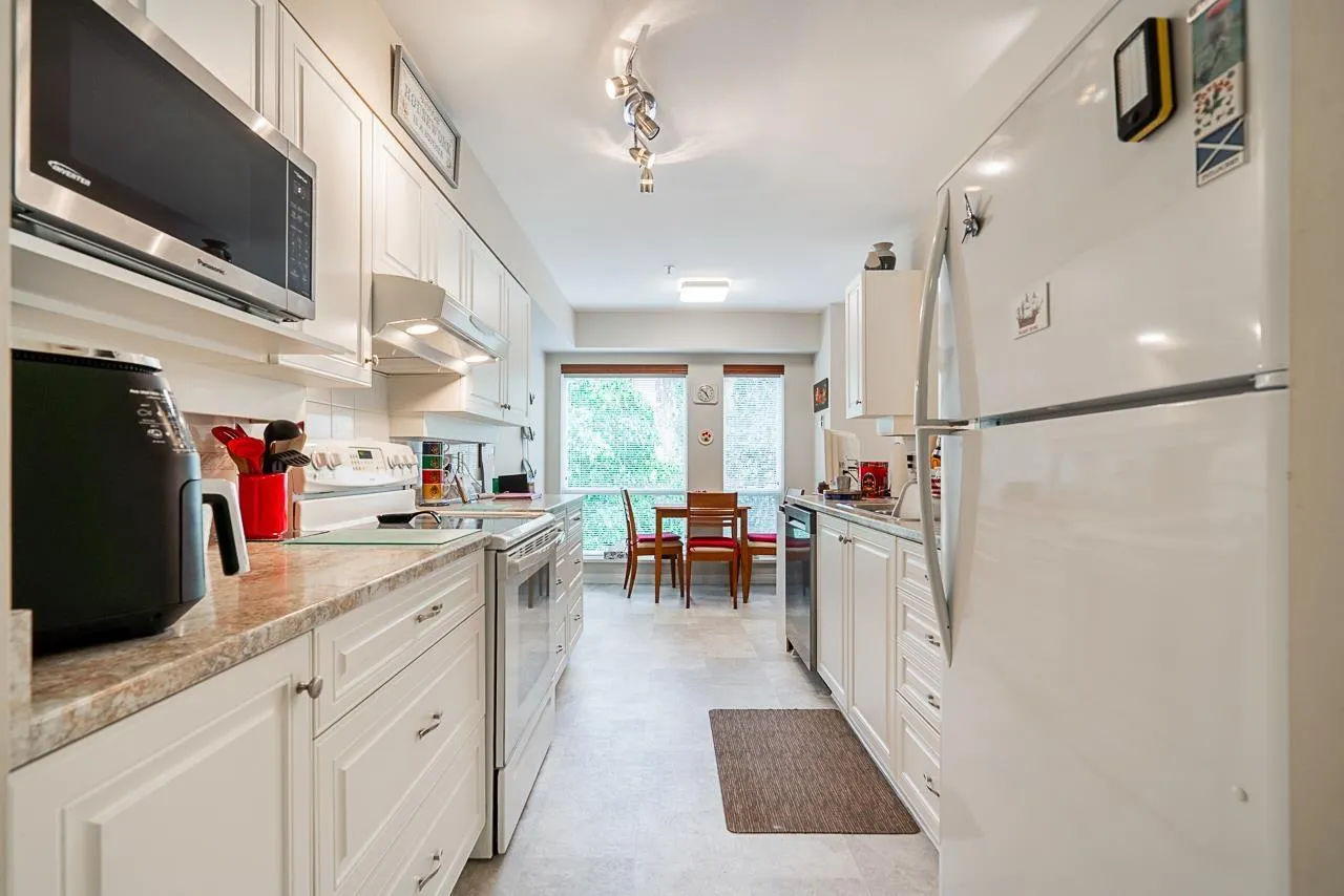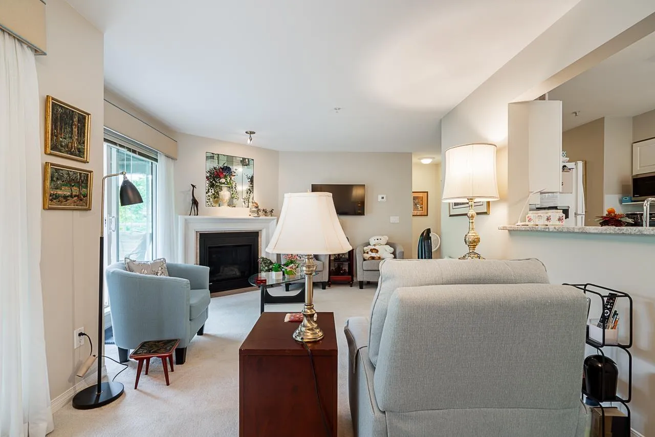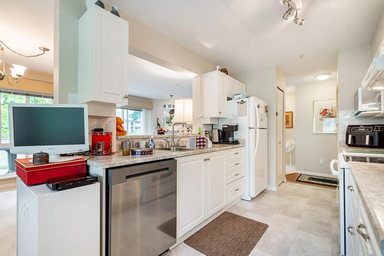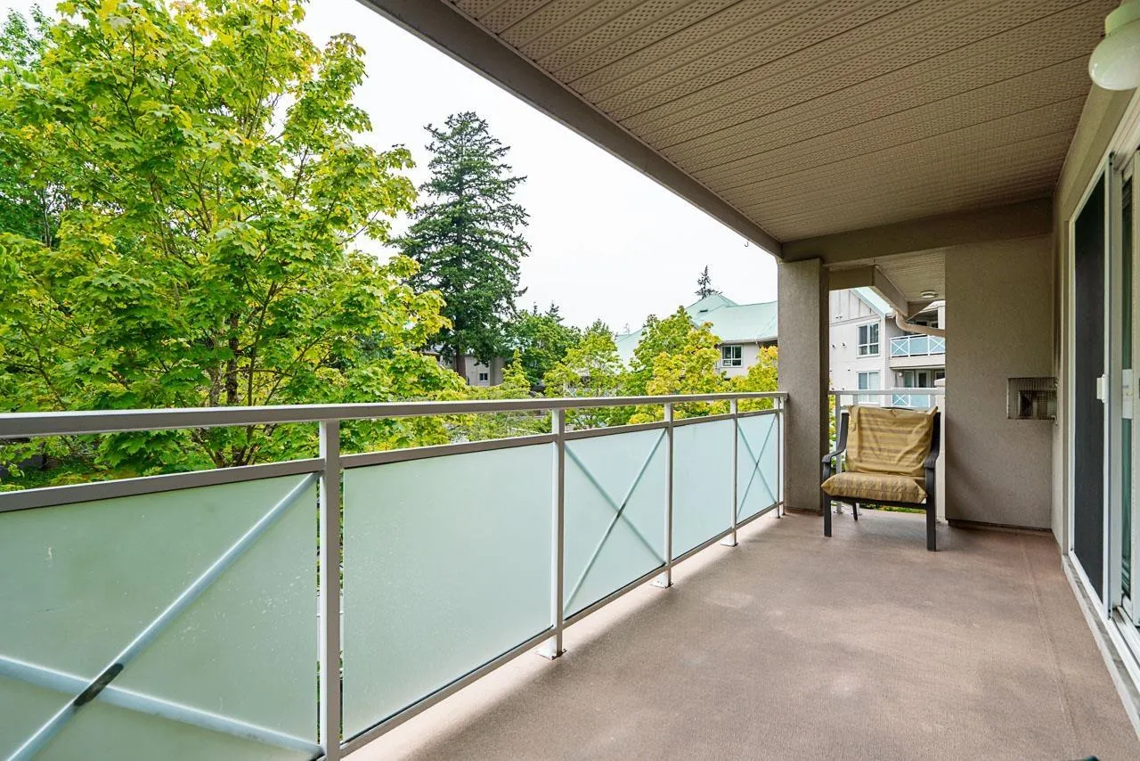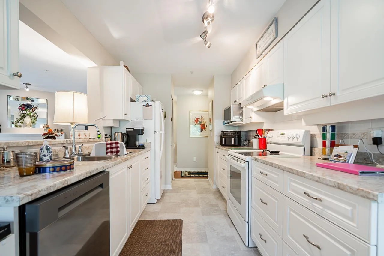 Bright SW facing CORNER with NO UNIT ABOVE! This gorgeous 2bed/2bath feels like a rancher with a sprawling layout featuring XL windows, an abundance of natural light, breakfast nook, tons of closet space and a huge primary bedroom with room for a king bed set. Amazing, central location that is walking distance to all amenities, walking trails and a short drive to WR/Crescent beach with easy access to Hwy99. Enjoy your private, south facing balcony overlooking the quiet courtyard with cherry blossoms in the spring and lush trees in the summer/fall. 2 PARKING spots & 1 storage locker. Strata fee includes gas fireplace & hot water. (id:27476)