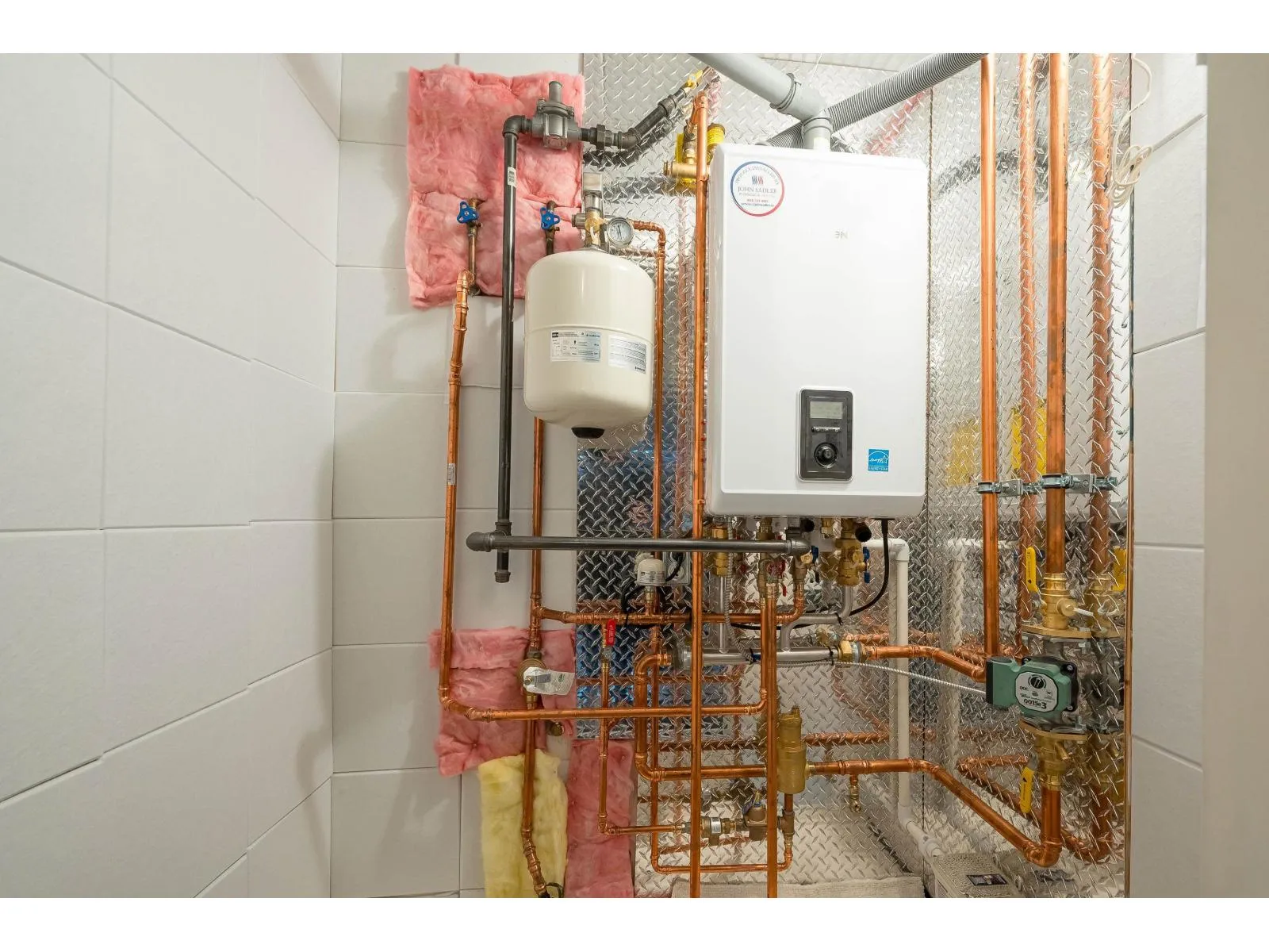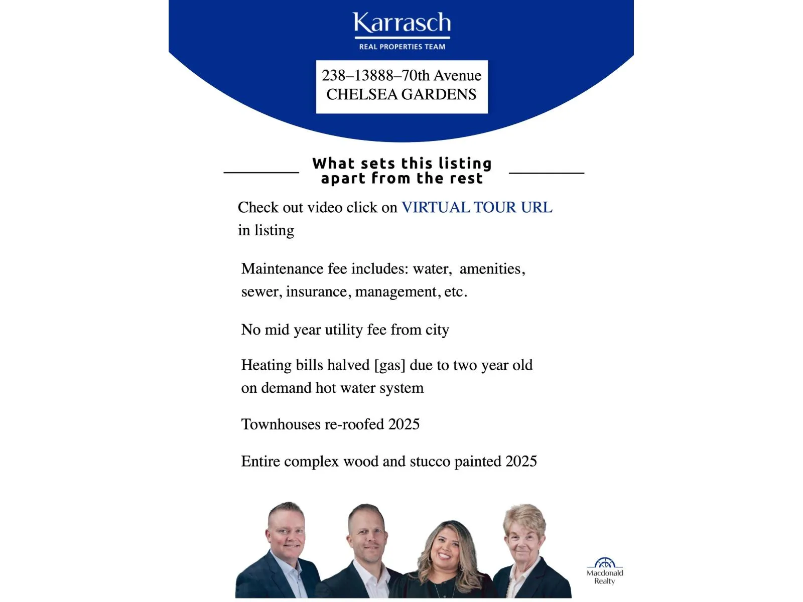 Incredible opportunity - buy this updated 2 bed, 2 full bath Townhouse in Chelsea Gardens could be fully furnished including household appliances and contents of cupboards - EVERYTHING, seller moving to independent living.One occupant must be 55+ and 2 pets allowed max 15" at shoulder. This home is a bright end unit backing onto greenspace where you can hear the peaceful stream. Updates from 2025 include quartz countertops and u/c sinks in kitchen and 2 full baths, S/S fridge, stove, dishwasher, microwave and range hood, washer, dryer, European vinyl planking. $13,000 on demand hot water system and boiler in 2022 cuts heating bills in half. Chelsea Gardens boasts fireside room, English pub, library, gym, woodworking shop, 3 guest suites, hot tub, outdoor pool and RV parking (small fee). (id:27476)