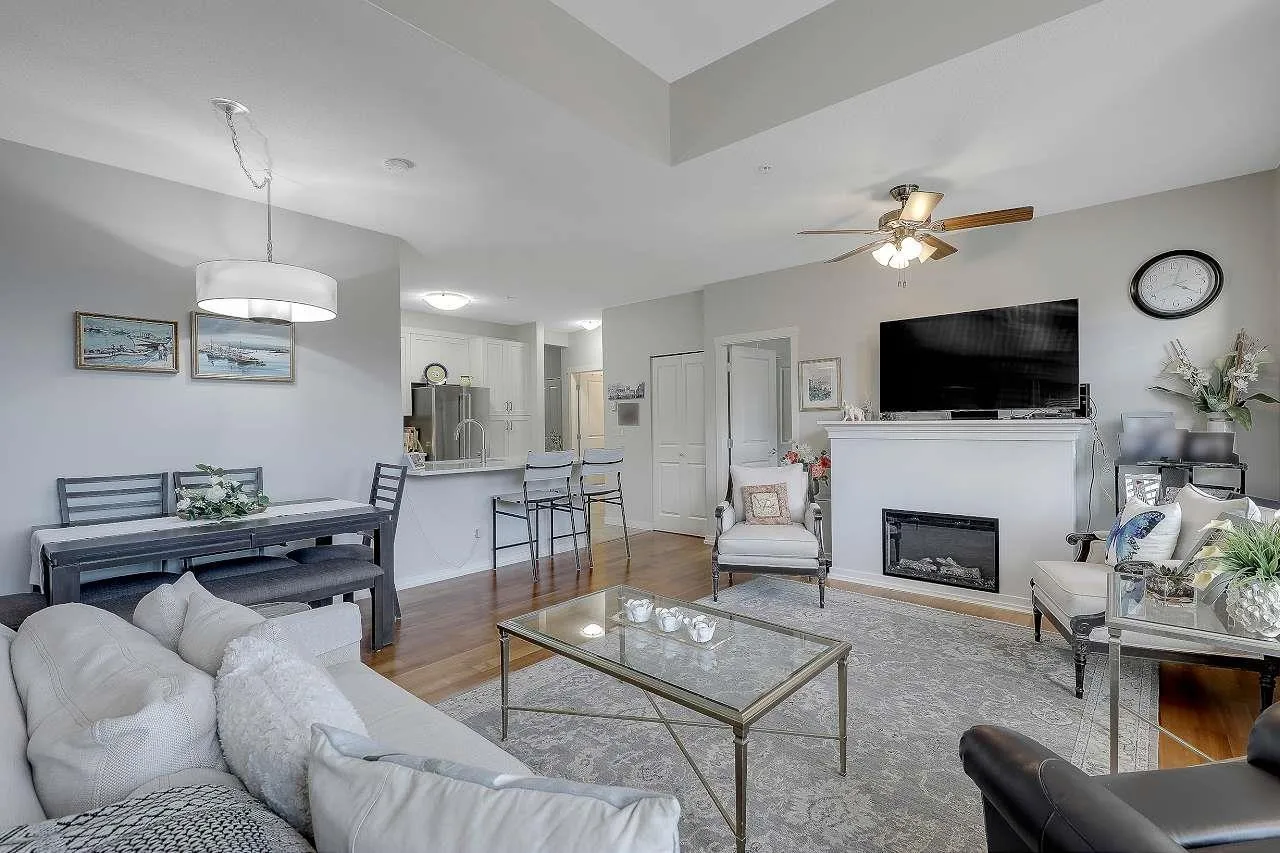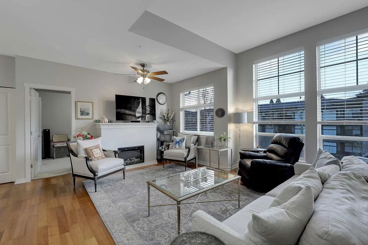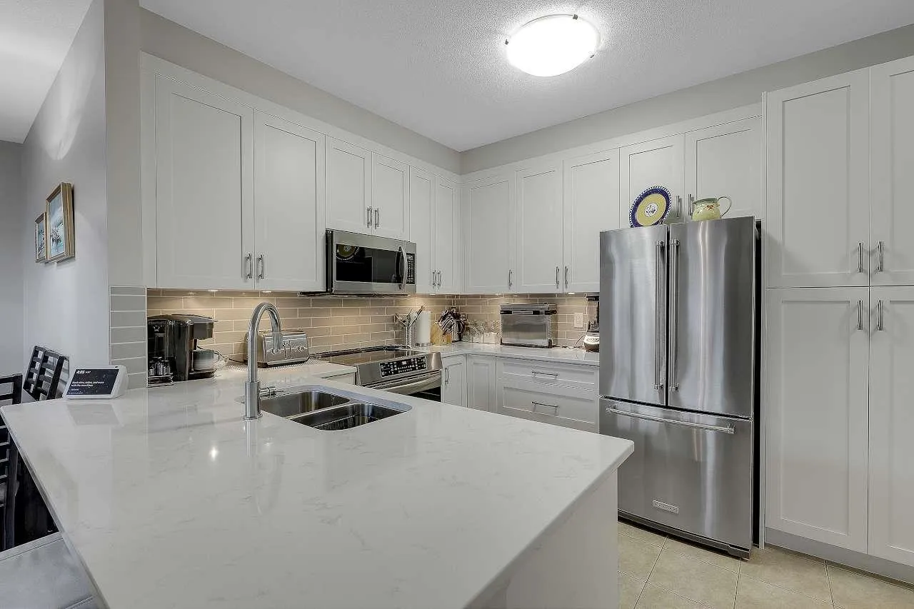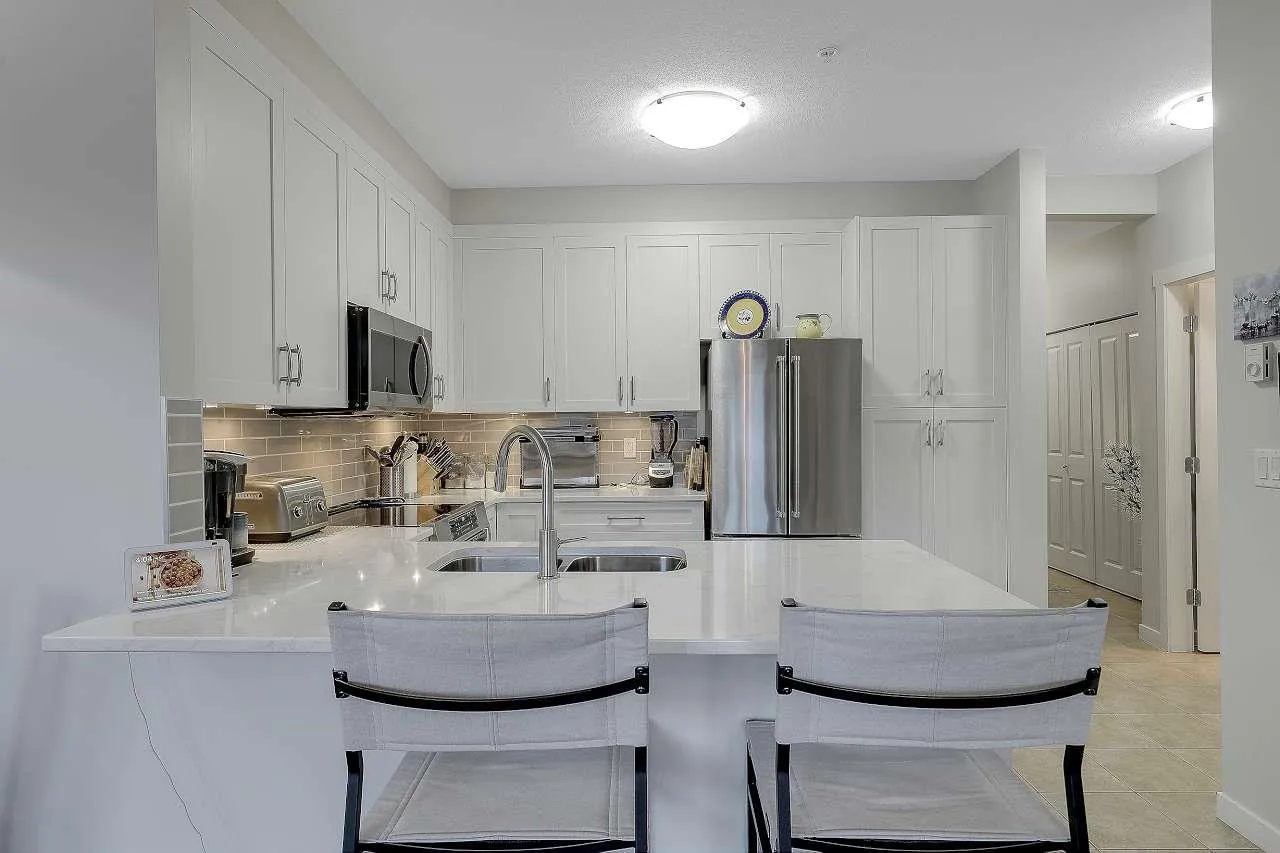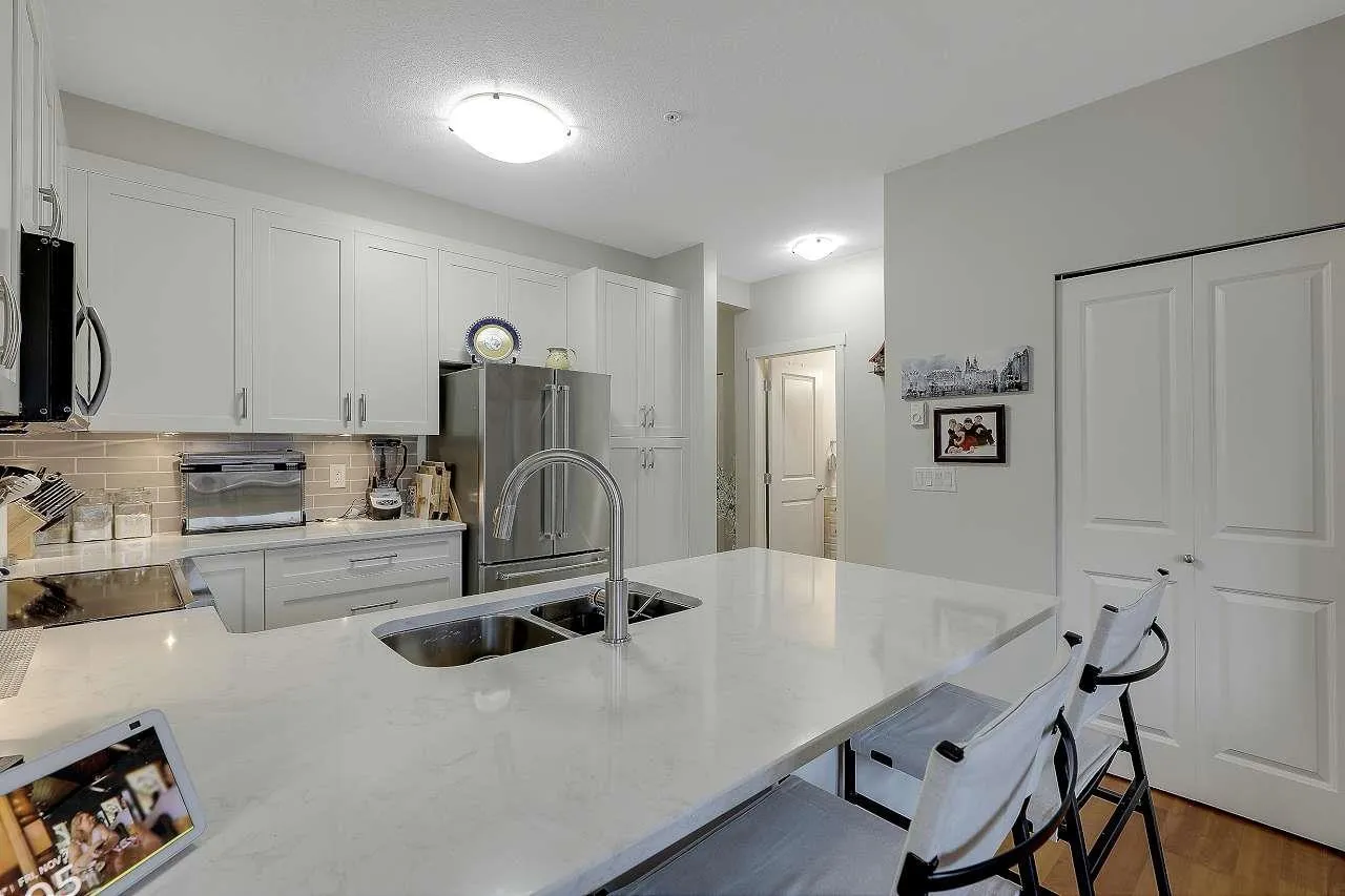Welcome to this beautiful and bright top-floor unit, offering exceptional living space. The Southwest exposure floods the home with natural light, highlighting thoughtful upgrades which include chef-inspired kitchen featuring Quartz counters, backsplash, stainless appliances, a eating bar which flow seamlessly into the open-concept living area with vaulted ceilings, custom closet organizers, top-grade blinds, quartz bathrooms and new toilets, electric fireplace, and a 3yr hot water tank. A spacious primary bedroom with a luxurious ensuite, plus a second full bathrm perfect for guests. This well-maintained boutique building offers just 36 units and includes a rooftop deck , ideal for relaxing or entertaining. Steps from shopping, dining, library, entertainment, bus,2 pets any size. Act fast (id:27476)